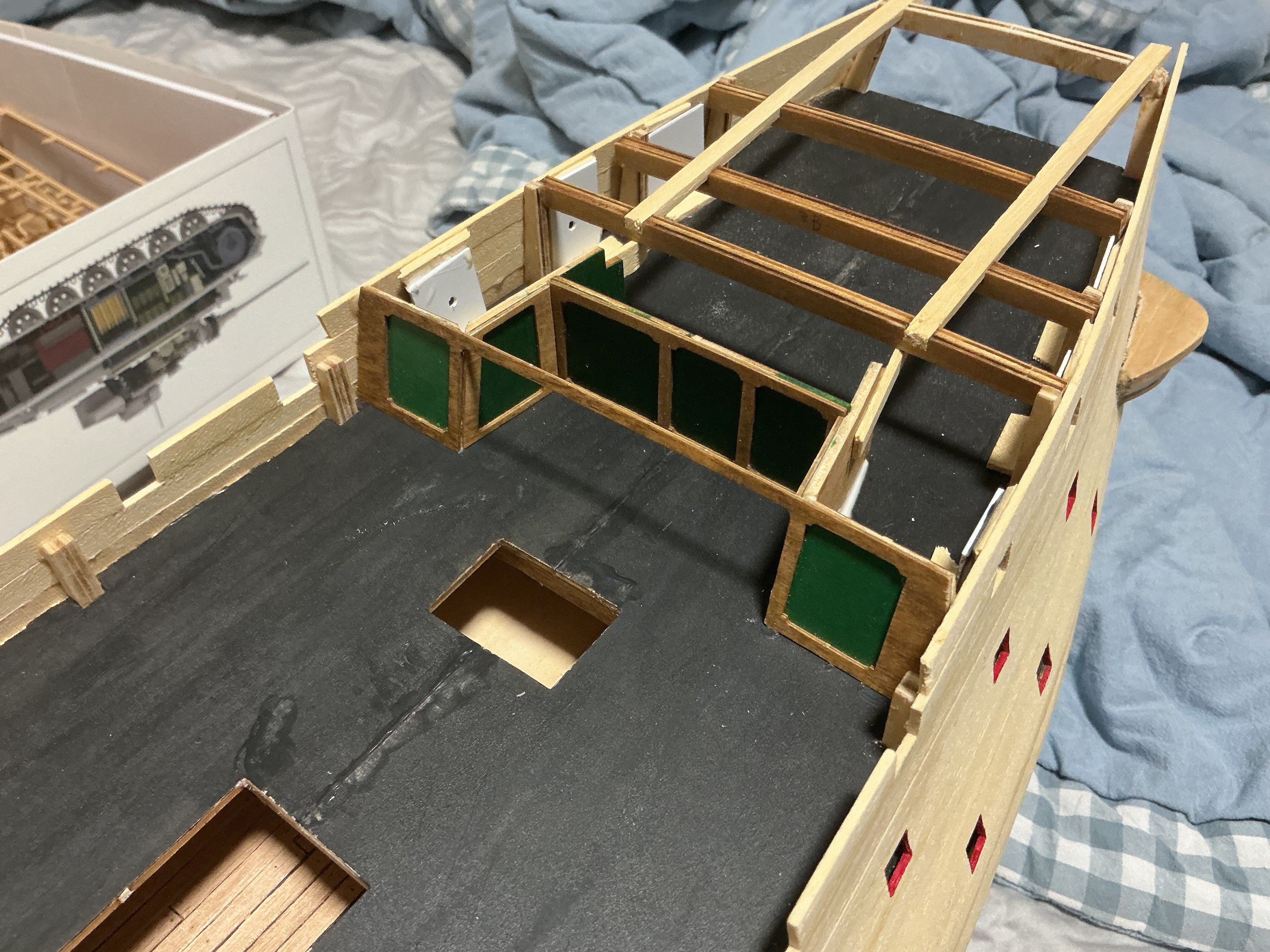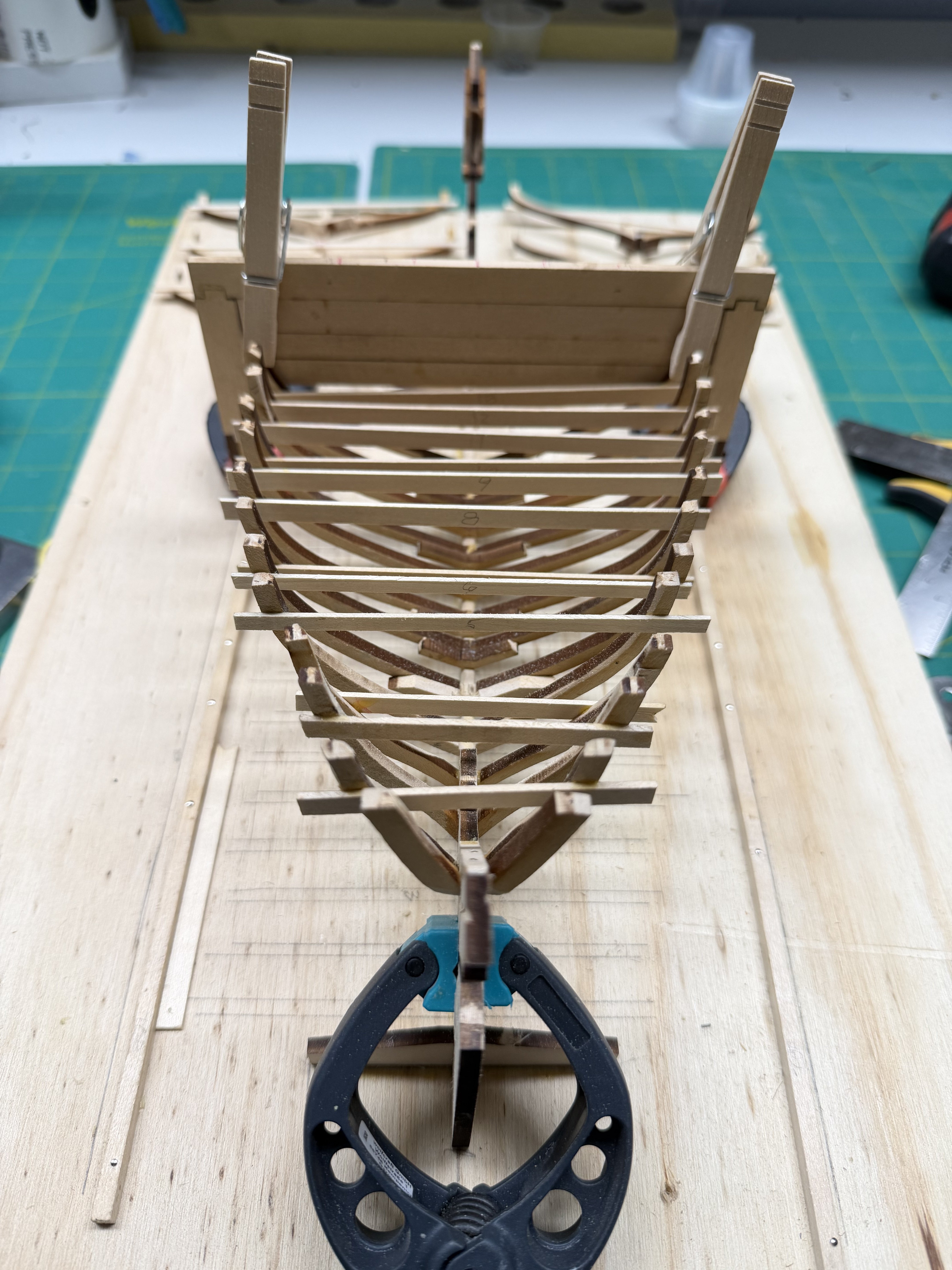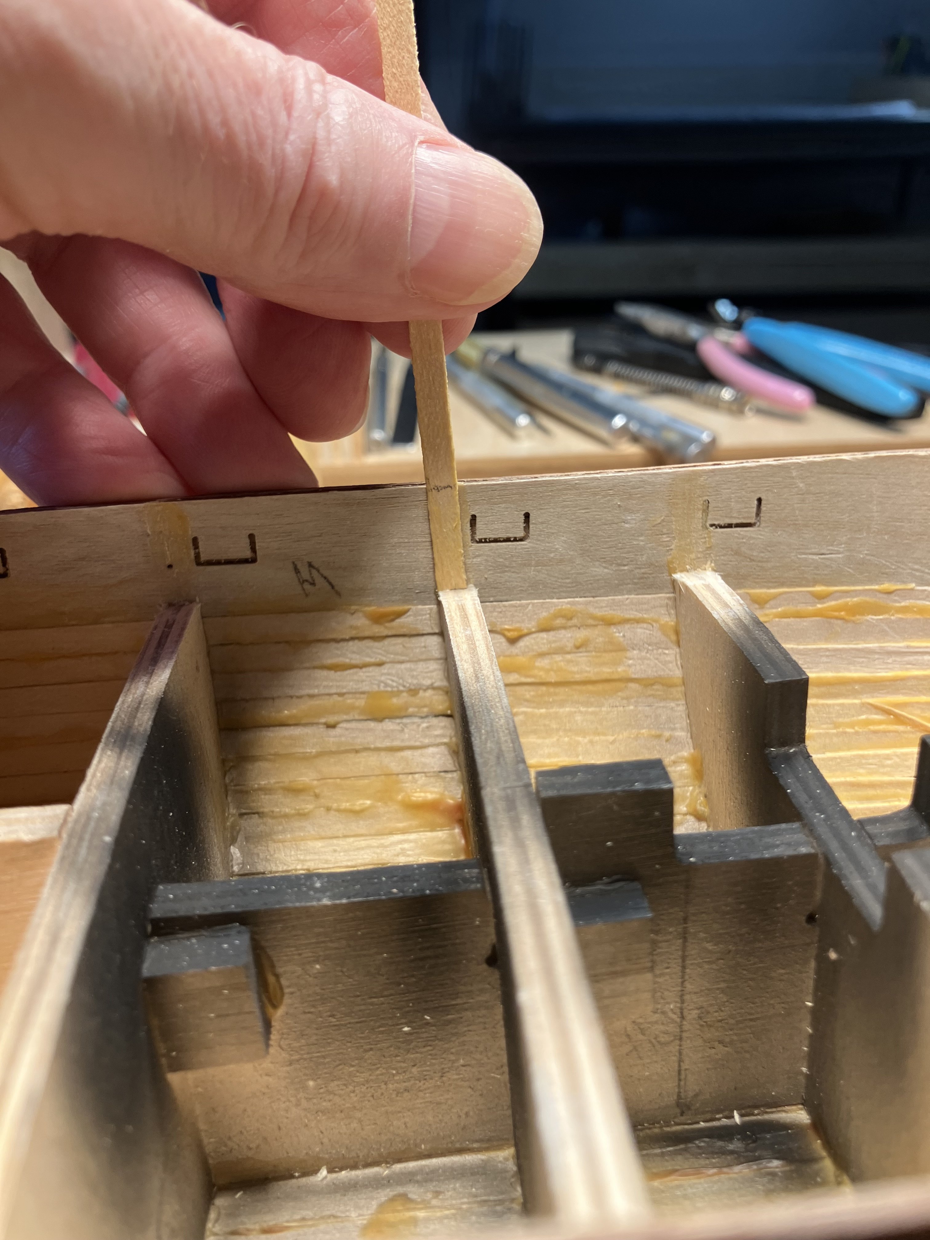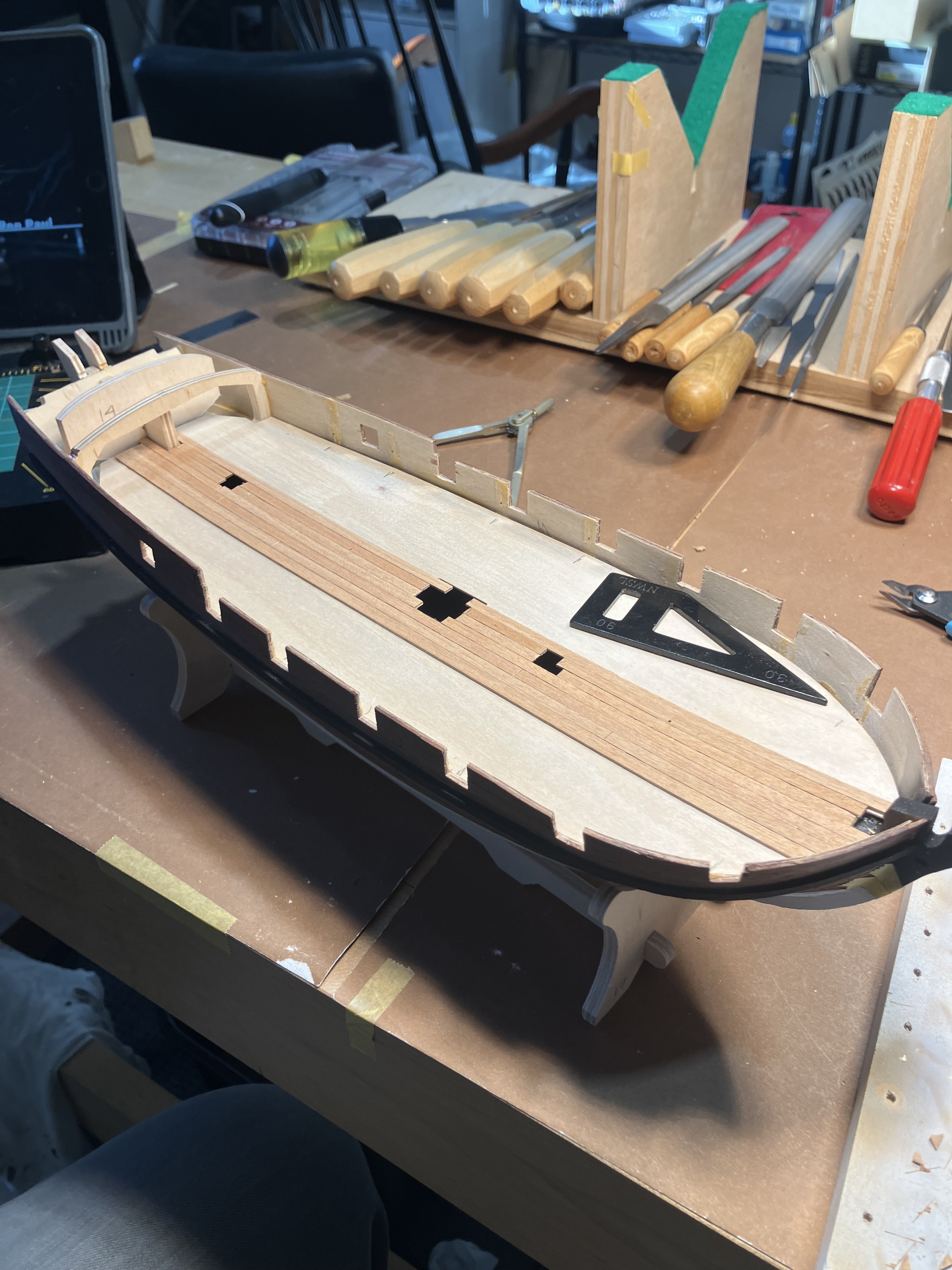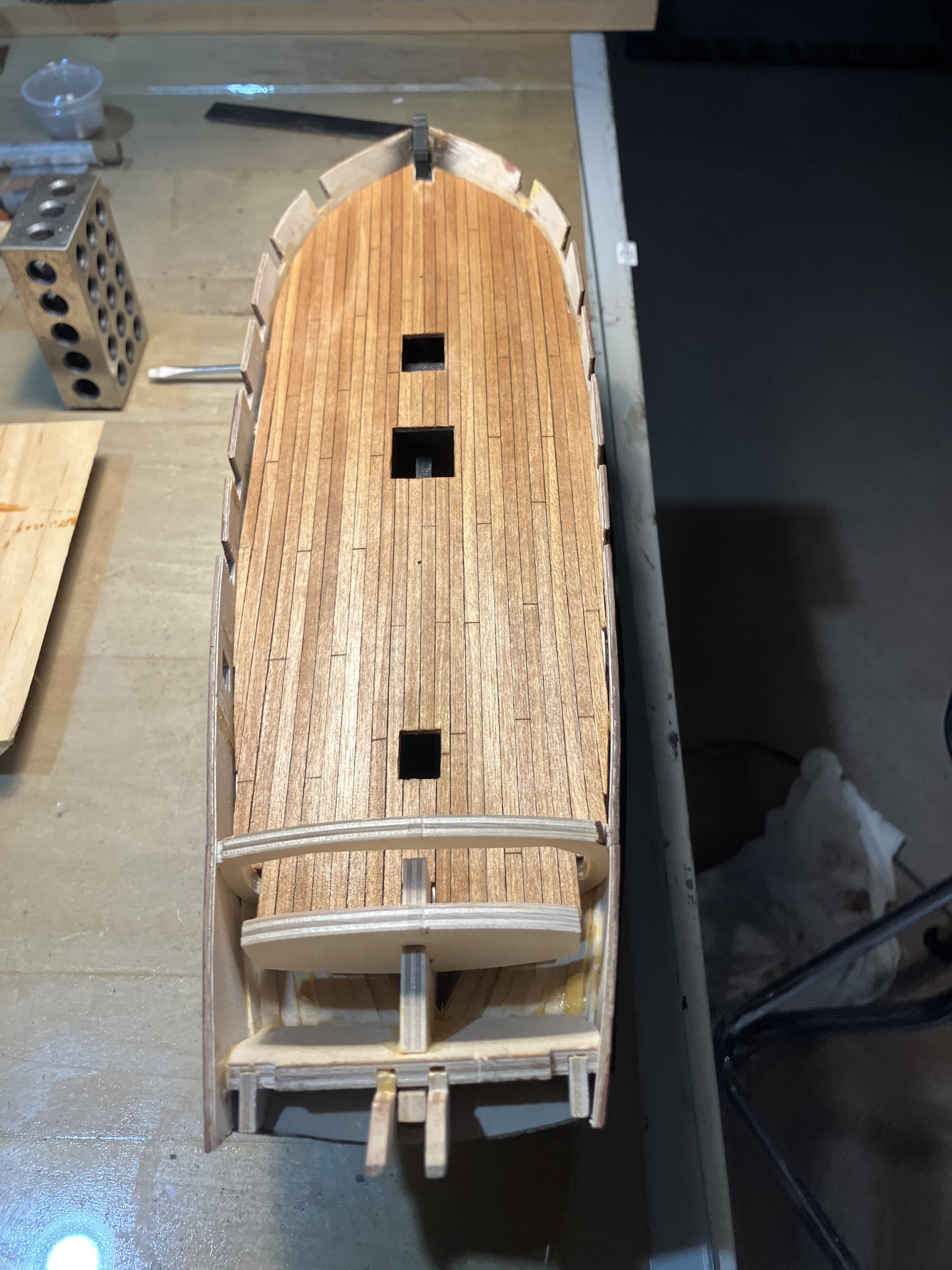 Installing the Gun Deck Before installing make sure the height from the top of the frames outboard to the top of the bulwark are consistent. I used a “story board”, a plank with a pencil line where the line is the distance from the highest frame to the top of the bulwark. Make up 2 boards one for forward of the Captains cabin, one for aft. In my case there were several frames that needed shims at the outboard end because I was too aggressive when cutting the frame stubs. Next the deck was installed with Titebond across the frame tops, and CA at the outboard ends.