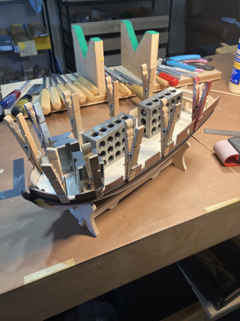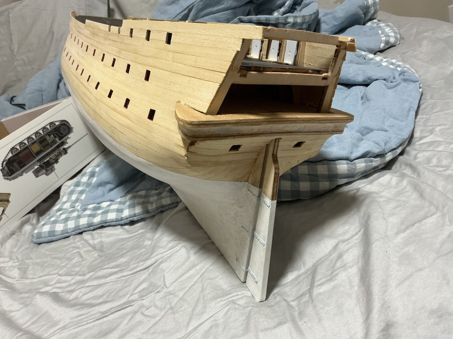 Week 44 update: sanded and painted the lower hull, added the rudder, added 10 gunports and walls to the quarterdeck, and reprofiled the stern. Had to rip the stern gallery base out because according to the instructions the transom should be about level with the piece, which seems impossible to do without reprofiling the whole thing. Unfortunately, lots of hull planking were ripped out during the surgery despite my use of alcohol to debond the glue. On the bright side these gaps should be covered by plastic pieces and the stern gallery once work progresses. Been a while since I posted, have been working on other plastic model kits again so the pace has been rather slow. The still rather lacking instructions have not been a motivating factor for me especially when compared to plastic model kit instructions. For one, the instructions never specified on what to use to hold the rudder hinges in place. There is a stiff brass rod that fits the holes in them perfectly, so I assume that we are supposed to cut them to length and hammer the ends until they form a nail head and lock the pieces in place. Was not expecting to ever have to use a hammer on a model kit in all my life but I did. Ended up destroying much of the paint in the area so I had to repaint the section and will have to go over more coats later. Needless to say, I hope I won't end up needing this darn rod somewhere else. Also, the hinges are way too narrow and had to be bended to fit the hull. I made an error earlier with one the beams for the poopdeck which should have been glued toward the bow end of the ship, which I did not because it was a bit too short and I felt it fits the aft end much better, turned out that was a mistake because two of these walls had a cutout meant for the beam to rest on and help hold the walls up. I didn't want to risk damaging the ship again by ripping more stuff out so I ended up having to jerry rig a solution by extending the walls to reach the now farther beams. Might be another couple months but I will update again when I have some more progress to show.