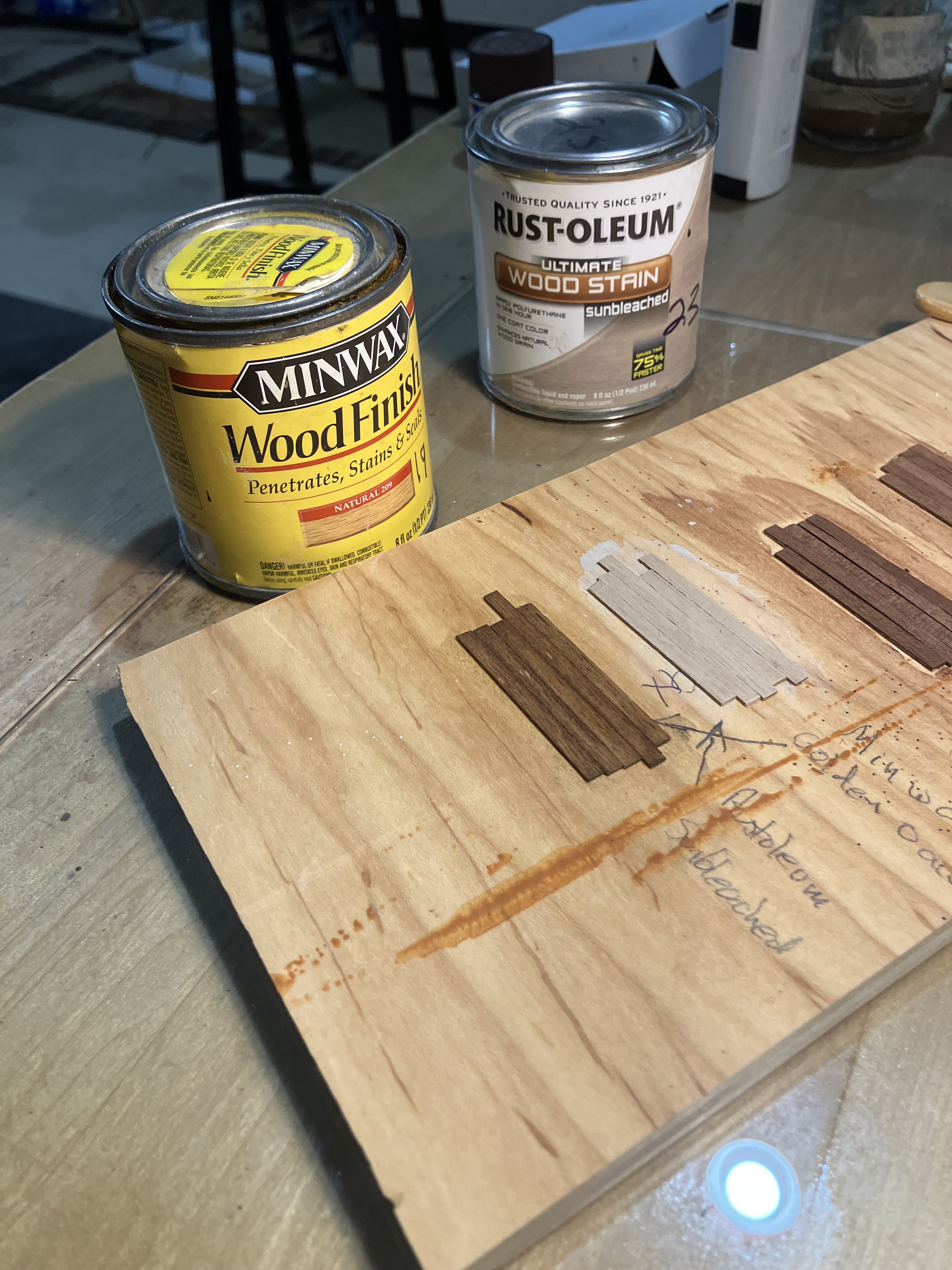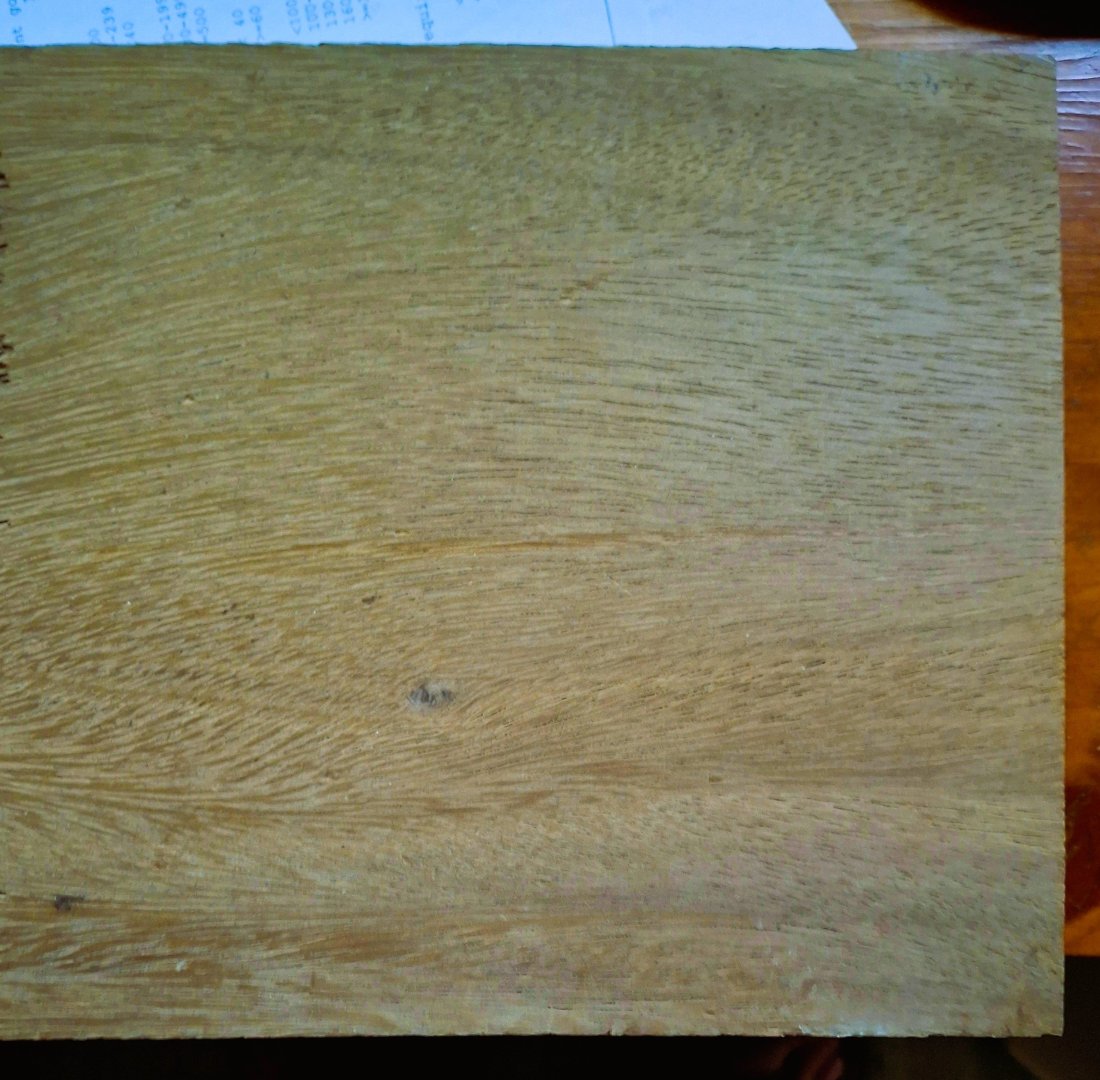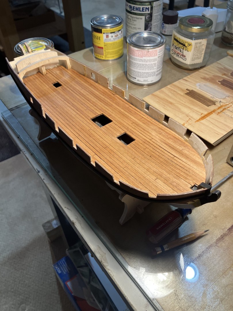 Planking and Finishing the Gun Deck Planking the deck was straight forward. In the past I would cut the stripwood into scale lengths, this time I followed the Tip in the instructions and used a single strip and scored the butt joints. The work went much faster. Next I made up some board samples and tried Rustoleum Sunbleach and Minwax Golden Oak. In the end decided on Minwax Natural. Nice results….