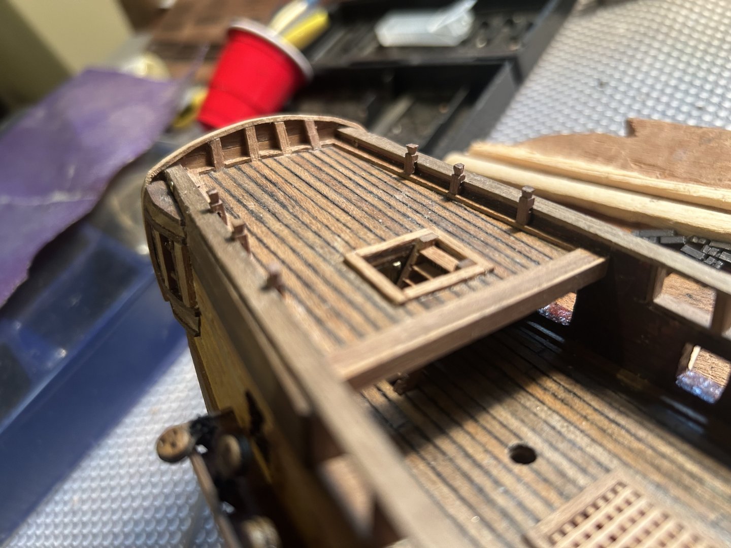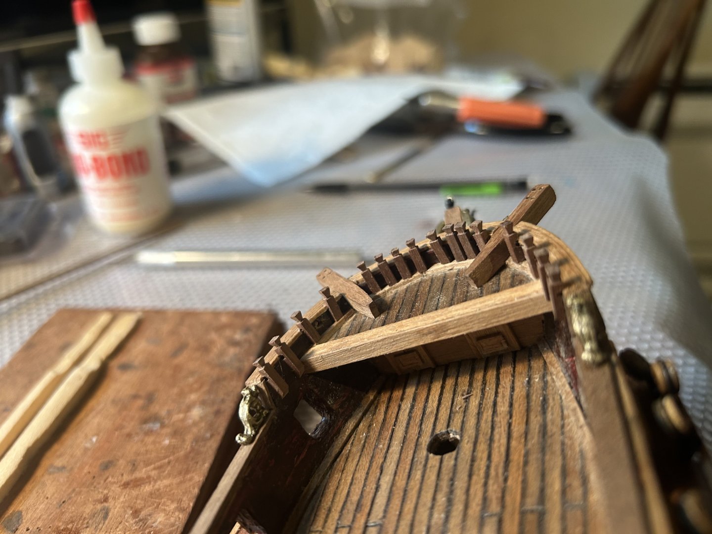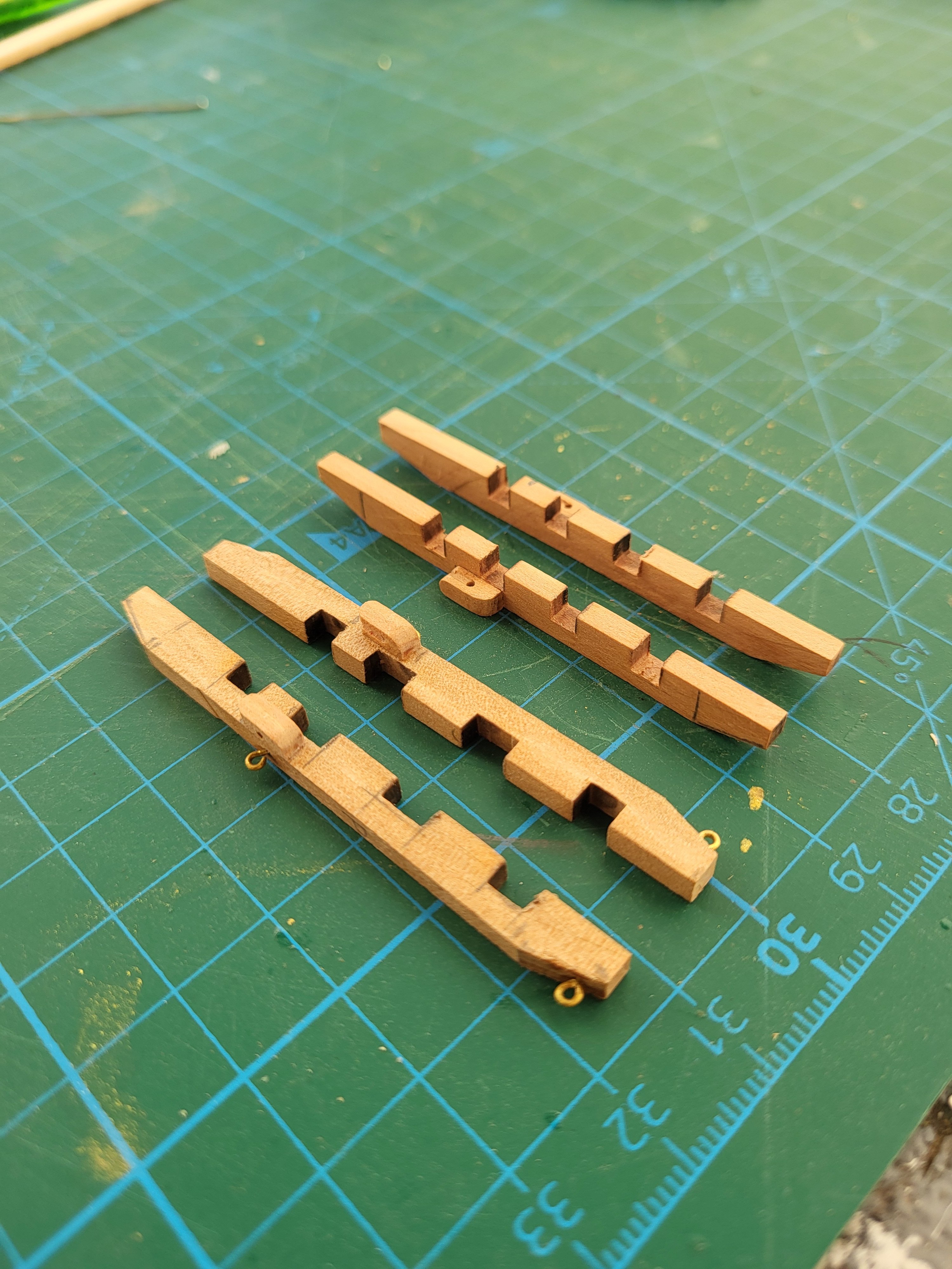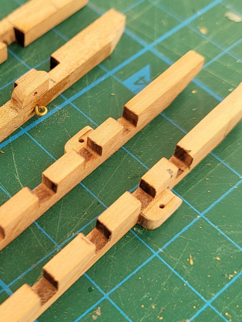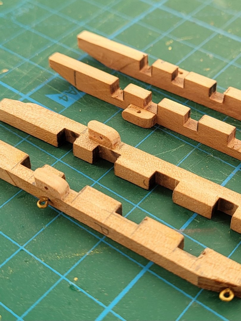 I settled on carving the knightheads myself. Now, 22 tiny carved knightheads later, I'm done with all the ones that attach to the rail. Of course, the metal front railing doesn't fit, so I'm carving that too. And I'm probably going to carve the 8 additional knightheads that go near the masts. They're simple to do. All you need is a sharp X-Acto knife and a lot of persistence. I also put a thin veneer over the false deck at the bow and the stern. It looks much better. Hopefully this phase will go much more quickly after I'm done with the ridiculous amounts of tiny carvings. At least I've preemptively assembled the gun carriages. Also, if anyone can provide photos of where all the cleat hitches attach, I would be very grateful. I don't trust the kit drawings at this point.