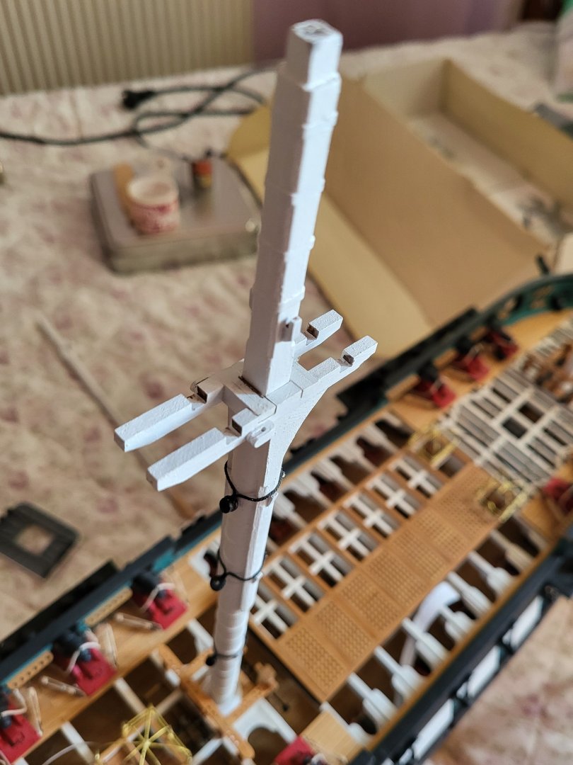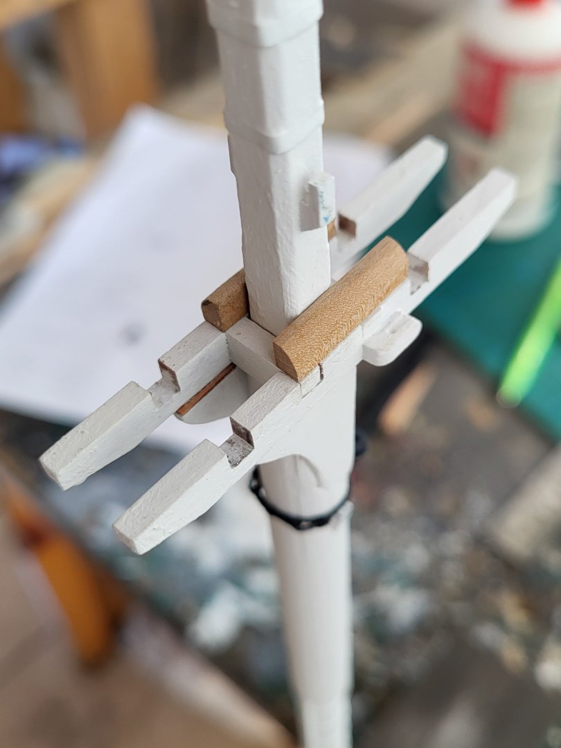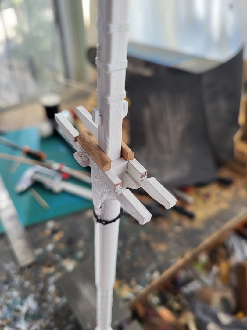 USS Constitution by mtbediz - 1:76mtbediz replied to mtbediz's topic in - Build logs for subjects built 1751 - 1800 Thumb cleats, blocks with sheaves inside them, and bolsters were fabricated and fitted to the trestle trees today. As I always do, I drilled a small hole and a shallow channel to represent the sheaves. Once these fittings were in place, the main and fore trestle trees were glued to their respective masts. The platforms, however, have not yet been glued, they will remain separate until the shrouds are completed.