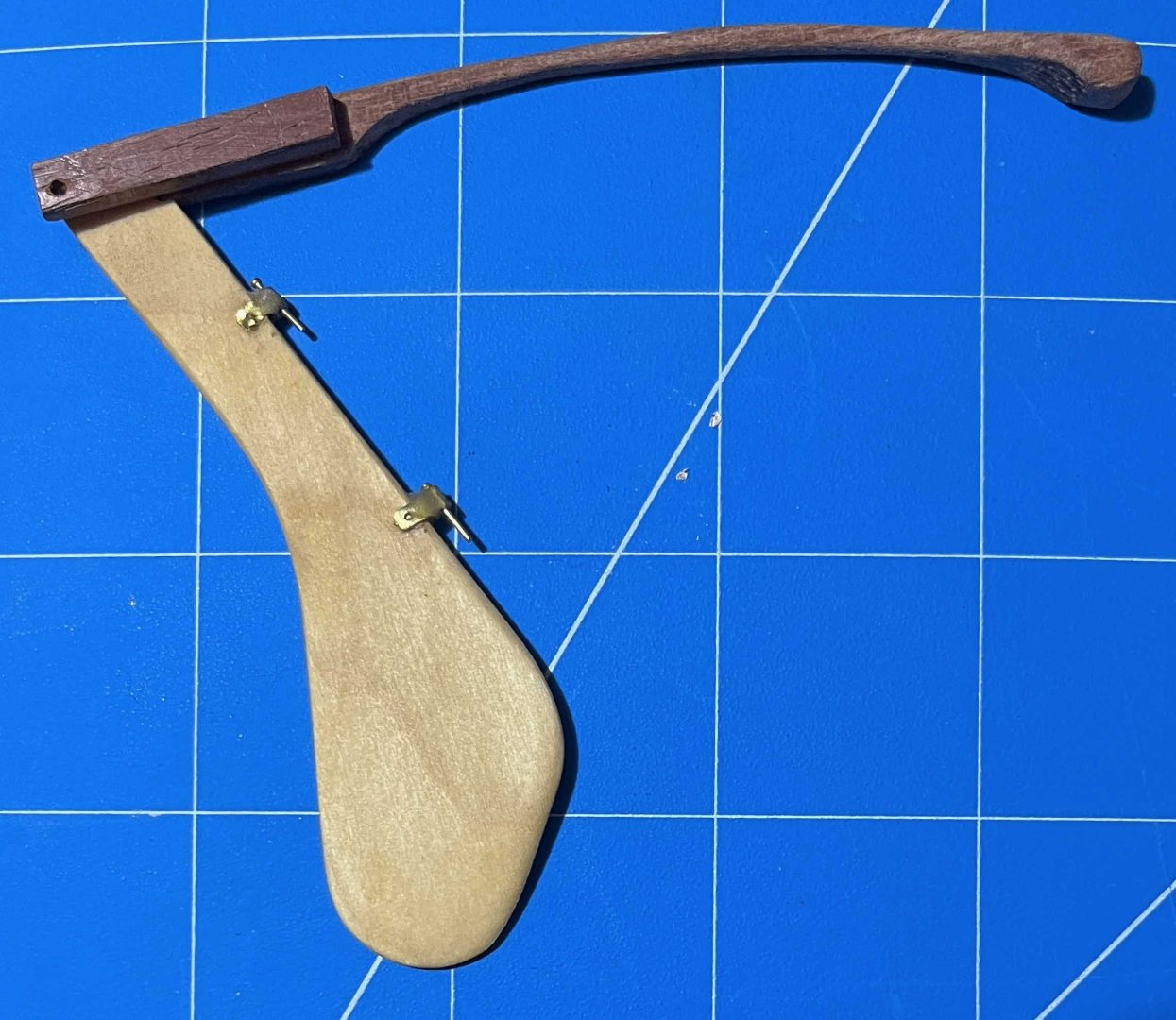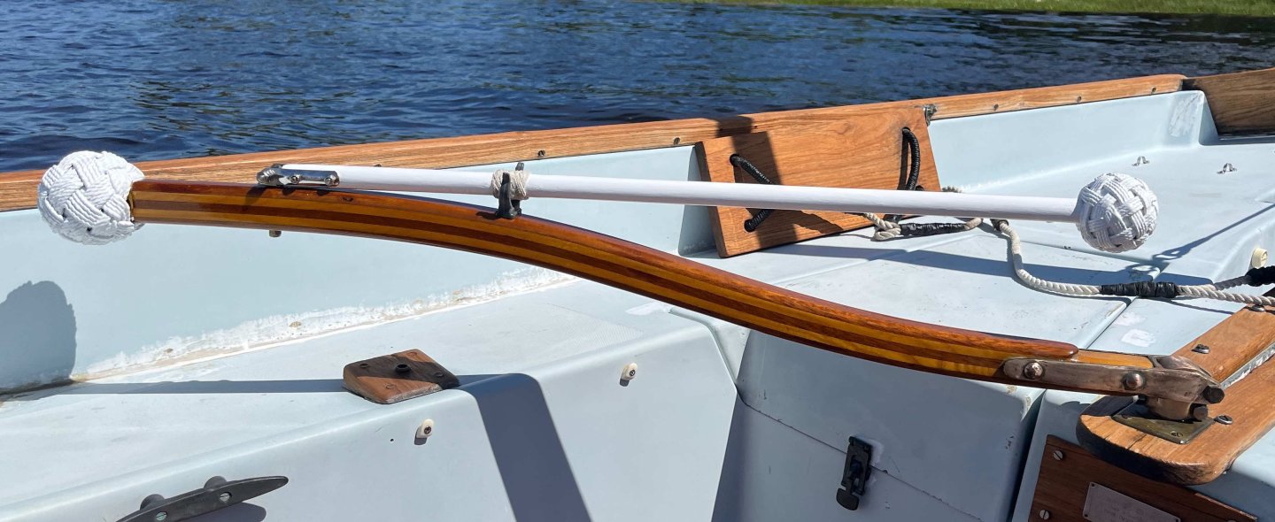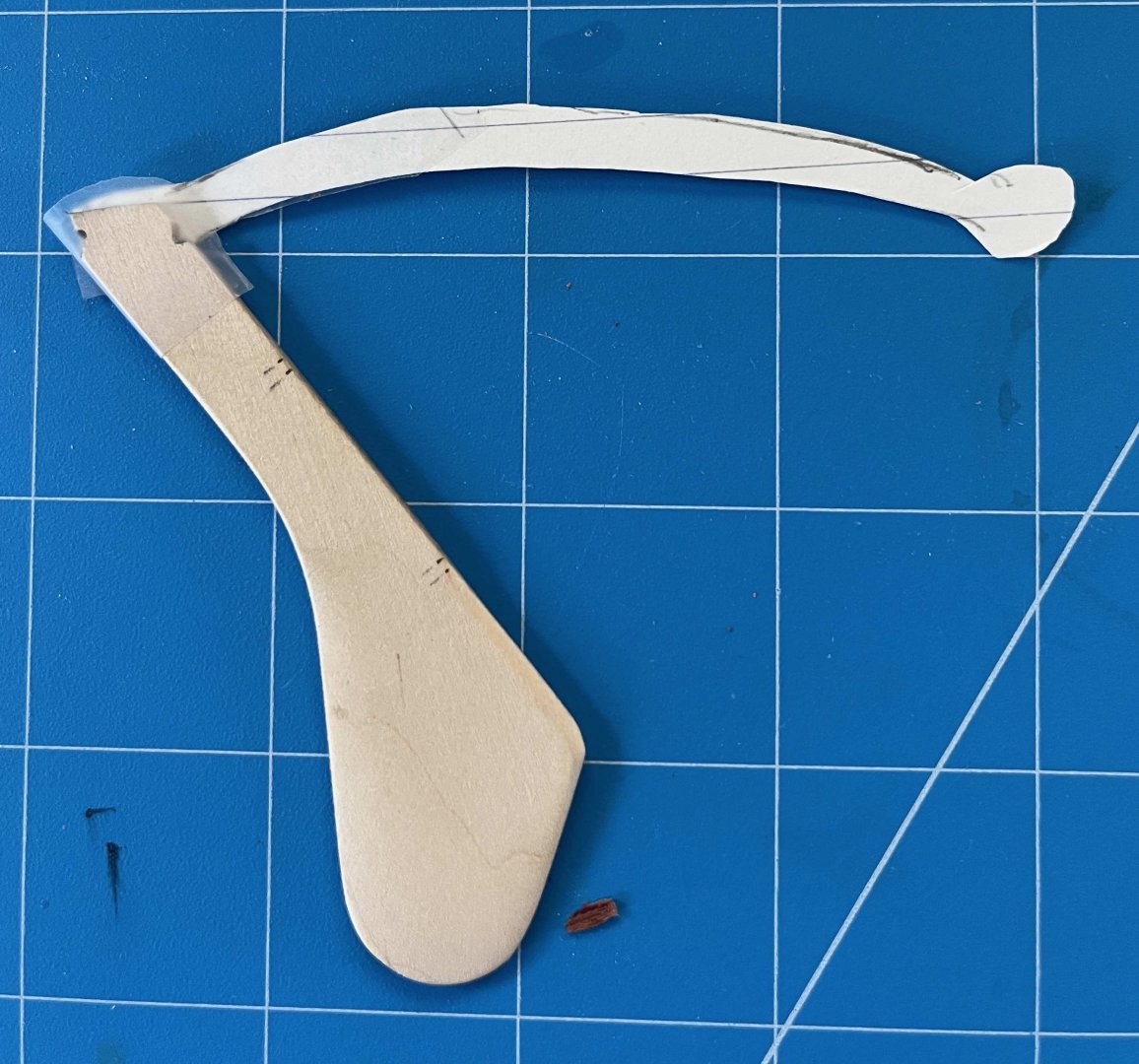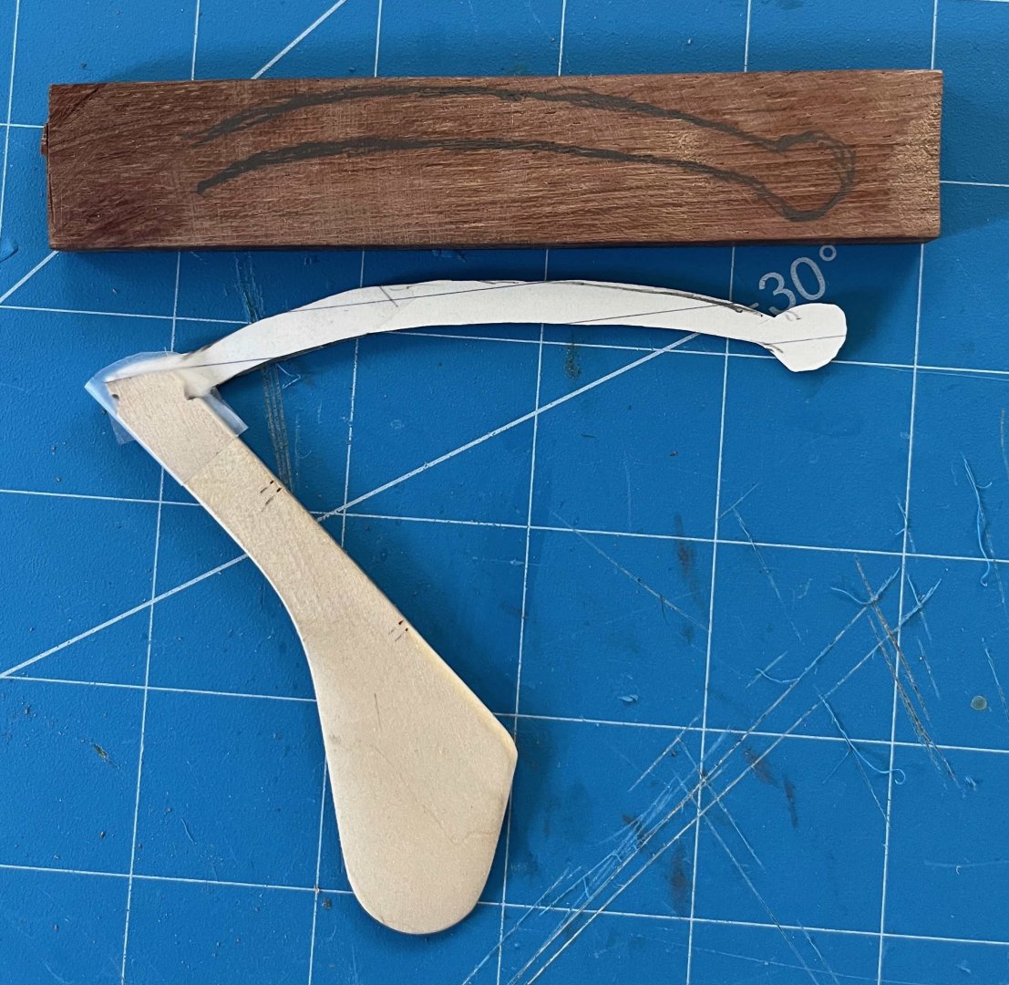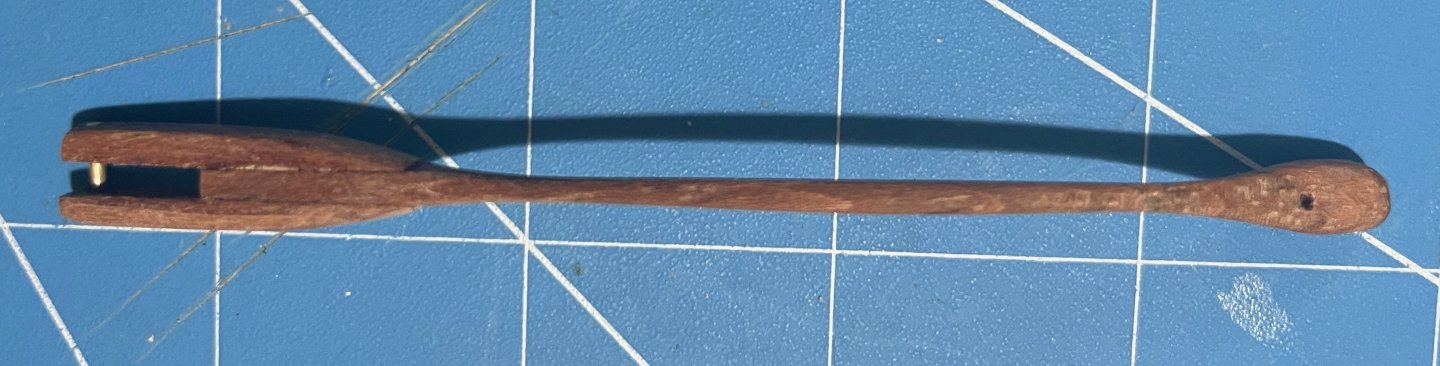 Tiller finally completed -- only seven months after I started on it! I explained the logic of my chosen solution back on post #89, so no reason to repeat any of that. However, discussion on another MSW thread through the summer got me thinking, so I will state one more point: When building a model of a specific vessel, Nelson's Victory for example, we should really strive to represent that one prototype as she was at some stage in her career. Heading off into fantasies of how she might have been, even though she wasn't, isn't what most of us are about. However, the pram isn't one boat but a design from which many full-size boats have been built. I am not trying to replicate any one of them specifically. Rather, I am aiming for a model of a boat as I would want her if I had one to the pram's design. I haven't tried personalizing the hull but I have modified the rigging, much as I would with a full-size boat. As it happens, my 22fter arrived with a short stick for a tiller, similar to the one in the pram kit. That had met the previous owner's needs but was dangerously inadequate when sailing in the sea breezes in my harbour. I added an extension right away and, as soon as I could, stepped up to the much-more-elegant tiller that the builder offered as an optional extra on new boats: The pram needs a different shape of tiller, to suit her different rudderhead and the angle of her rudder hangings, but I have gone for a similar concept. Since this was a substantial departure from the kit design, I needed to begin with a card template, to check the length and curvature needed, if the end result was to match the ergonomics of a solo pram sailor sitting astride the midships thwart: Then it was time to rough out a scrap of hardwood -- in my case a bit of jatoba, as I have oddments left over from a (full-size) boat project: Back in the spring, I got some way forward with shaping that but the Dremel cut too deeply at one point and I gave up for the summer. Maybe I should have started over but, in recent days, I decided to press on, even though the final tiller would end up thinner than I would have liked (about 1 inch diameter, if scaled up). After a whole lot of hand sanding, I ended up with a near-final shape, matched to the rudder, though with extra wood left at the rudder end as I could not be sure where the side pieces would lie: Also in the spring, I made two side pieces, following the kit's design but longer and in jatoba. I checked the alignment of rudder and tiller on the model (then checked again, and once again). Happy with that and to be sure that everything would line up, I taped the rudder and tiller down: then slipped a brass rod loosely into the hole in one side piece, placed that in the notch in the rudderhead and lined everything up. Oily tropical hardwoods can best be glued as though they were solid plastic -- meaning CA. A dollop of that on the tiller (avoiding the rudder) and the side piece was pressed into place. Once set, the whole thing could be flipped over, taped down again and the second side piece added in the same way. That gave me: Next was a whole lot more sanding, not least to make the top and bottom surfaces of the main tiller and its side pieces flush. Also to smooth the junction between those into a prettier curve. Then I tried putting annealed brass rod through the holes in the side pieces, following the kit instructions. Putting rod into holes was easy but when I tried to make heads out of the stumps of the rod, I just bent the metal and cracked the wood. So I fastened a short bit of rod into place with CA, filed down the metal and sanded the glue off the wood. With a whole lot more sanding, shaping and a hole drilled for the tiller-extension's pivot, I got to: That got its fancy end dipped in white paint and the rest wiped down with tung oil, bringing out the rich colour of the jatoba. Meanwhile,. I took the kit's tiller extension but did not even try inserting the brass crossbar as the instructions want it done. The diameter of the provided rod is very nearly as large as the thickness of the basswood extension, leaving no room for error and very little strength. If the pieces were double their thickness, I would have fitted a wooden crosspiece with a half-lap joint instead, but that was beyond me too. So I gouged a slight groove into the very end of the extension and glued a bit of brass rod there, using CA again. My attempt to form a head on the next piece of rod was as unsuccessful as the previous one had been, so I made the extension pivot from a brass nail, glued into its hole, cut, filed and painted over. That gave me a finished tiller unit that looks like: And in place on the model: Not as neat and nice as I had it in my mind's eye -- but very little turns out that well! Anyway, I'm happy with the final outcome, not least it's colour contrast with the rest of the pram. Now I have oars to finish, running rigging to tidy up and then I think the model will (finally!!!) be finished. Trevor