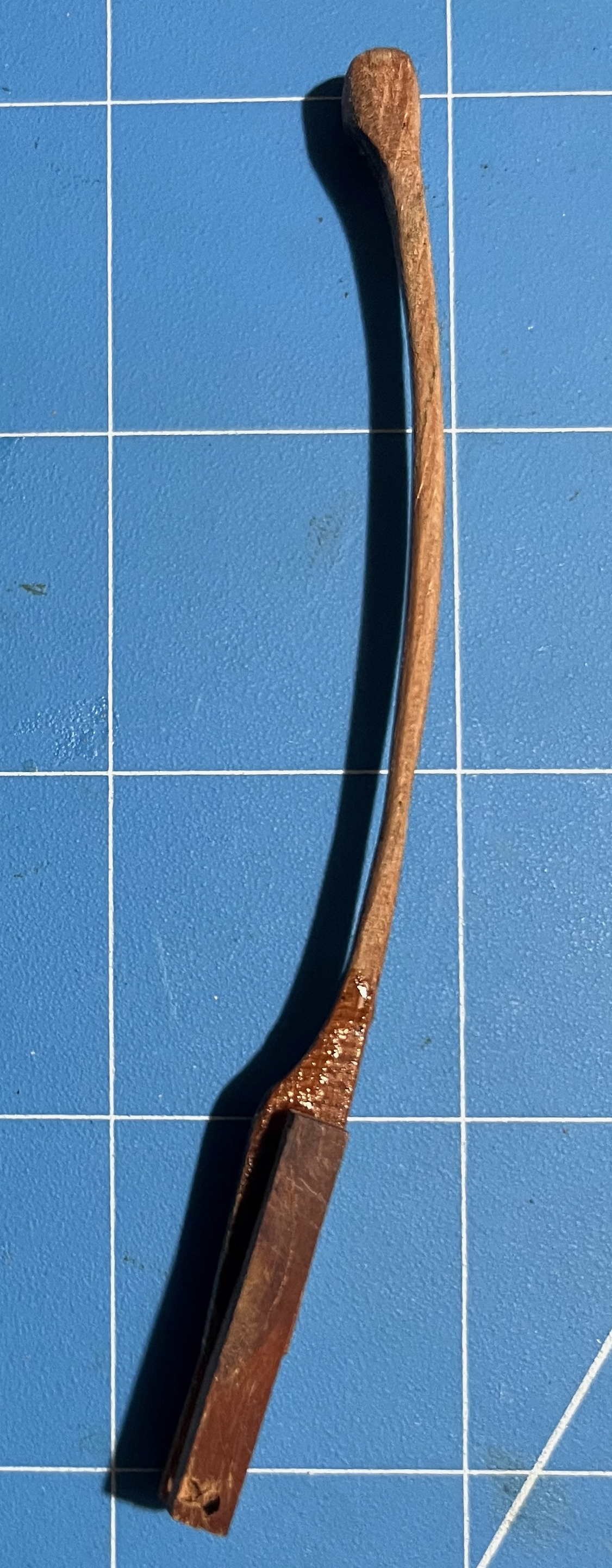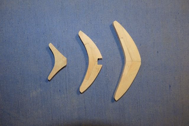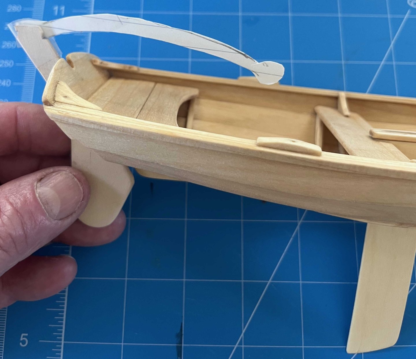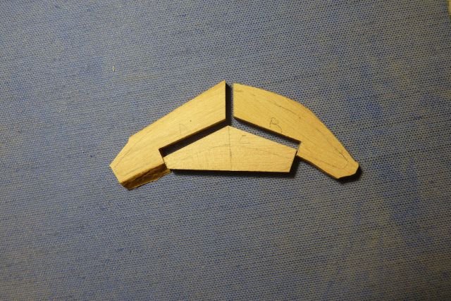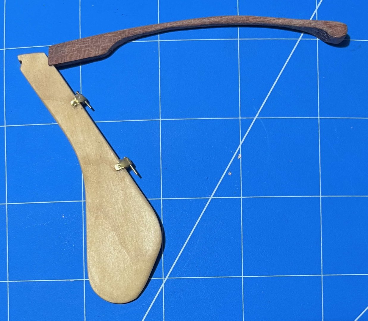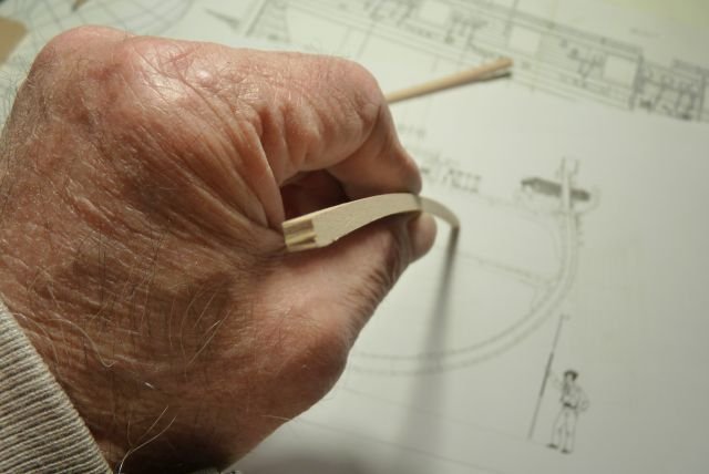 Tiller finally completed -- only seven months after I started on it! I explained the logic of my chosen solution back on post #89, so no reason to repeat any of that. However, discussion on another MSW thread through the summer got me thinking, so I will state one more point: When building a model of a specific vessel, Nelson's Victory for example, we should really strive to represent that one prototype as she was at some stage in her career. Heading off into fantasies of how she might have been, even though she wasn't, isn't what most of us are about. However, the pram isn't one boat but a design from which many full-size boats have been built. I am not trying to replicate any one of them specifically. Rather, I am aiming for a model of a boat as I would want her if I had one to the pram's design. I haven't tried personalizing the hull but I have modified the rigging, much as I would with a full-size boat. As it happens, my 22fter arrived with a short stick for a tiller, similar to the one in the pram kit. That had met the previous owner's needs but was dangerously inadequate when sailing in the sea breezes in my harbour. I added an extension right away and, as soon as I could, stepped up to the much-more-elegant tiller that the builder offered as an optional extra on new boats: The pram needs a different shape of tiller, to suit her different rudderhead and the angle of her rudder hangings, but I have gone for a similar concept. Since this was a substantial departure from the kit design, I needed to begin with a card template, to check the length and curvature needed, if the end result was to match the ergonomics of a solo pram sailor sitting astride the midships thwart: Then it was time to rough out a scrap of hardwood -- in my case a bit of jatoba, as I have oddments left over from a (full-size) boat project: Back in the spring, I got some way forward with shaping that but the Dremel cut too deeply at one point and I gave up for the summer. Maybe I should have started over but, in recent days, I decided to press on, even though the final tiller would end up thinner than I would have liked (about 1 inch diameter, if scaled up). After a whole lot of hand sanding, I ended up with a near-final shape, matched to the rudder, though with extra wood left at the rudder end as I could not be sure where the side pieces would lie: Also in the spring, I made two side pieces, following the kit's design but longer and in jatoba. I checked the alignment of rudder and tiller on the model (then checked again, and once again). Happy with that and to be sure that everything would line up, I taped the rudder and tiller down: then slipped a brass rod loosely into the hole in one side piece, placed that in the notch in the rudderhead and lined everything up. Oily tropical hardwoods can best be glued as though they were solid plastic -- meaning CA. A dollop of that on the tiller (avoiding the rudder) and the side piece was pressed into place. Once set, the whole thing could be flipped over, taped down again and the second side piece added in the same way. That gave me: Next was a whole lot more sanding, not least to make the top and bottom surfaces of the main tiller and its side pieces flush. Also to smooth the junction between those into a prettier curve. Then I tried putting annealed brass rod through the holes in the side pieces, following the kit instructions. Putting rod into holes was easy but when I tried to make heads out of the stumps of the rod, I just bent the metal and cracked the wood. So I fastened a short bit of rod into place with CA, filed down the metal and sanded the glue off the wood. With a whole lot more sanding, shaping and a hole drilled for the tiller-extension's pivot, I got to: That got its fancy end dipped in white paint and the rest wiped down with tung oil, bringing out the rich colour of the jatoba. Meanwhile,. I took the kit's tiller extension but did not even try inserting the brass crossbar as the instructions want it done. The diameter of the provided rod is very nearly as large as the thickness of the basswood extension, leaving no room for error and very little strength. If the pieces were double their thickness, I would have fitted a wooden crosspiece with a half-lap joint instead, but that was beyond me too. So I gouged a slight groove into the very end of the extension and glued a bit of brass rod there, using CA again. My attempt to form a head on the next piece of rod was as unsuccessful as the previous one had been, so I made the extension pivot from a brass nail, glued into its hole, cut, filed and painted over. That gave me a finished tiller unit that looks like: And in place on the model: Not as neat and nice as I had it in my mind's eye -- but very little turns out that well! Anyway, I'm happy with the final outcome, not least it's colour contrast with the rest of the pram. Now I have oars to finish, running rigging to tidy up and then I think the model will (finally!!!) be finished. Trevor