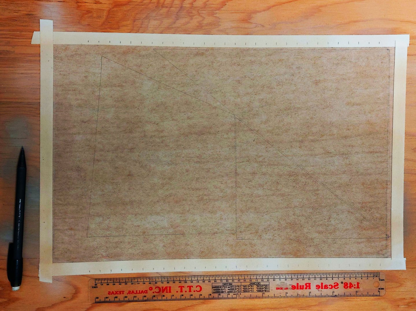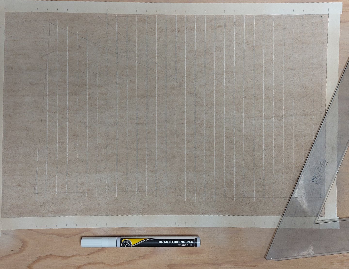 I have studied David Antsherl's appendix on sail making, and I previously made the recommended frame to hold the silkspan and practiced using it by making St. Roch's boat covers. First I taped the silkspan to the frame using medicinal tape from my first aid kit. This is waterproof and holds nicely. Then I thoroughly wetted the silkspan using a water spray through my air brush. After it had dried I airbrushed on flat white, followed by buff. While the paint dried I made paper templates of each of the three sails: jib, foresail, and main sail. They are about 30% reduced in height because I intend to furl them and I did not want them to be too bulky. Then I laid the templates onto the dried silkspan, trying to maximize the unused border areas as these will be used to make the tablatures and reinforcing panels. I aligned the foot of each sail so that when I drew the seams on I could use a single seam line that would cross each sail. Then I used a pencil to draw the outline of each sail onto the painted silkspan. At this point I deviated from Mr. Antsherl's process. For drawing the seam lines onto the sails he recommends a device called a 'Bow Pen' which is an old drafting implement. I actually have one in my Staedler 'Techmatic' drafting set that I used in my Electronic Technology course back in 1972! However, it is a very fussy device and even after practice drawing a straight line of consistent width and free of skips and blots is hard to do. I used a 'Road Striping Pen' made by Woodland Scenics. This is part of their system for making asphalt roads on model railroad layouts, and I also happen to have one of these! They are available in most decent hobby shops or on line for about $18 in either white or yellow ink. I made witness marks a scale 21 inches apart (the width of each sail cloth) along the top and bottom of my frame, lined up with the vertical side of my sails (the sides that will go up the masts). My template alignment worked out and I was able to draw seam lines from top to bottom across the three sails. Next up I may add another light spray of buff to tone down the seam lines and colour match them to the sail cloths. Mr. Antsherl says to add the tablatures and reinforcements at this point, but I will probably cut the sails from the silkspan first. My experience tells me it I will have an easier time adding these items off the frame, and besides, the material for these parts is coming from the extra silkspan at the side and bottom of the frame. So far so good... we'll see how I get on tomorrow... This is new territory for me so any comments are most welcome. Regards, Bruce