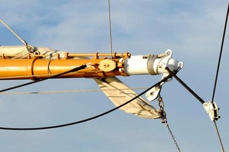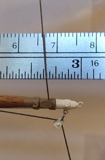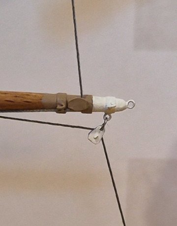 As previously mentioned, the Eagle uses metal blocks for guiding wire ropes for sheets, clews, halyards, and braces. The working ends of the wire ropes eventually connect to wooden blocks that guide fiber ropes down to the deck for the cadets to handle. Below is what the upper topsail yard/yard arm looks like on the Eagle. I experimented with several methods of fabricating metal blocks like the two white ones shown in the photo (one for the clew, and the other for the brace), and settled on using pieces of sheet aluminum for the sides, a piece of a straight pin for the axle, and a loop of wire sandwiched between the sides and around the axle for the sheave. I used CA to glue all the pieces together. It's not intended to be a working block, just to look like one. I drilled a hole at the end for use in connecting the block to either an eye attached to a yard, or to another wire rope (or in the case of some of the braces, a piece of wire simulating a length of metal bar). I'll be using gray thread to replicate the wire rope. I made several sizes of blocks, wanting to keep as close as possible to the scale size of the actual blocks. I estimated the smallest ones (which is the majority of the blocks) are between 6 and 9 inches long, so to scale would be 1/16" to 3/32". I was able to make decent ones at 3/32" but the attempts at 1/16" were unacceptable. The largest ones will be 1/8". I previously developed a method, in post #28, for making the sheet sheeve that is attached directly to each yard, as shown in the photo above. I decided to make a test yard/yard arm with the metal blocks, sheet sheeve, and attachment points (eyes) for the brace, foot rope, and Flemish horse. I omitted the eye on the top end of the yardarm, and haven't decided yet on how to replicate the jackstays on top of the yard. The photos below show my test yard/yard arm (which is suspended by the arms of a Quad Hands, not visible in the photo). The size of this test yard is actually a bit smaller than the size of the royal yard, so I should have no problem constructing all of the yards with the various attachment points. I ended up using thin blue masking tape for the metal bands around the yard at various places. The eyes are formed from 28 gauge wire and fastened using CA in hand-drilled holes. First I painted the yard/yard arm with two coats of shellac, lightly sanded, and then painted the yard arm and metal block white, and a portion of the yard light tan color (two coats of Testors enamel paint for each color; I'll probably go with a third coat for the actual model since the paint is still a little thin as is evident in the photo). For production, I'll use a color for the yard (and many other parts of the model) that is much closer to Coast Guard spar; True North Precision Paints has a color they show as an exact match, and I have some on order...will be testing once the order is received. I ran two threads on the test jig to approximate how the sheet (from the sail above) and the clew (for the sail attached to this yard) will show in the model. The hardest part of putting the parts together was attaching the metal block to the eye, using a small loop of 28 gauge wire. I'm happy with the overall look of the yard/yard arm, and especially of the metal blocks, so I'll continue making the ones I need (8 made so far, 62 to go). That's all for now. Lee