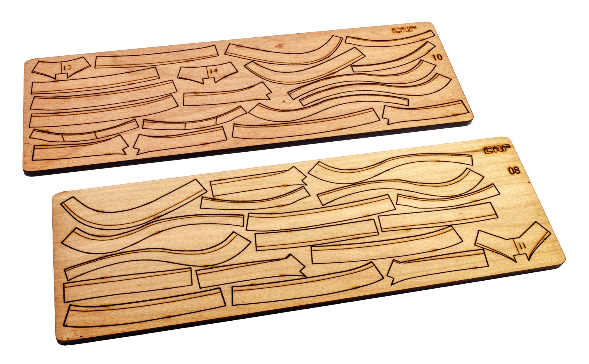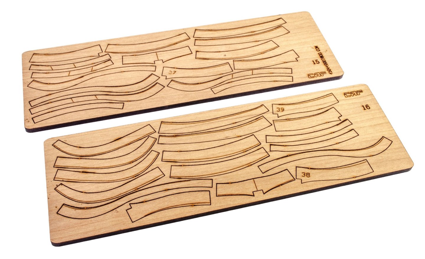 PART 3 This is beginning to look all too familiar...but WAIT! We now also have parts for the hull jig! Not all though, as some are also supplied in the next pack, but at least you get a good start in getting that very large construction underway. As you'd expect, the cradle is constructed from laser-cut plywood. All parts in this pack are sealed in a single cellophane wrap. As well as more framing and that cradle, there are also two small frames containing CNC machined parts which relate to the stern of La Renommée. These just want freeing up and carefully sanding smooth. Instructions As well as another full size frame layout sheet, you can see the use of colour in the instructions, to denote key areas of construction, including the use of those CNC parts. Part 4 will follow soon.- 3 replies