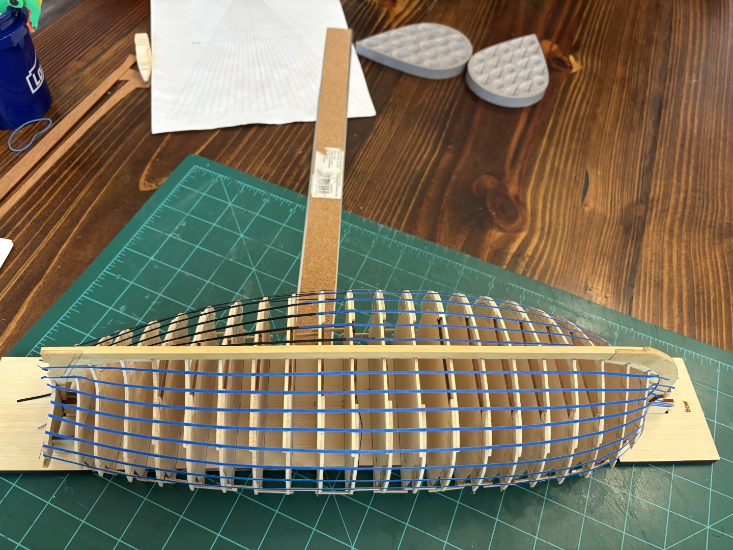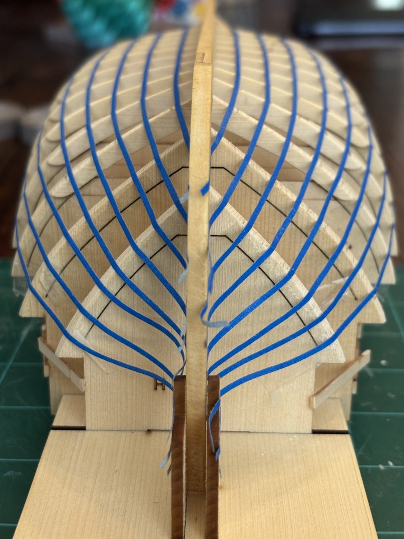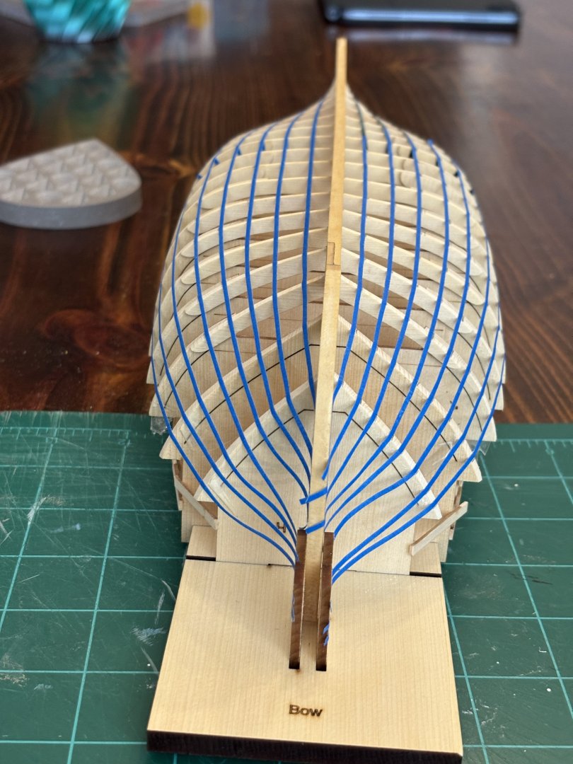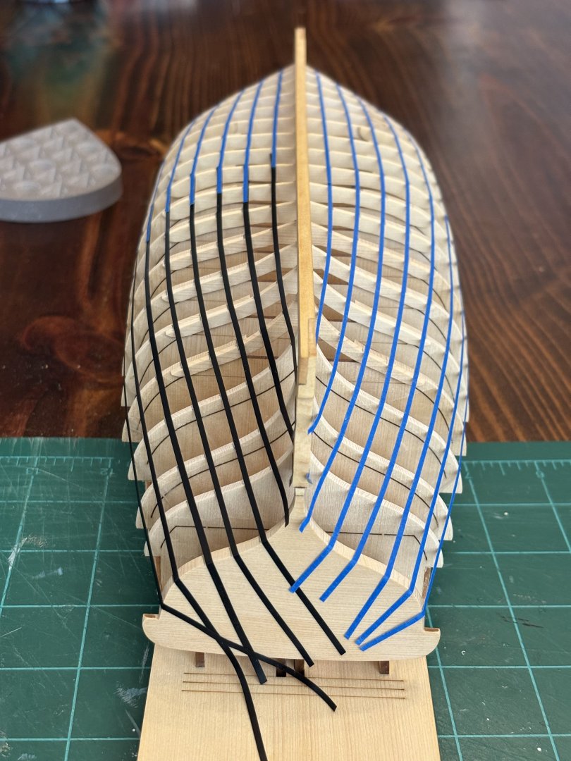 21. Planking below the wales has begun. First thing I did was to line off the hull and separate the hull into 3 belts. Then I started planking the first belt on the port side. I am about half way through with this belt, it will consist of about 9-10 planks. So far I am pretty happy with how the planking is progressing.
