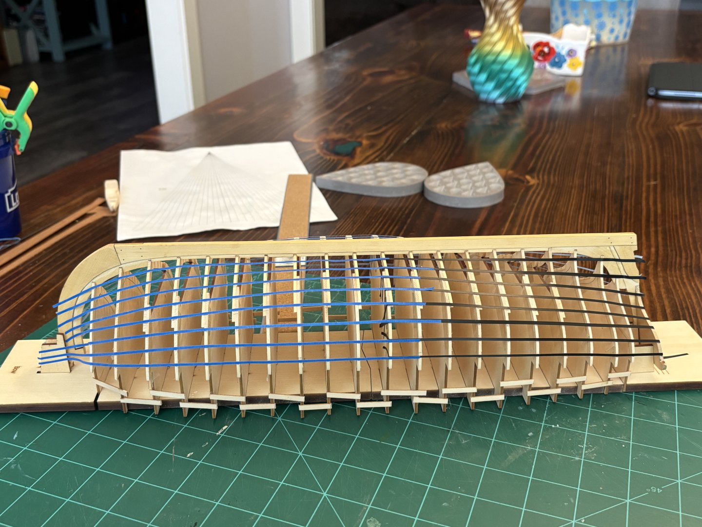 3. Finished up the starboard side planking tonight. Next up is the tedious task that everyone loves to do; sanding it all smooth. It’s not the best planking job, so no close up pictures; but I am happy with it and learned a lot from the whole experience.