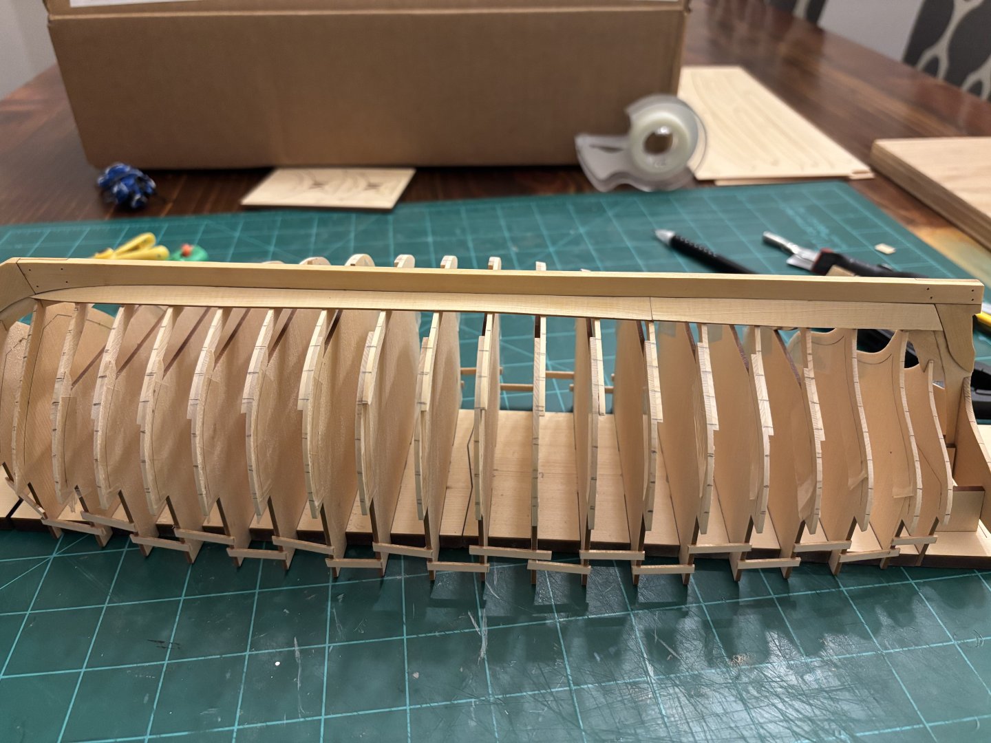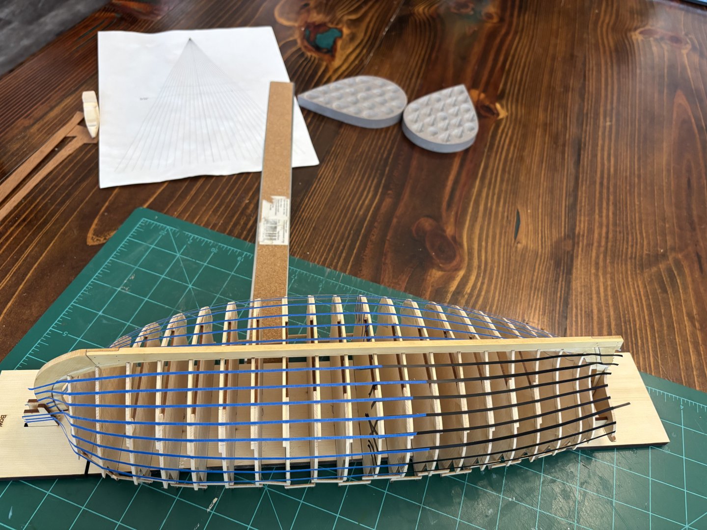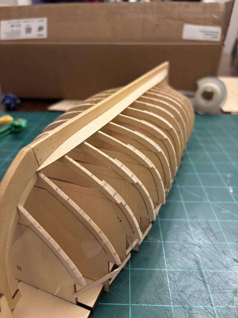 1. Found a little time to put in some work at the shipyard this evening. I was only able to get 1 strake completed, but I was taking my time to ensure that it was all done correctly and that everything fit tightly. Hopefully, I will have more time tomorrow to add some more strakes to the starboard side.
