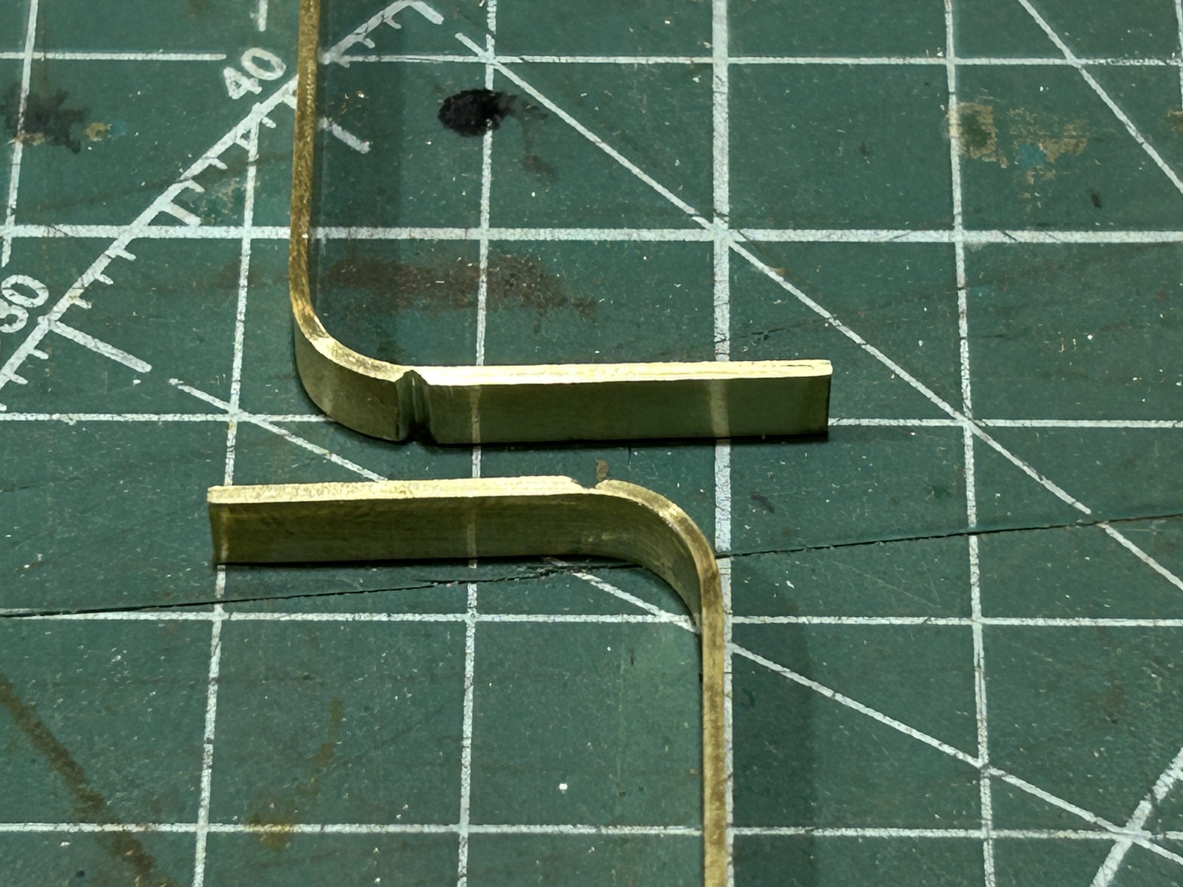 Thanks everyone. More metalwork: this time the bowsprit chain plates. The whisker stay chain plates are pretty straightforward, note the portholes openings have been cut. 0.8mm brass sheet, which is probably a little heavy. The bobstay chainplate is more complex, & it became clear that with my simple kit multiple solder joints in this case would be very difficult, so I made the main parts from one sheet (0.5mm), with back-mitres so it could be folded & then soldered to fill & stabilise the folds. Then the chainplate cleat was soldered to the edge, tinned etc (cleat 0.8mm thick). A paper template was used to confirm the fold angles, as brass is only happy to be folded once, & solder never.... The fixings are some 1mm diameter brass rivets approximately 7mm long, so a 1mm hole, add some CA glue & press the rivet into it. The back-mitring was done with a jeweller's saw & also a small file with a square cross section. The mitre is also slightly wider towards the edges, so that the main piece could be curved to suit the stem profile. The side flange fixings are some unbelievably tiny brass nails, too small & I could hardly pick them up.