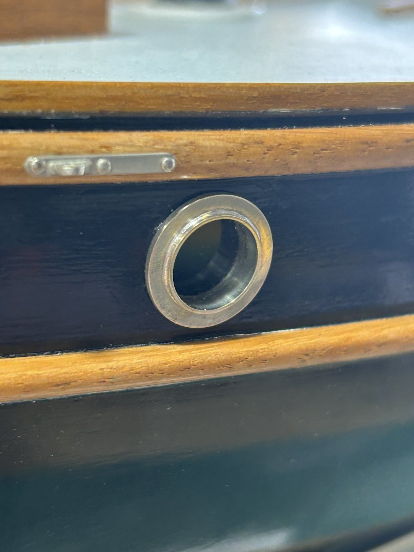 On with the various details: Chain plates plated & installed with glue, nb: with a 1mm diameter brass rod below, into the deck structure. The traveller is from 2mm brass rod, & the details from brass rod centre drilled to slide on. I made a cardboard template to bend the shape over, although it didn't work fully as the shallow curve had to be done by hand as the metal didn't take the shape on the template. The legs extended down into timber take give a good glue fix. Tinned & polished. The purchased scale winches were plated, & with the spacers for the smaller ones - kindly made by Bedford - fitted, they look good. Also, small bevels to the lower outer edges, to look right they must have a small gap to the timber they sit on. The mast seal was made from 4x 2mm acrylic layers, laser cut into sized doughnuts & sanded to give the rounded edges, painted etc. The actual fitting is a roofing rubber seal with a rubber piece that can be trimmed to suit the size of the pipe (or mast). And the portholes...I had some brass washers & started by enlarging the centre holes to suit. 2 small & 4 large. The washer is on the right, on the left are the washers with the ID adjusted, by hand with the rat tail file & finished with sandpaper wrapped on some dowel. I then had to reduce the OD, & for this I made another version of the home-made lathe. This time using a piece of timber dowel with a centre cut & a timber wedge to lock the washers in place, Crude, but it worked well. I held sandpaper against the spinning edges until the diameter was right. The washers got extremely hot, so actually it was some rags below the sandpaper, & you can see the dowel is slightly scorched. Then soldered the thin wall brass tube pieces to transform them to the portholes. The lip created by the tubing is a small but visually significant detail. In this case I won't show the fixings (6x c/sunk bolt heads on the flanges), as I believe they would be visually much more noticeable than on the actual boat, so in this case they will be left off. There are some flaws, & of course I didn't photograph those ones....but not significant enough (I think) to be an issue. The hull the portholes sit on is jet black, & won't put 'glass' into the porthole apertures. But after considering it, I will paint the part of the hull visible through the portholes - but a slightly lighter shade than full black. In reality, glass will reflect surrounding light more than the hull paint & so will appear paler. I'll do a v dark brown/grey, just add a small amount of tints to some black base. thanks,