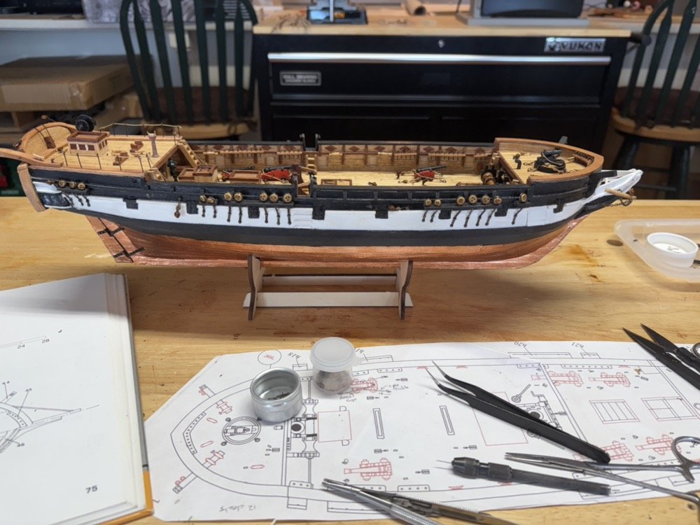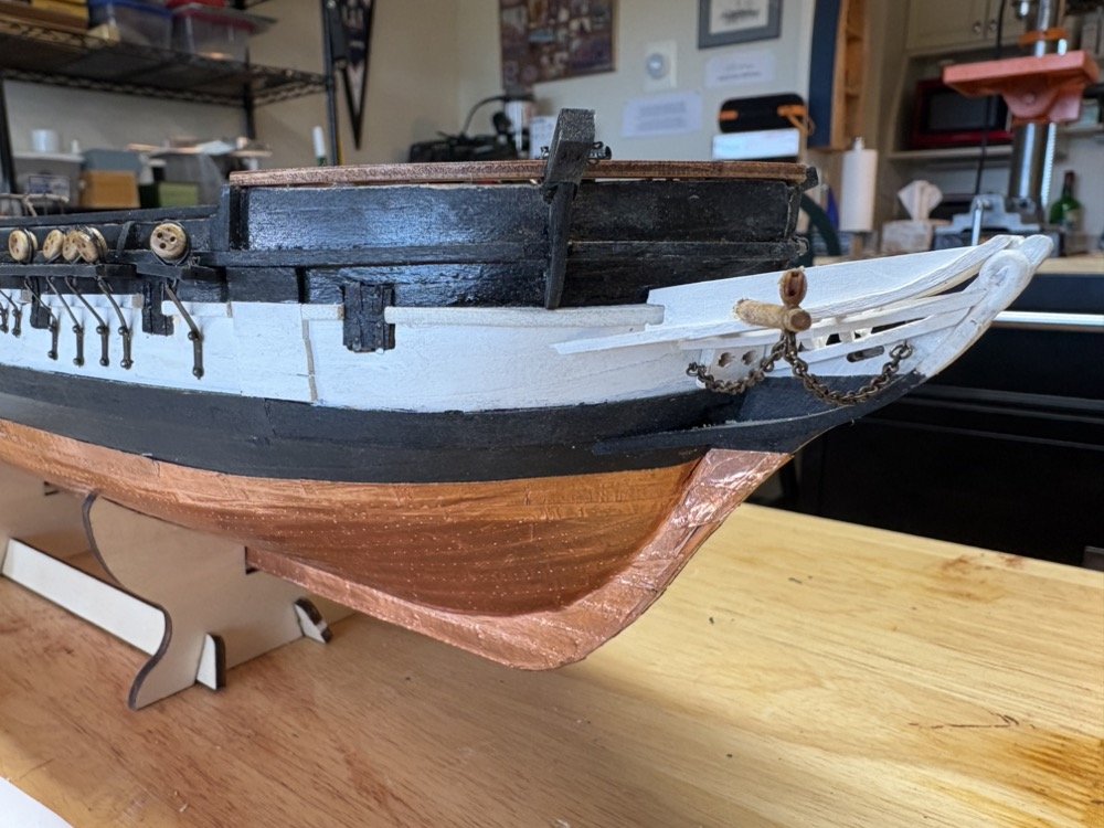 Thanks DAR. Yes it is a good task you can do away from the workbench. I used the laser cut channels that came with the kit, but I did have to file out the notches for the deadeye strops. I also added wire pins to the back of them to provide additional gluing strength. I thought I needed to add the deadeyes before gluing the covering boards over them but this proved too difficult to hold everything together while getting the covering boards straight. I found that I could slip the deadeyes into the channels after the covering boards were glued on by elongating the small loops slightly. After adding the deadeyes I drilled holes for the pins in the hull and glued the channels on. I then added the chain plates to the deadeyes by hooking the upper ends through the small loops on the strops. I bent the chain plates to sit flat on the hull and used a dowel and some string at the heights of the various shrouds to set the angles of them The lower nails were below the deck level so I could cut them long enough to handle easily, but the upper nails were above deck level so I had to cut them very short which made them hard to handle. I ended up drilling a good size hole so I could slip them in more easily but I had to glue them into the holes. I also added the three small chain plates on each side with the double blocks for the topgallant and mizzen topmast backstays. I ended up remaking the aft davits again as the ones supplied with the kit that I used as a template were too short, so I made the new ones that are a little longer. That completes page H of the instructions, with the aft davits and cleats added, the head area completed, and the channels and deadeyes. The next page I adds much of the deck furniture.