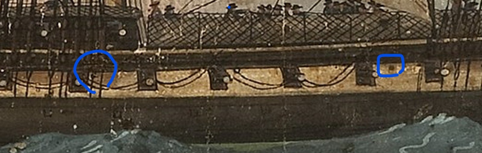 I was checking in my Robert Gardiner´s "Frigates of the Napoleonic Wars" .. and we can find there examples for a) ships with ports for rowing the ship - like on page 16: HMS Hyperion (1806) .. here a view on her frames - and you see the ports for the oars being in the level of the gun ports: https://www.rmg.co.uk/collections/objects/rmgc-object-82795?_gl=1*10vq9vc*_up*MQ..*_ga*MTM1NTE2MjQyOS4xNzYyOTc2MTQ3*_ga_7JJ3J5DBF6*czE3NjI5NzYxNDYkbzEkZzAkdDE3NjI5NzYxNDYkajYwJGwwJGgw*_ga_4MH5VEZTEK*czE3NjI5NzYxNDYkbzEkZzAkdDE3NjI5NzYxNDYkajYwJGwwJGgw Here the inboard profile - including the ports for the oars: https://www.rmg.co.uk/collections/objects/rmgc-object-82796?_gl=1*d508ay*_up*MQ..*_ga*MTUwNTQxMzg5MS4xNzYyOTc2MzMy*_ga_7JJ3J5DBF6*czE3NjI5NzYzMzEkbzEkZzAkdDE3NjI5NzYzMzEkajYwJGwwJGgw*_ga_4MH5VEZTEK*czE3NjI5NzYzMzEkbzEkZzAkdDE3NjI5NzYzMzEkajYwJGwwJGgw https://collections.rmg.co.uk/media/2/440/699/j5940.jpg The ports are much higher than what we see in Thukydides´s findings.. So the ports in HIS examples are very likely NOT for oars. b) air vents .. there are ton´s of examples with air vents in the berth deck level. A lot of them having most of the air vents in the rear section of the berth deck - where the midshipman staterooms would be in case the officiers had their quarters on the gun deck - in front of the great cabin. there are examples in which we see air vents in the rear section - but also in the mid and even the forcastle area - on berth deck level. One beautiful example is on page 28. A profile drawing of a Lively class ship build in 1799. Another example is on page 156 - a painting of HMS Phoenix .. in which we see open air vents in the belly of the ship.. I admit - not too much examples .. One thing we may think about: in Constitution the crew was sleeping in the Berth deck - and 400 man need some air ! .. I am not sure about the sleeping area on smaller british Frigates? But for sure the first getting the luxury of fresh air would be the gentlemen in the staterooms, right? The ordinary seaman usually did not have to expect a lot of attention for his well being. That might also be a reason why we so often see air vents in the stern area - but not in the forcastle. Interesting...