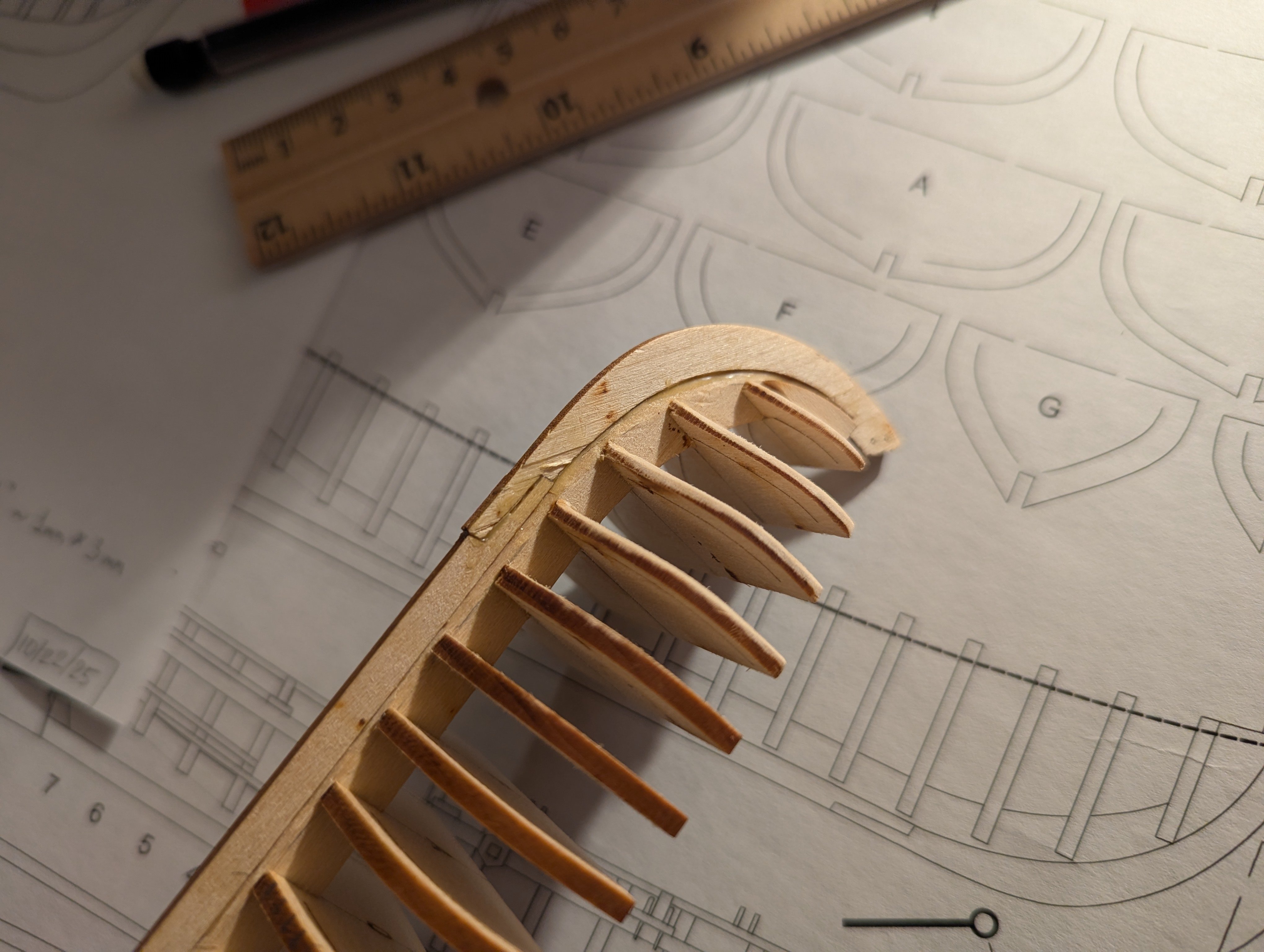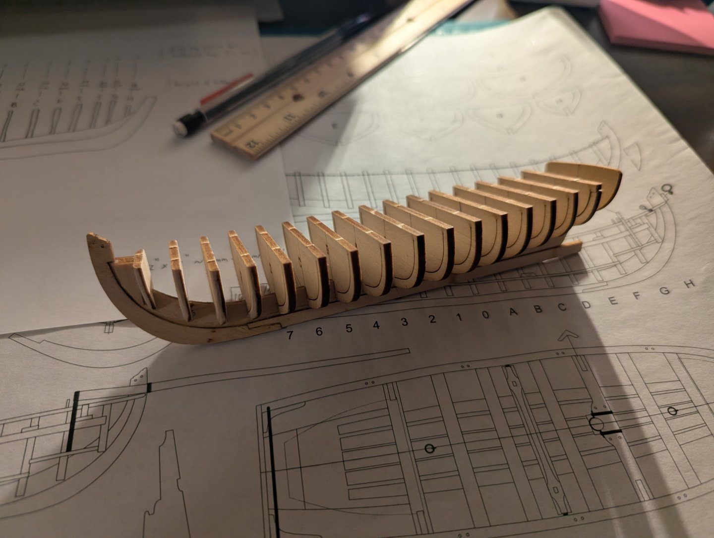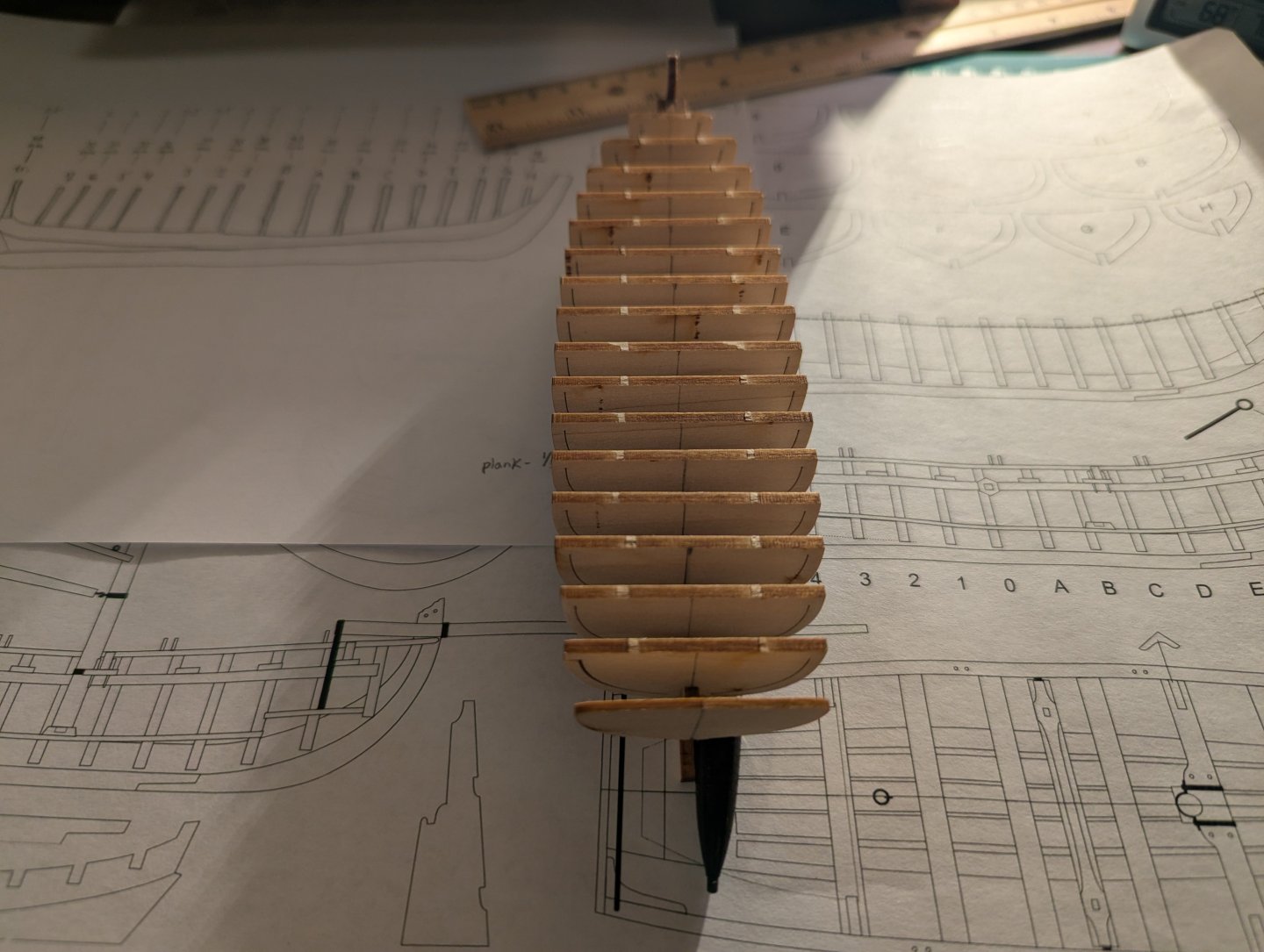 1. Hi all, For 10+ years, I’ve been a forum member and admired the craftsmanship of others’ builds. I’ve dabbled in plastic models but have wanted to build a wooden model ship for some time. A while ago, I bought the Model Shipways 18th Century Longboat thinking it would be a good first model (not knowing that some have advised against this as a first build). Nevertheless, my goal is to finish building the longboat as my first wooden model ship project. Mine is yet another longboat build log by a complete beginner so it may not be a good guide to others. For that, I’d recommend BobF’s build log for the longboat, which I’ve been primarily following. I started building the kit, not knowing anything, and got confused by how to shape the rabbet. I put the kit away for some months until I came back to it and figured out how to complete that step. Gluing the bulkheads seemed pretty straightforward. I tried to place and glue them as squarely as I could. Here is what the model looked like before planking (I apologize for the low lighting conditions of my photos): At one point, I accidentally broke the stem and ended up gluing it back together. I didn’t realize that one of the spare parts included in the kit was an extra stem that I could have used instead. Next, I got intimidated by the planking phase and put the kit away again for many months. Recently, I got interested in building again and persevered to grasp the basics of planking. This video, though I did not follow it precisely for this build, was helpful for a general understanding of the geometries involved in planking. After some research, I began to understand what the instructions were describing. I used the techniques of wetting the planks, shaping them with jigs and clips, and drying the wood with a hair dryer. I finally placed the first plank! It may be a commonplace step for most, but to me it’s a relief that I’ve finally wrapped my mind around the rudiments of planking. I at least know how to approach the rest of the process and will update my log as I build more of the longboat. One difficulty I’m running into is trying to get the plank to stick to every bulkhead with the slow-drying wood glue. It keeps popping away from some of the bulkheads. I’m wondering whether I should try using pins (though the small wooden pieces seem too small and fragile) or adding a bit of CA glue to a few select bulkheads for faster adhesion. Thanks for following along so far! Alex