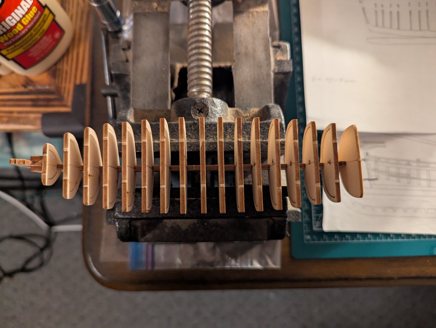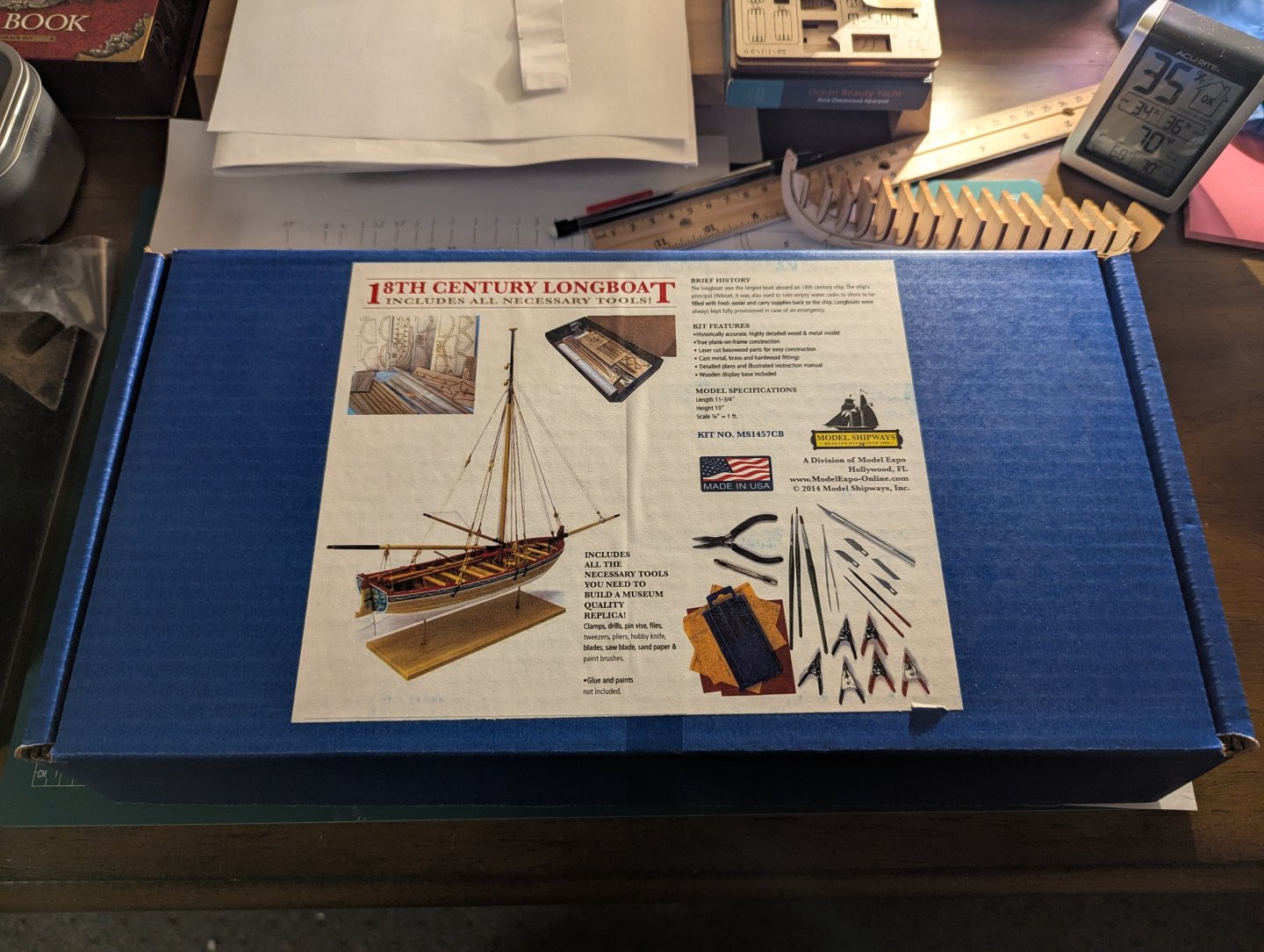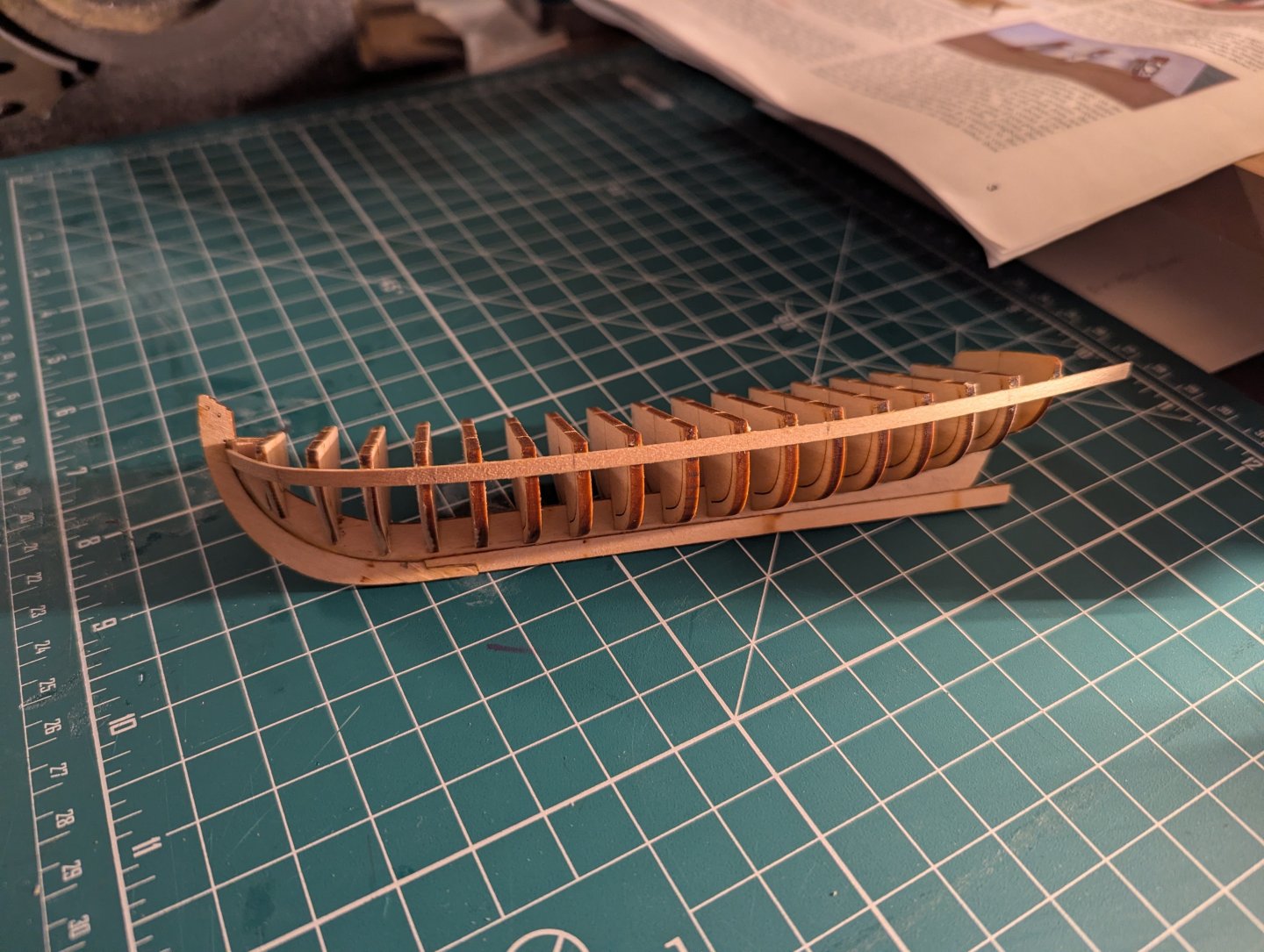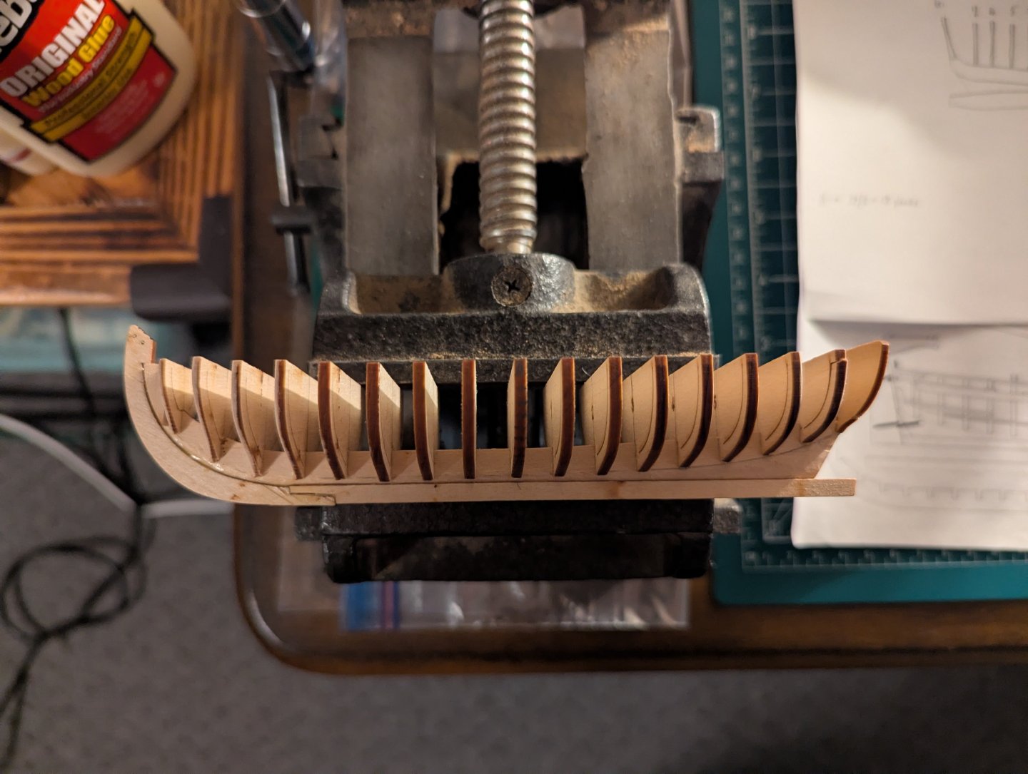 1. Hi all, For 10+ years, I’ve been a forum member and admired the craftsmanship of others’ builds. I’ve dabbled in plastic models but have wanted to build a wooden model ship for some time. A while ago, I bought the Model Shipways 18th Century Longboat thinking it would be a good first model (not knowing that some have advised against this as a first build). Nevertheless, my goal is to finish building the longboat as my first wooden model ship project. Mine is yet another longboat build log by a complete beginner so it may not be a good guide to others. For that, I’d recommend BobF’s build log for the longboat, which I’ve been primarily following. I started building the kit, not knowing anything, and got confused by how to shape the rabbet. I put the kit away for some months until I came back to it and figured out how to complete that step. Gluing the bulkheads seemed pretty straightforward. I tried to place and glue them as squarely as I could. Here is what the model looked like before planking (I apologize for the low lighting conditions of my photos): At one point, I accidentally broke the stem and ended up gluing it back together. I didn’t realize that one of the spare parts included in the kit was an extra stem that I could have used instead. Next, I got intimidated by the planking phase and put the kit away again for many months. Recently, I got interested in building again and persevered to grasp the basics of planking. This video, though I did not follow it precisely for this build, was helpful for a general understanding of the geometries involved in planking. After some research, I began to understand what the instructions were describing. I used the techniques of wetting the planks, shaping them with jigs and clips, and drying the wood with a hair dryer. I finally placed the first plank! It may be a commonplace step for most, but to me it’s a relief that I’ve finally wrapped my mind around the rudiments of planking. I at least know how to approach the rest of the process and will update my log as I build more of the longboat. One difficulty I’m running into is trying to get the plank to stick to every bulkhead with the slow-drying wood glue. It keeps popping away from some of the bulkheads. I’m wondering whether I should try using pins (though the small wooden pieces seem too small and fragile) or adding a bit of CA glue to a few select bulkheads for faster adhesion. Thanks for following along so far! Alex