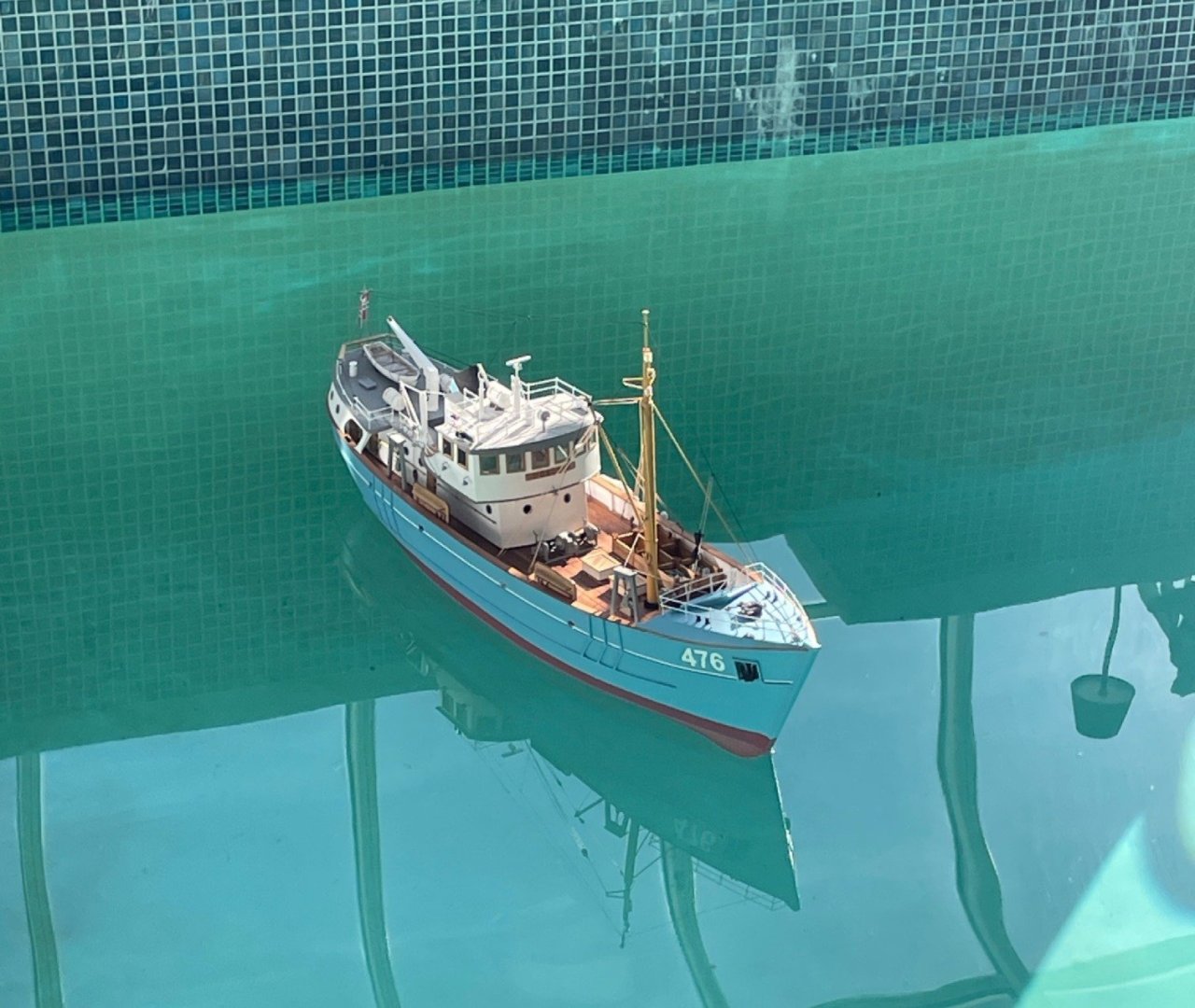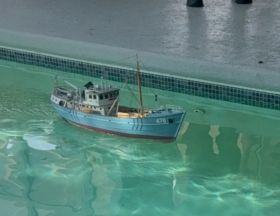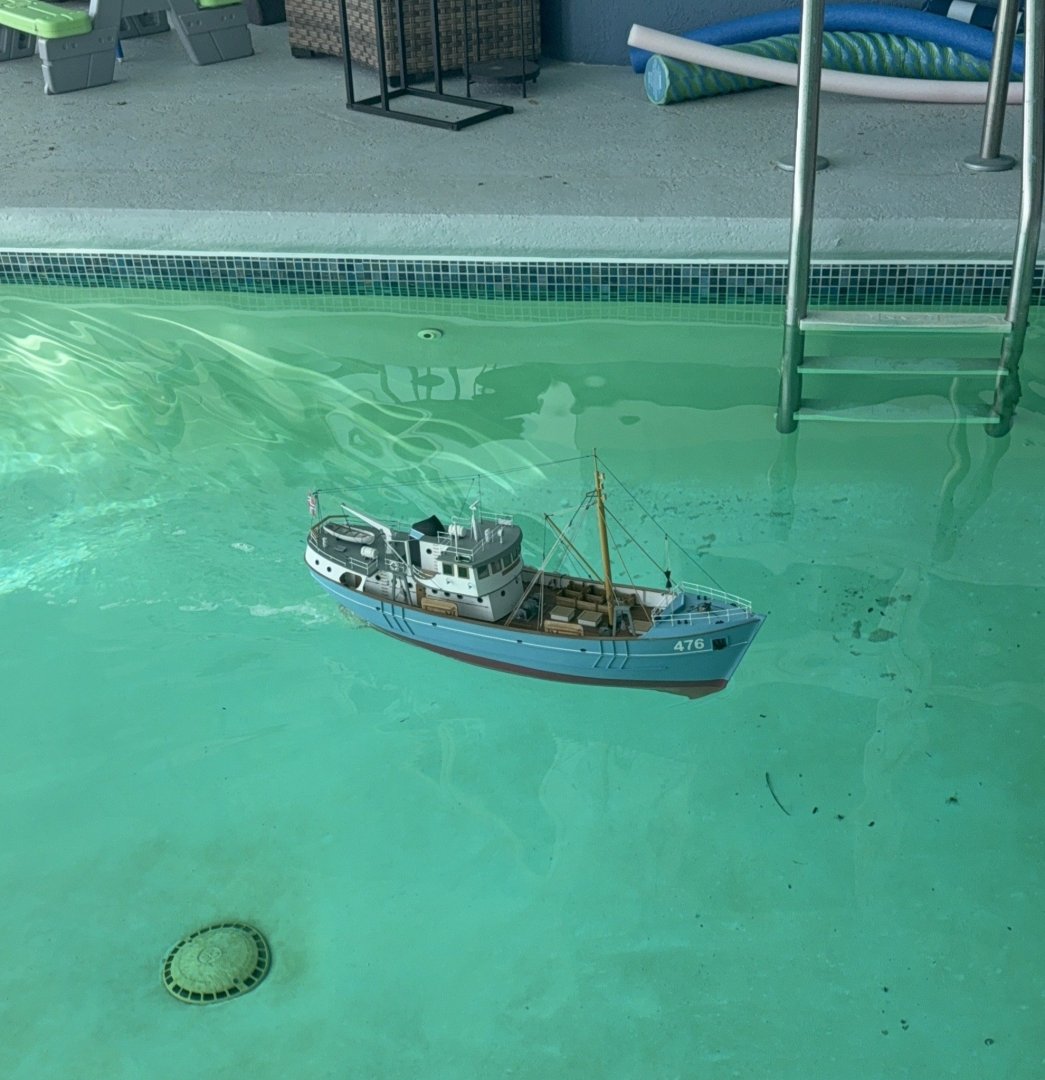 Getting close to the end The cables running from the deck cranes to the windlass were run along the deck and through the deck pulleys. Next I installed what might be a forestay running from the masthead down to a gusset plate at the bow. From this stay, a halyard was rigged down to a handrail post located on the bow deck. On this halyard I installed a wooden ball that was shown on the plans, though initially I had no idea what it’s called or its purpose. After showing a photo of it to my brother-in-law— an experienced sailor—I learned it’s an anchor signal ball. Further research confirmed that an anchor ball (or "day shape") is a black spherical marker used by vessels to indicate they are at anchor during daylight hours. Learned something new! Next, what I assume are antenna wires were installed running from the masthead aft to the wire support tower at the stern. These wires need to be easily removable so the cabin could be lifted off the model. To achieve this, I incorporated small hooks at the ends of the lines that attach to the wire support tower at the stern, allowing for simple detachment and reattachment. I also attached small hooks to the wires that run from the antenna wires down to the cabin roof deck for easy removal and reattachment. The ship’s number decals were added, The plastic fish were painted and placed into the fish storage bins. (they don't look to fresh 🫢) I also added several rope coils Nameplate installed Overall to date. Thanks for looking in and for the likes