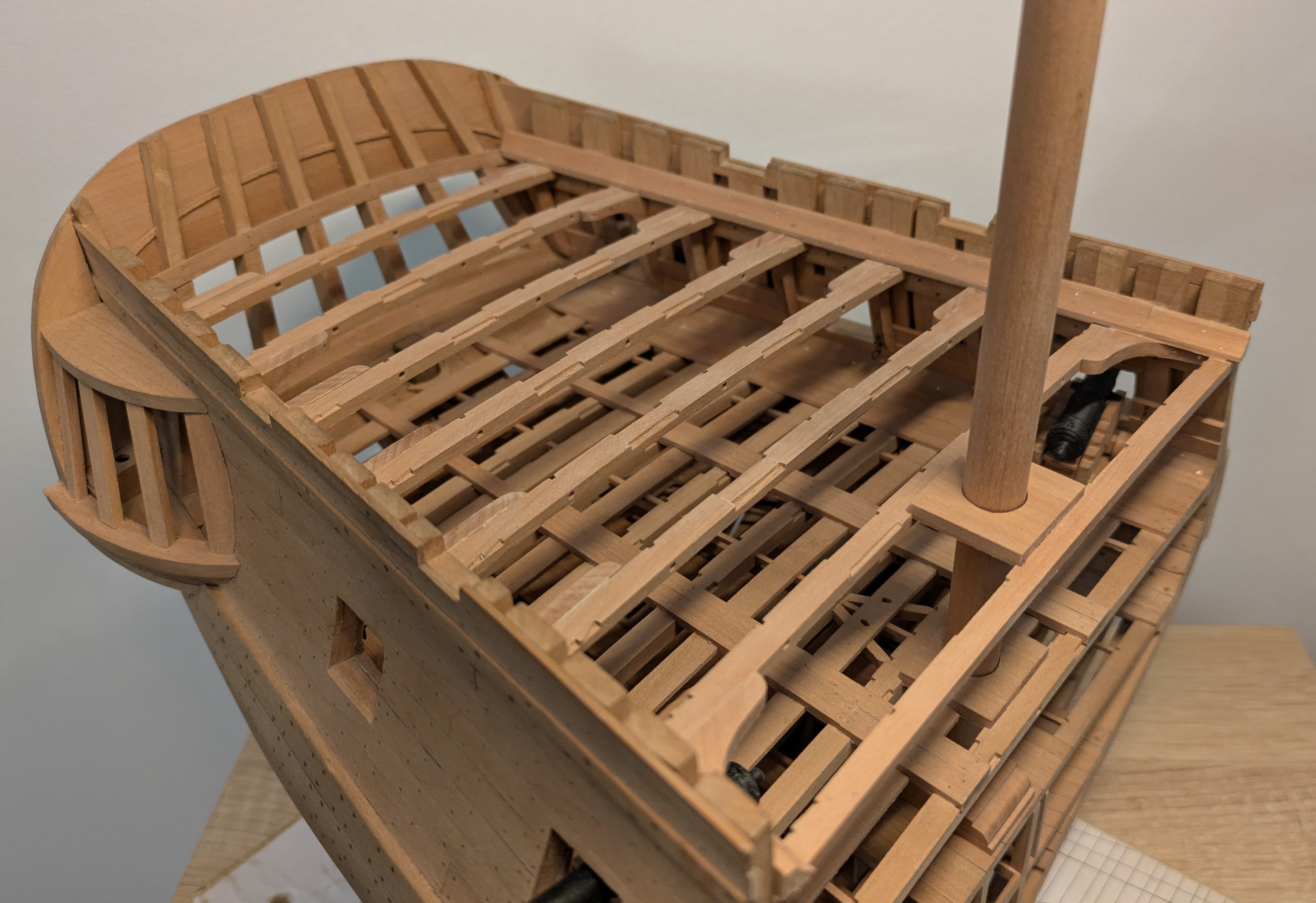 I've added the missing beam and all the knees, thanks again @druxey and everyone else for your input! With this I can continue with the quarterdeck: This is the view of the main deck and the captain's cabin: I decided not to add too much interior planking so the frames are still visible. It might not look as nice as the lower deck area which is completely planked, but having put that much work into the frames I didn't want to hide them away. When the deck is planked with a few strakes I can rig the rudder and then complete all the small details I've been putting off.