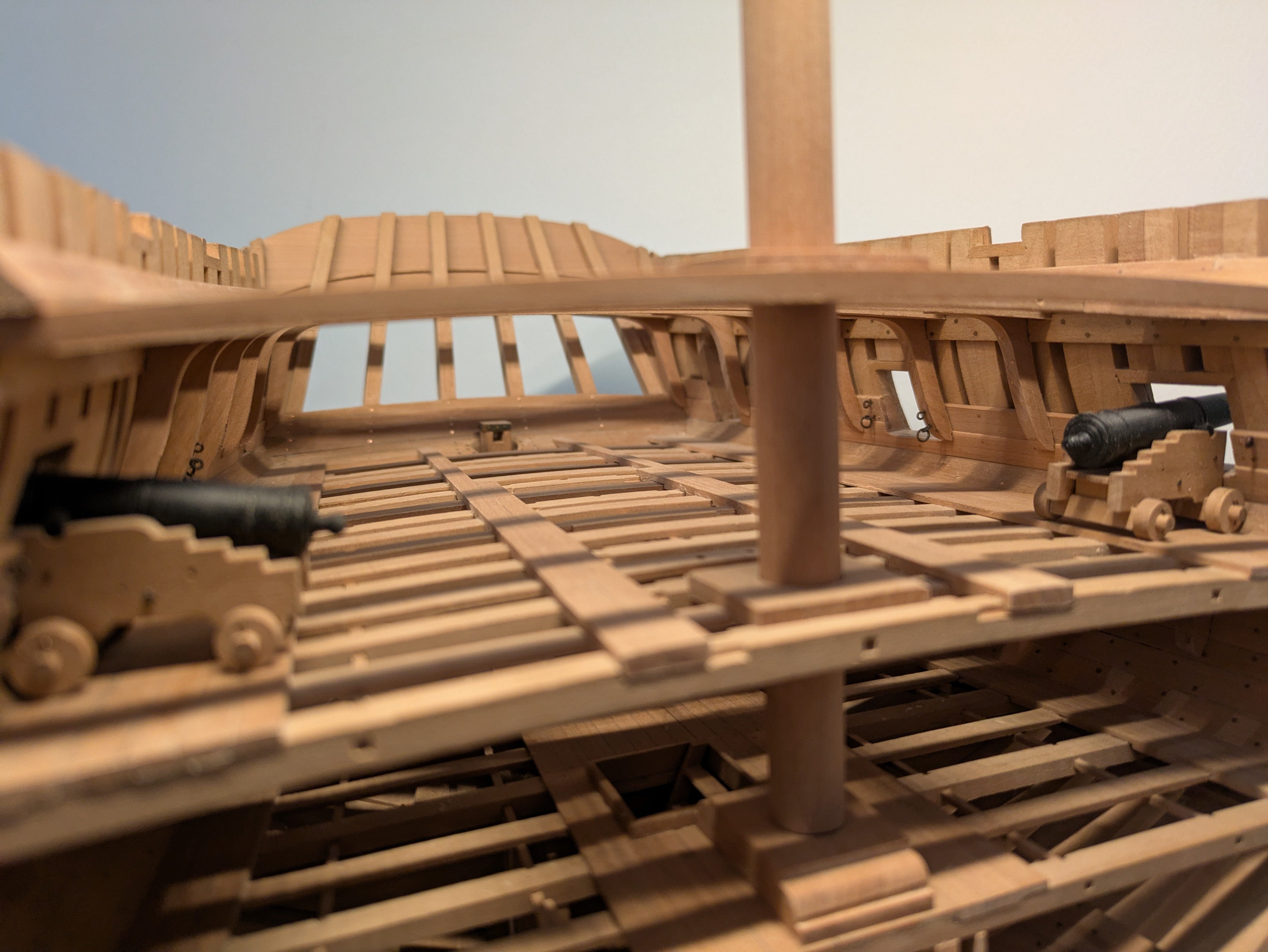 I haven't posted here for quite some time, but nor have I progressed much. A friend of mine created the guns in 3d and I got them printed in resin, however I wasn't at all happy with the result so I got them printed in plastic instead. These turned out a lot better, but I'm not sure I'll use them. I'm considering turning them in bronze instead, though I've never tried turning metal. I'm now proceeding with the quarterdeck, I need this done before I can finish the rudder tiller and its rigging. Strangely there's a missing beam where the mizzen mast sits, I would have thought that area needed more reinforcement, although at least those beams will be supported by horizontal knees.