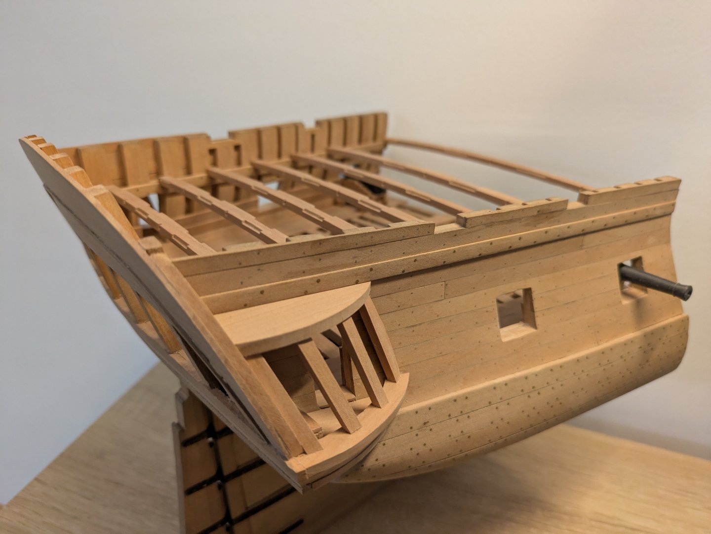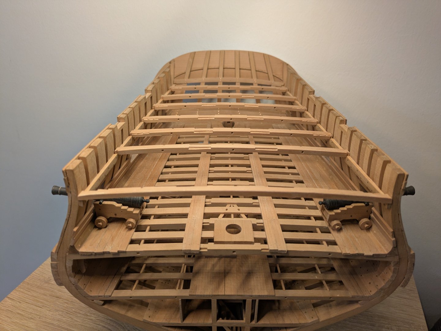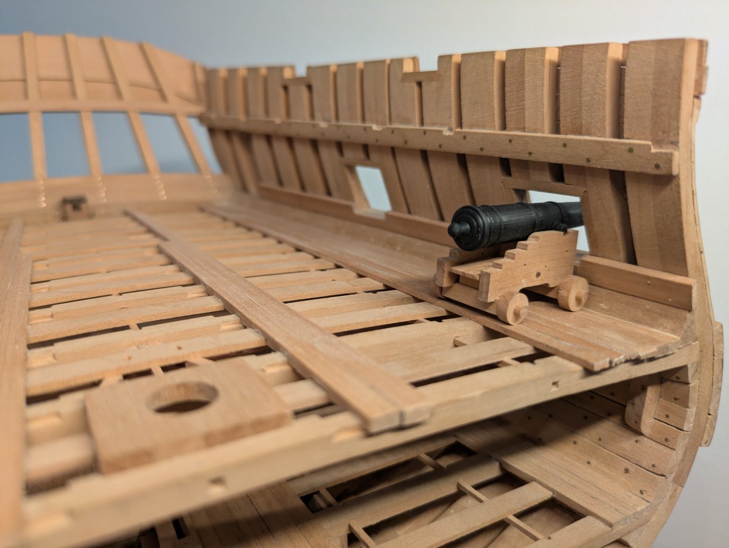 I haven't posted here for quite some time, but nor have I progressed much. A friend of mine created the guns in 3d and I got them printed in resin, however I wasn't at all happy with the result so I got them printed in plastic instead. These turned out a lot better, but I'm not sure I'll use them. I'm considering turning them in bronze instead, though I've never tried turning metal. I'm now proceeding with the quarterdeck, I need this done before I can finish the rudder tiller and its rigging. Strangely there's a missing beam where the mizzen mast sits, I would have thought that area needed more reinforcement, although at least those beams will be supported by horizontal knees.