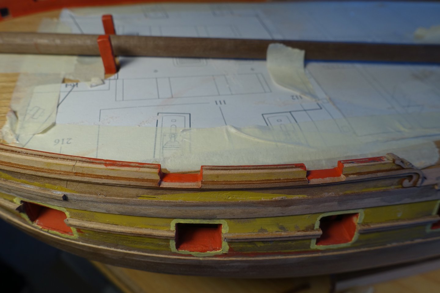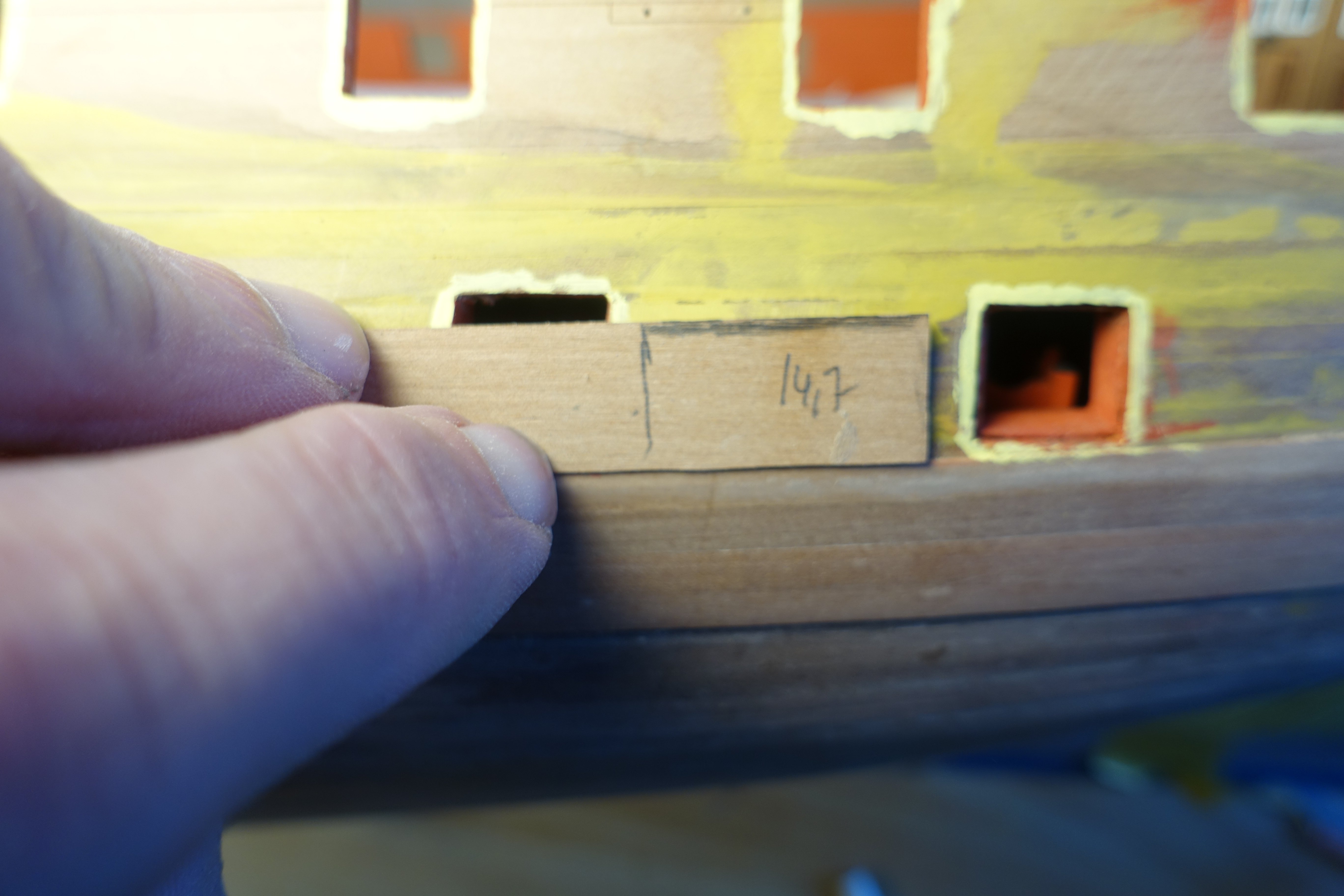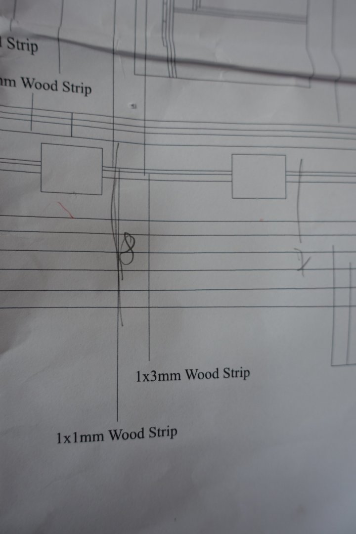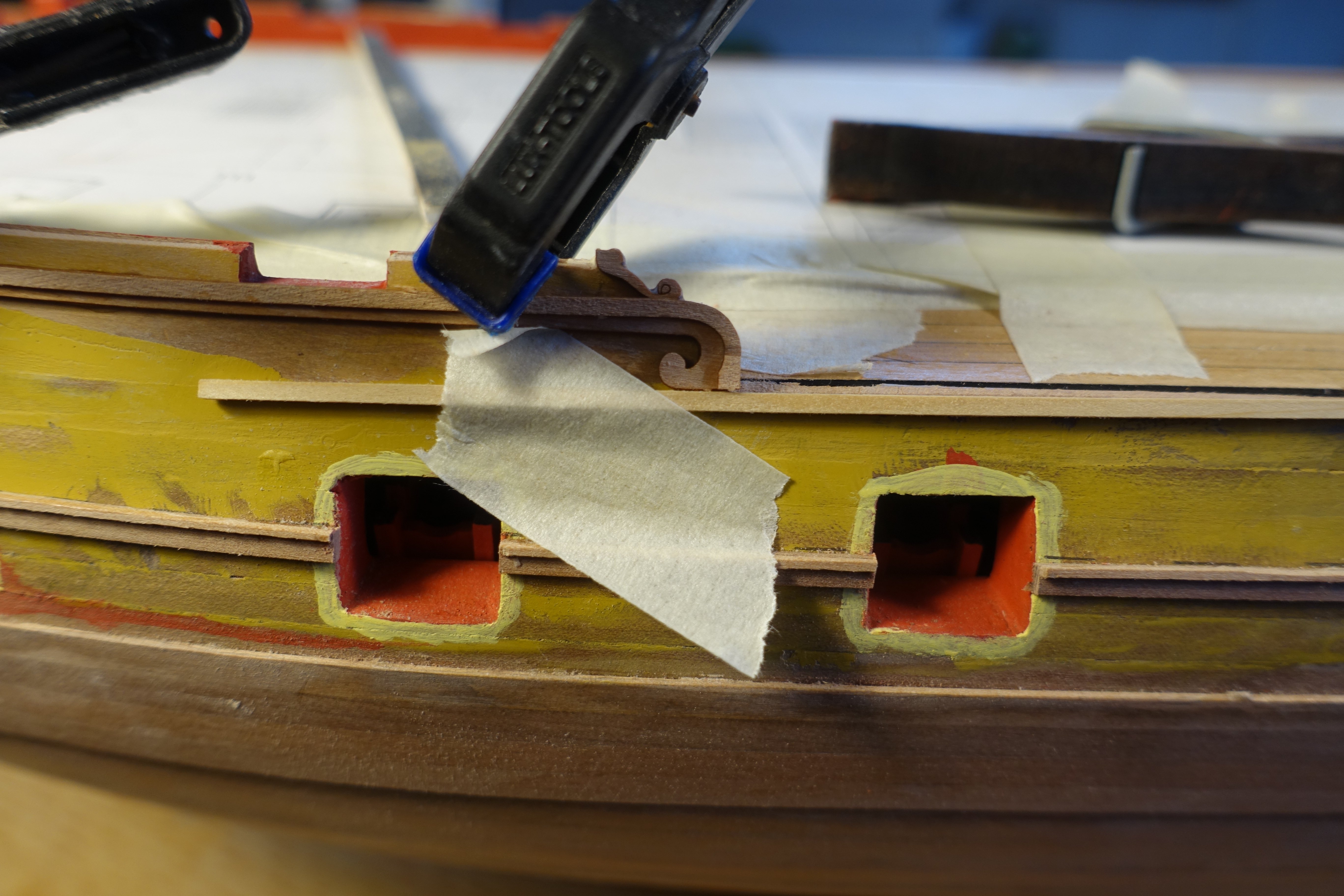 Decorative strips. I started with the strip directly above the wale, which runs partly over the gun ports. At first, I was a little confused because the manual describes that it is composed of a 3x2 mm and a 2x1 mm strip. Logically, these would then have to be bent over the short side. In the plan, this is corrected to 3x1 mm and 1x1 mm, which fits better. To standardise the distance to the wale, I first adjusted a 14.7 mm wide strip and marked the distances. I then glued the two strips together and shaped the bow area with heat. I then divided the entire strip into two parts so that I could adjust it to the bow and stern. I then joined the bow and stern sections together over a gun port. The other strips were attached according to the plans. To glue them in place, I applied small drops of PVA and CA glues alternately at intervals of approx. 10 mm. In order to align the gunwale correctly in the gangway area, I first applied a 2x1 mm thick strip directly to the roll-ups of the decorative strips. The plan shows that both the gunwales and the strip on top are slightly bevelled at the edge, creating a mitre. I wanted to attach the strip without a mitre. It seemed easier to me to fill the small gap with filler afterwards. The gunwales were glued flush with the orientation strip. Then the 3x1 mm strip was glued on. A 4x1 mm strip is glued under the 3x1 mm strip. I didn't do a very neat job in the stern area. A small gap appeared. The gap was filled with filler and sanded down. A 2x1mm strip is then glued onto the upper 3x1mm strip, which runs between the channels. This must be stepped down for a length of approx. 5mm before the gangway area, as it then covers the outer edge of the gunwale of the gangway and is therefore higher in this section. The small gap between the gunwales and this 2x1 strip was filled with filler and sanded down. In the area of the channels, the 2x1 mm strip was attached with an approx. 1 mm overhang. Once the channels are finally attached, it can still be reworked. The decorative strips in the areas of the gun ports were filed down. The gun ports were then painted. As already presented by Blue Ensign, the gap in the bow area was filled with a piece of wood, which was also painted. Otherwise, the cut lines are visible. The part would then have to be integrated into the gunwales later. All in all, attaching the decorative strips was a little more complicated than I had first thought. Next, the gunwales will be attached.