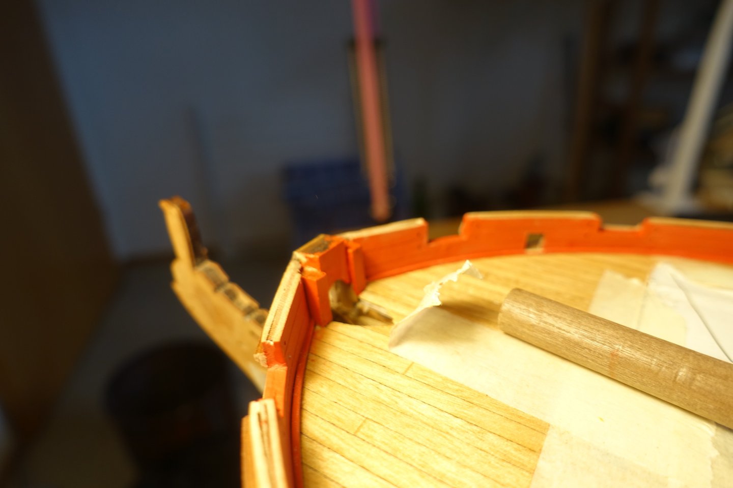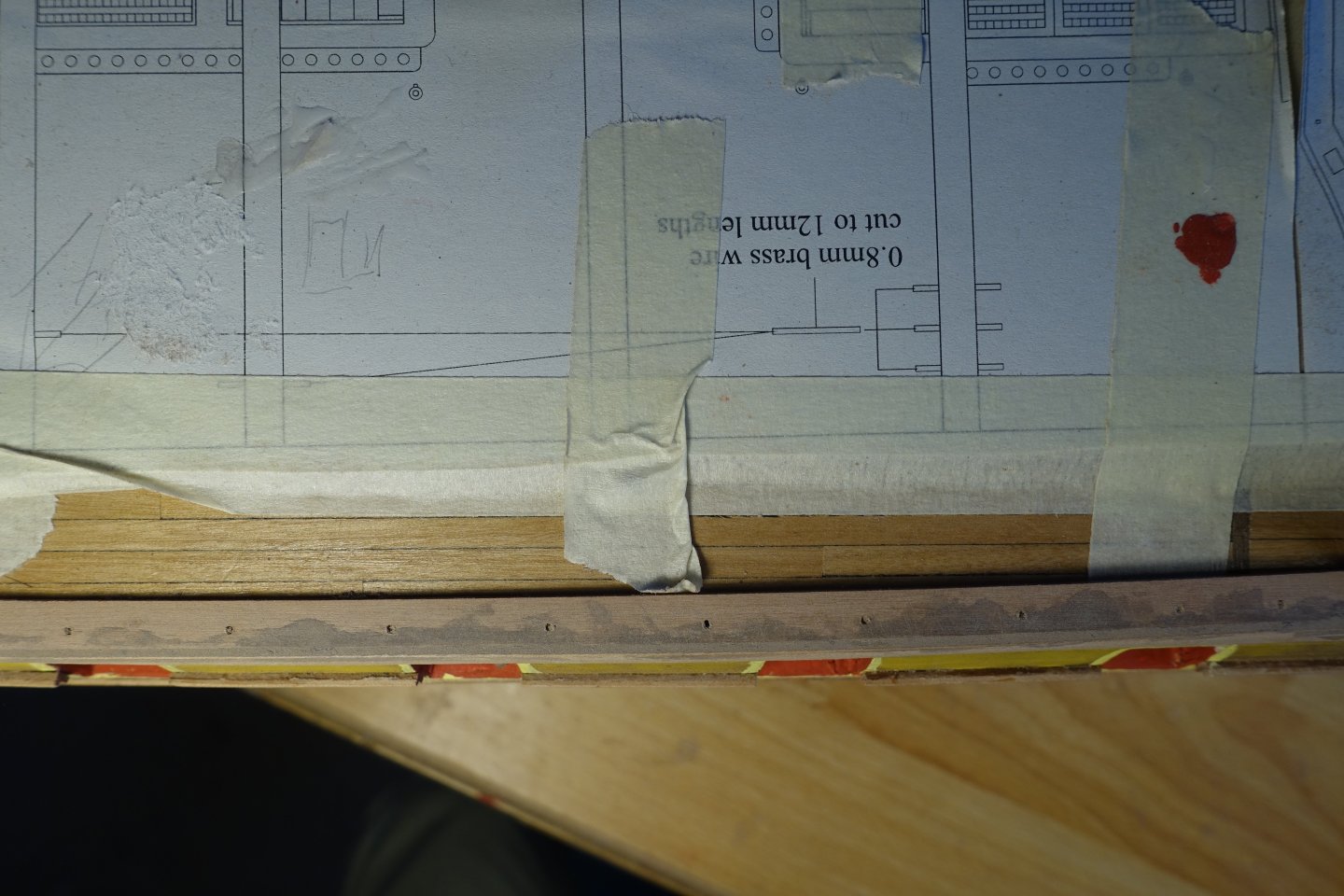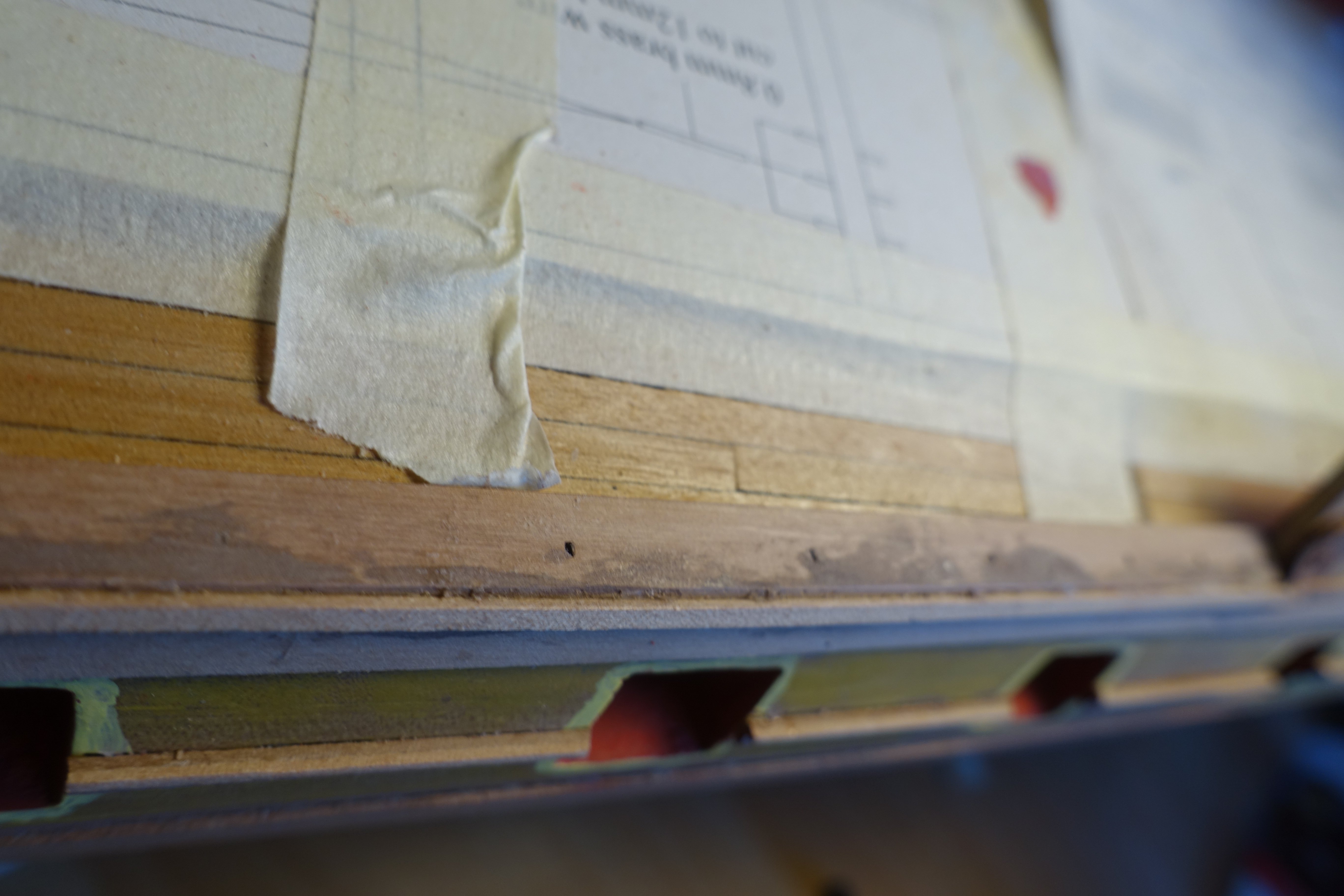Planking the gun deck Before planking, the transitions between the two parts of the inner bulwark were filled and sanded. The caulking of the deck planks was simulated with paint. To do this, 7 deck planks, each 12 cm long, were clamped together. The spirketting and upper strip were painted five times with heavily diluted paint so that the engraved lines were still visible. The inner bulwark was also painted with diluted paint and the openings for the deck fittings were tested. No regrinding necessary. Some gaps approx. 0.2 mm. These will be bridged by the planking. Then I went on with the planking. In the middle area, where the base for the oven will be positioned later, i.e. an area that will not be visible, I sanded with 120 grit sandpaper and tried out the coating. I will first apply wood wax and then cover it with matt varnish. In the picture, you can also see that there is a larger gap between two strips. Thankfully, this is the only one and is not a problem, as the base of the oven will go here. The holes for the eyebolts of the cannon rigging were drilled using a template. The deck was sanded manually (120, 180, 240 grade) and with a Dremel (320 grade) then treated three times with wood wax and then coated with diluted matt clear varnish. I was afraid that the spirketting would not be flush with the gun ports, but it was flush without me having to modify the strip. For the alignment of the upper strip, push pins were inserted through the holes for the eyelet bolts. The alignment of the holes in the strip matches the arrangement of the holes in the bulwark below. The small gap between the two parts of the spirketting was filled with diluted filler, sanded down and then painted over. Next, I will turn my attention to the cannons.
