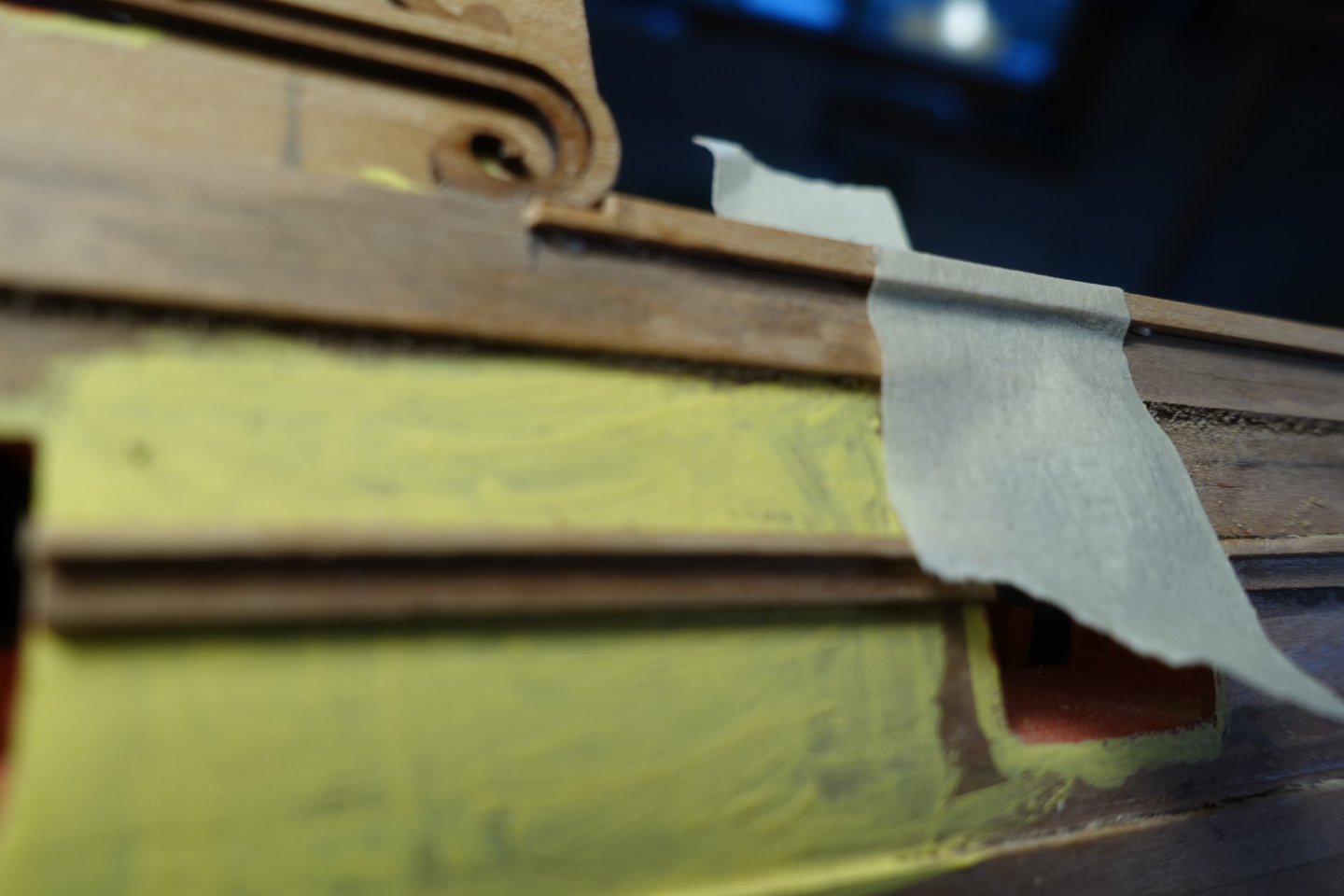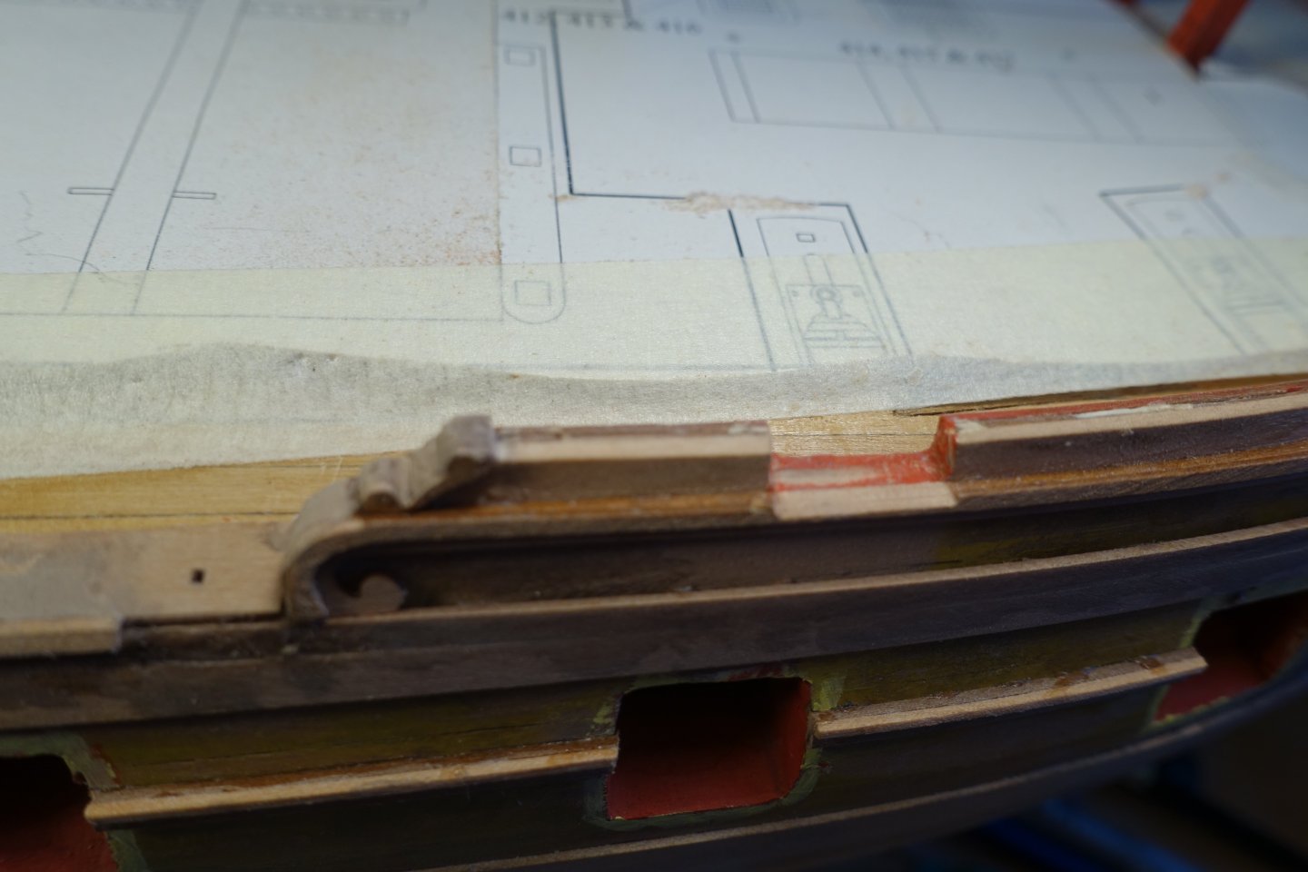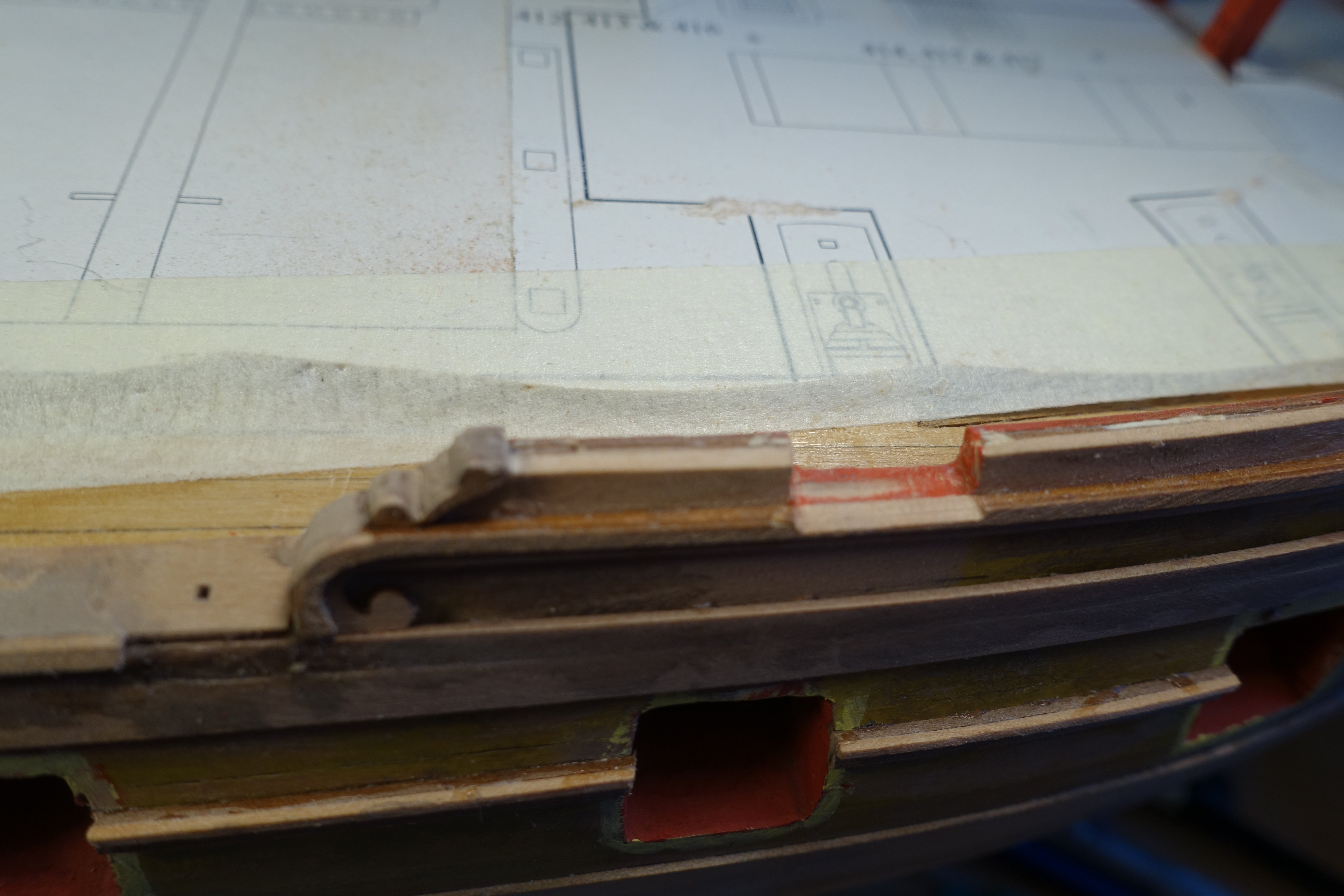 Gallery As already described in the other blogs, the gallery is not that easy. I had my first surprise after installing the inner panel. The window supports were bent, perhaps because I had wiped off the excess glue with a damp brush. The wood is very sensitive to moisture. The indentation was levelled out with filler. The outer panel was slightly bent with heat. However, I had problems making the transition from the outer panel to the hull smooth. At least in my build, the panel was too short to be sufficiently bevelled. Here, too, I used filler to create the transition. As suggested by Blue Ensign, I bent the lower panels also slightly with heat. A simple hairdryer was sufficient. The kit includes resin drops. However, if you adjust these according to the plans, they protrude quite a bit. These need to be set back to fit reasonably well. The kit also includes MDF drop moulds. However, I wasn't entirely happy with these either. I therefore decided to set the drops back, which meant that they protruded above the counter. To continue the protrusion, I first glued the MDF drops to the resin drops. However, when I continued sanding, the MDF-drops fell apart, so I glued on a 4x4mm wood strip. This was then sanded down further. After cutting to size, the drop was glued on. The gap is caused by the drop meeting the wale in the upper section. The gaps were filled with filler. Next, I will adjust the inner bulwarks. I think this is a little less complicated than the gallery.