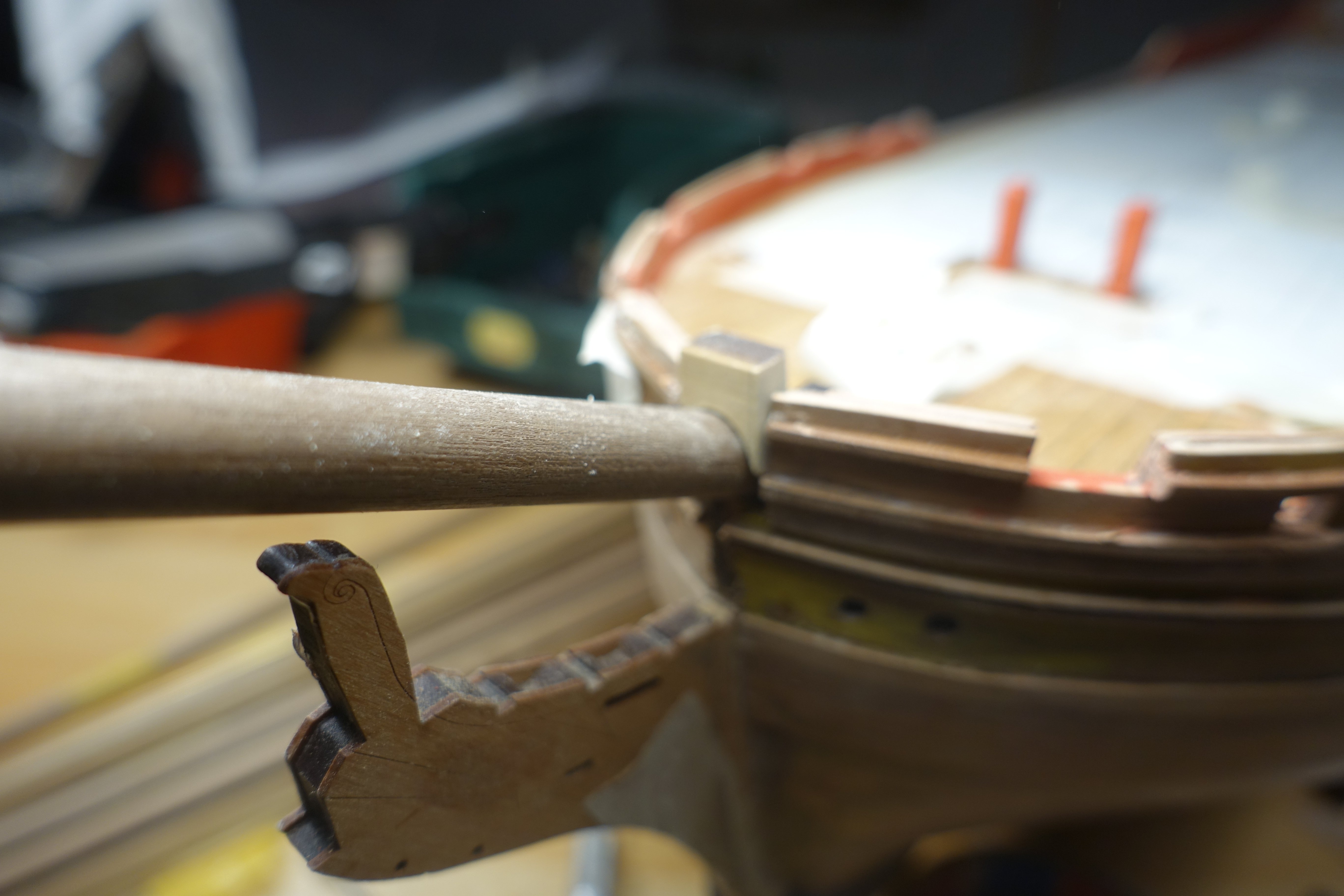 The beams were painted and coated with clear varnish and then glued in place. Several beams were inserted and the levelling was tested using two 10x10mm pieces of wood and then diluted PVA was applied to the joints on the MDF. In this way, the levelling was easily maintained. The anchor rope was laid The first beam at the bow has been panelled. I want to open the forecastle deck relatively wide and the panelling should cover the MDF behind it. The opening for the bowsprit was tested with a 10 mm dowel. The deck beams are largely in place. The two stern boat beams and their supports are not yet attached, as I still want to attach the gun crew and need space for this. The end beam of the quarterdeck has not yet been attached or painted. To level it, I had to deepen the cut-outs for the bitts by about 0.3 mm.