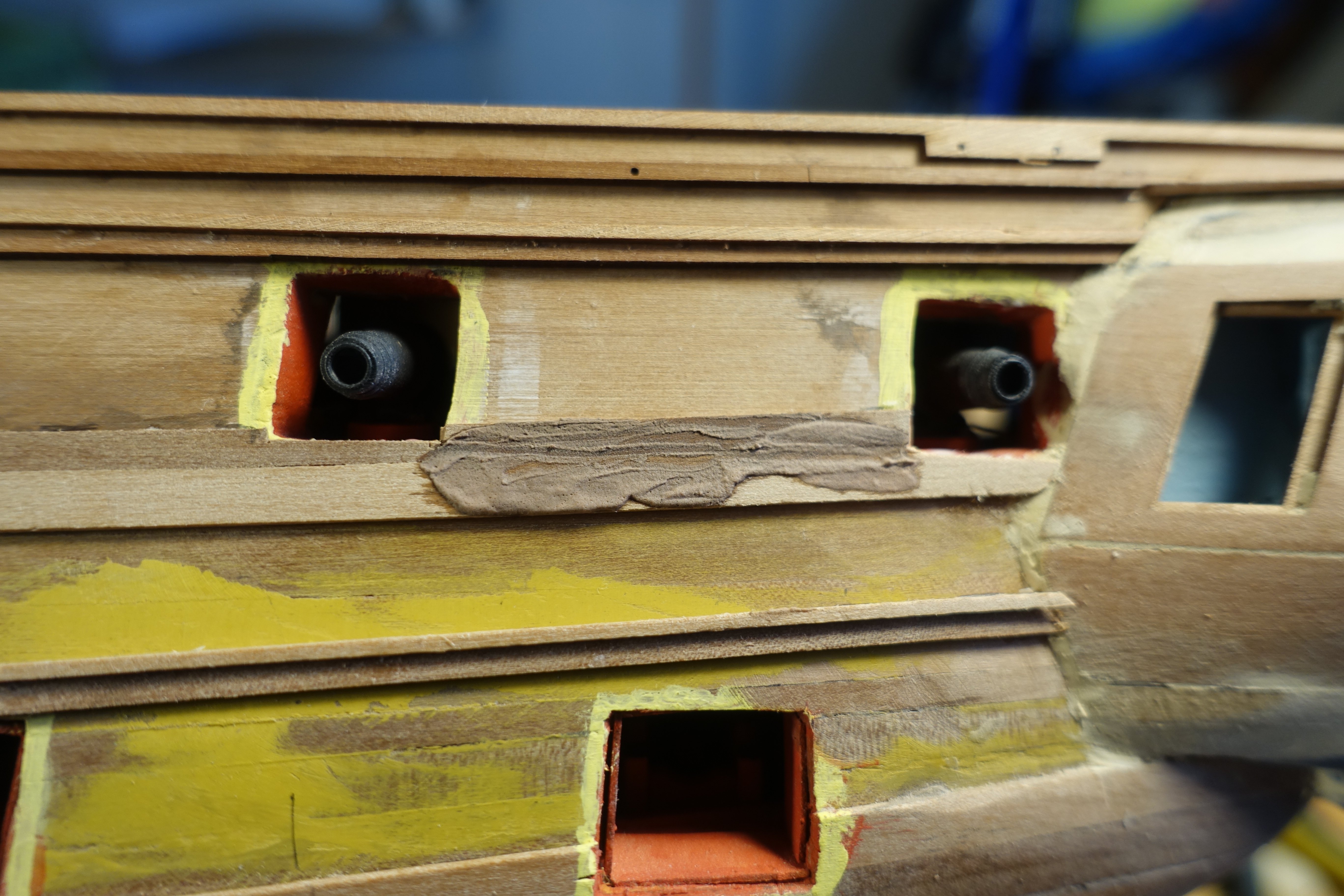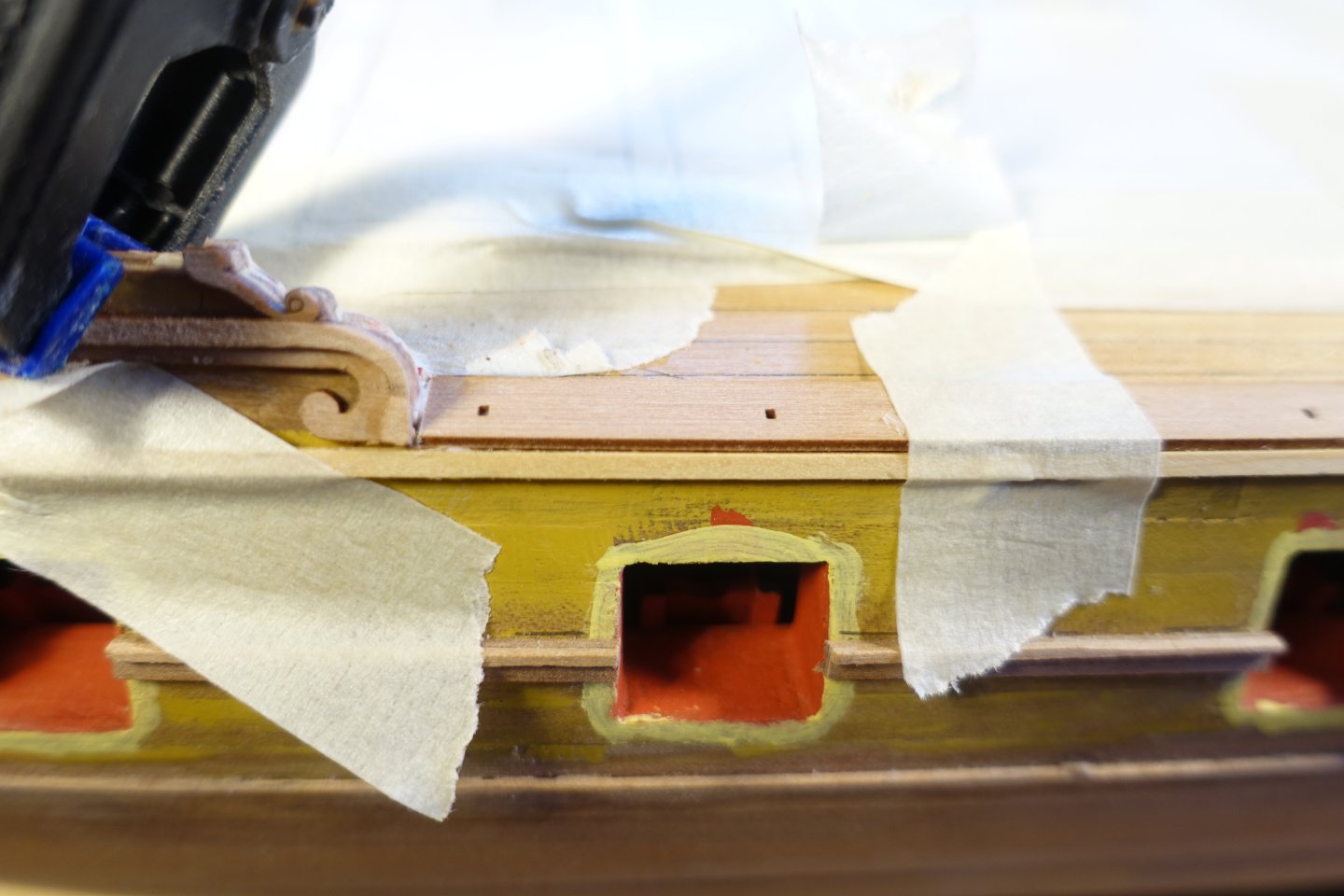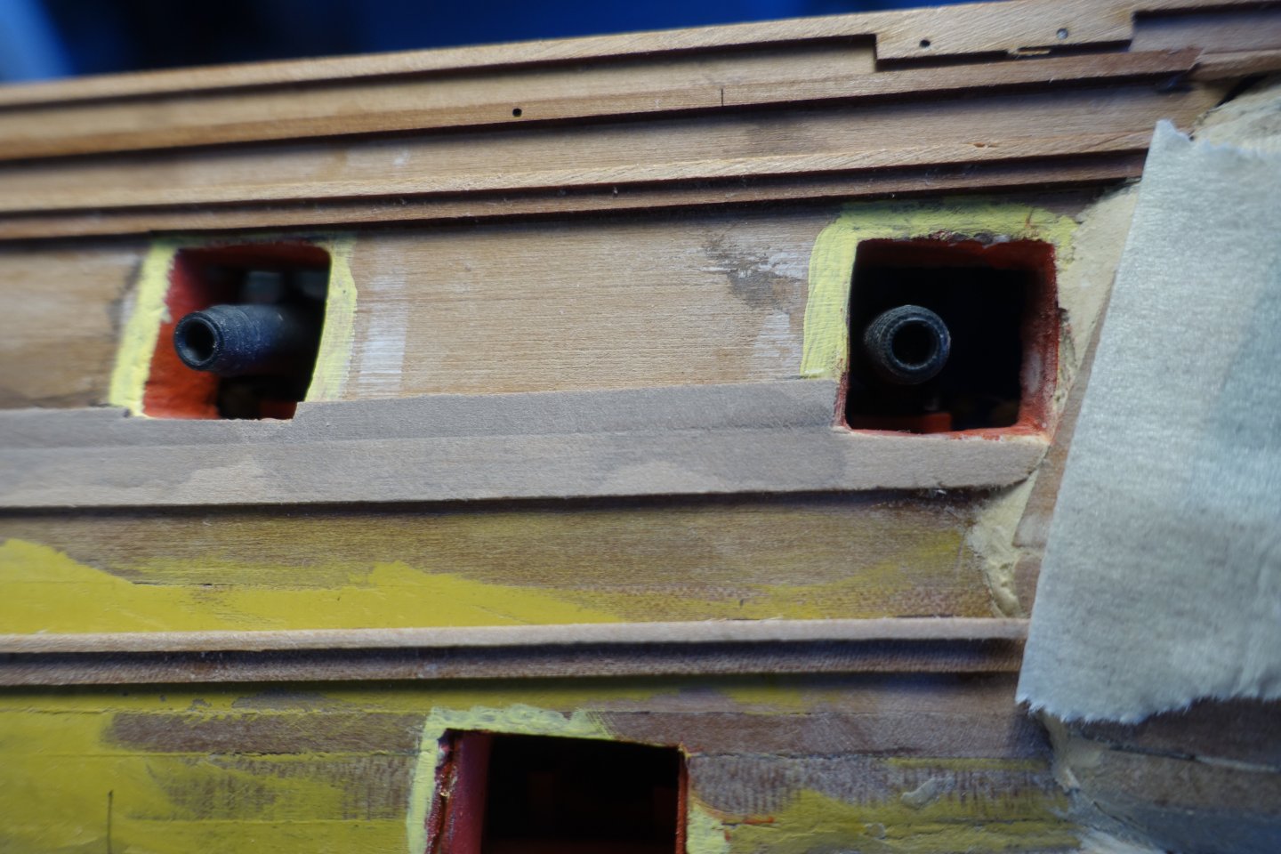 Brief update. Inner bulwark. The patterns for the inner bulwark were relatively easy to fit. The gun ports were lightly filled. 6305 Openings were sanded . After painting the gun ports, it became apparent that there was a gap between bulwark at the port side and the deck in the bow area. 6312 The gap was covered with a 1 mm x 1 mm strip. Subsequently, a strip was also added to the starboard side and the quarterdeck. Next, the outer decorative strips will be attached.