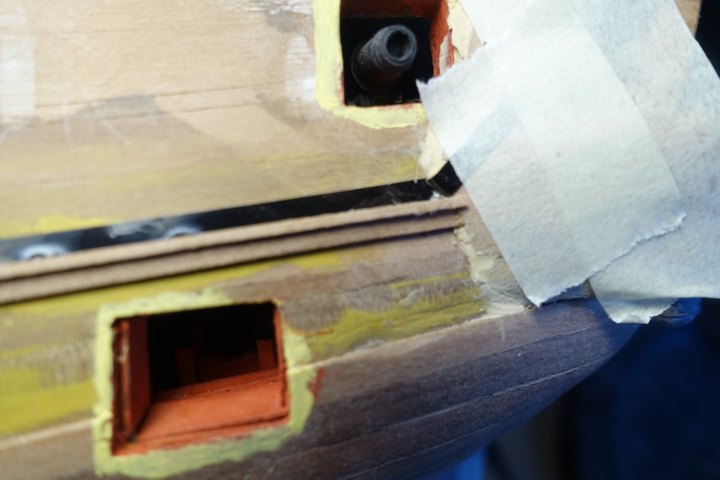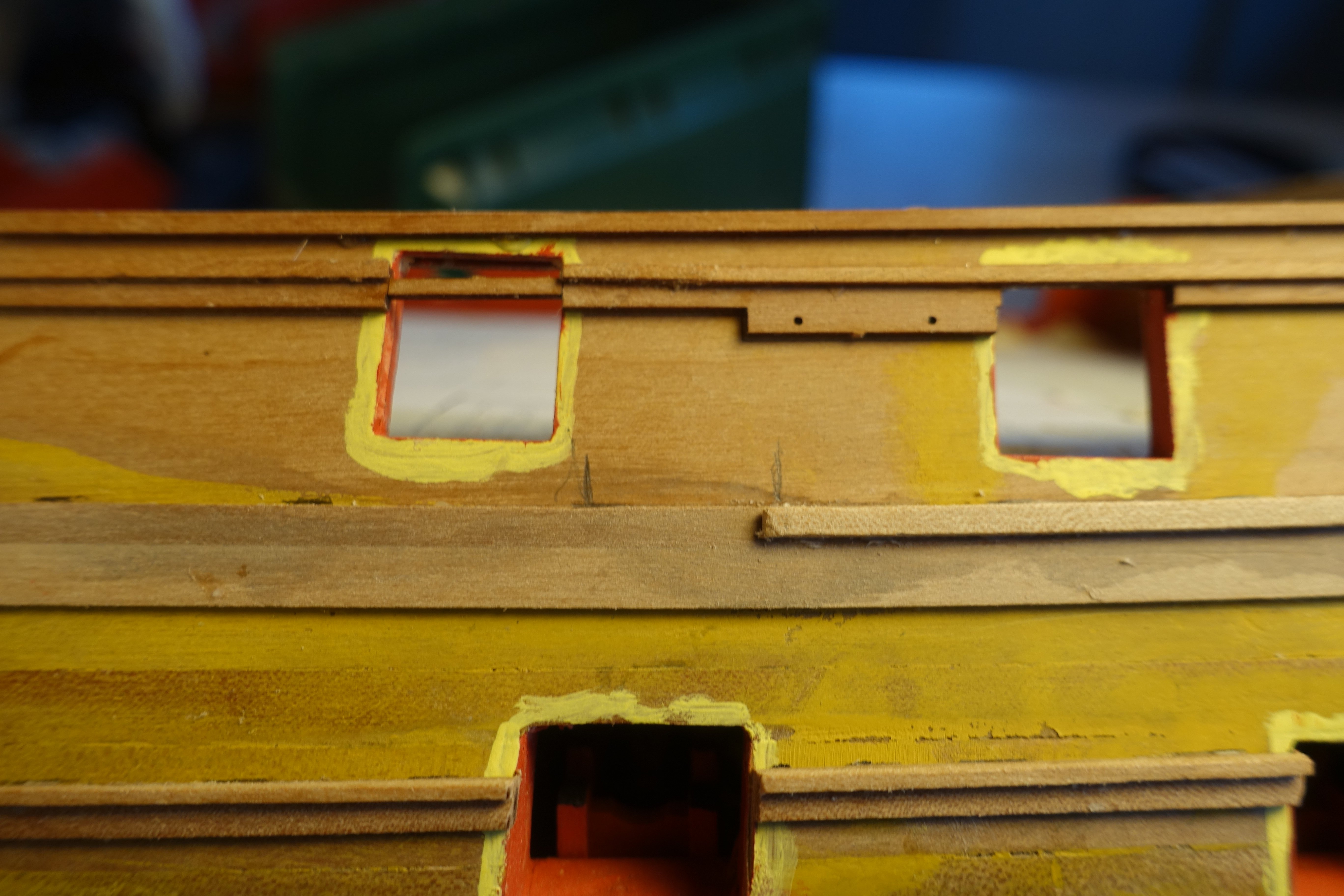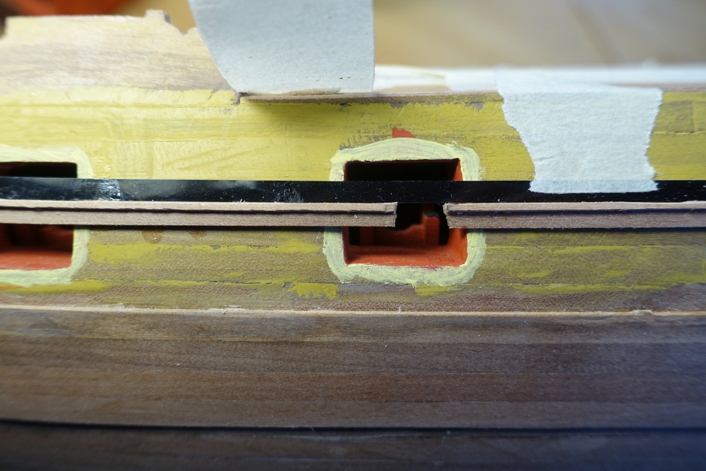 Brief update. Inner bulwark. The patterns for the inner bulwark were relatively easy to fit. The gun ports were lightly filled. 6305 Openings were sanded . After painting the gun ports, it became apparent that there was a gap between bulwark at the port side and the deck in the bow area. 6312 The gap was covered with a 1 mm x 1 mm strip. Subsequently, a strip was also added to the starboard side and the quarterdeck. Next, the outer decorative strips will be attached.