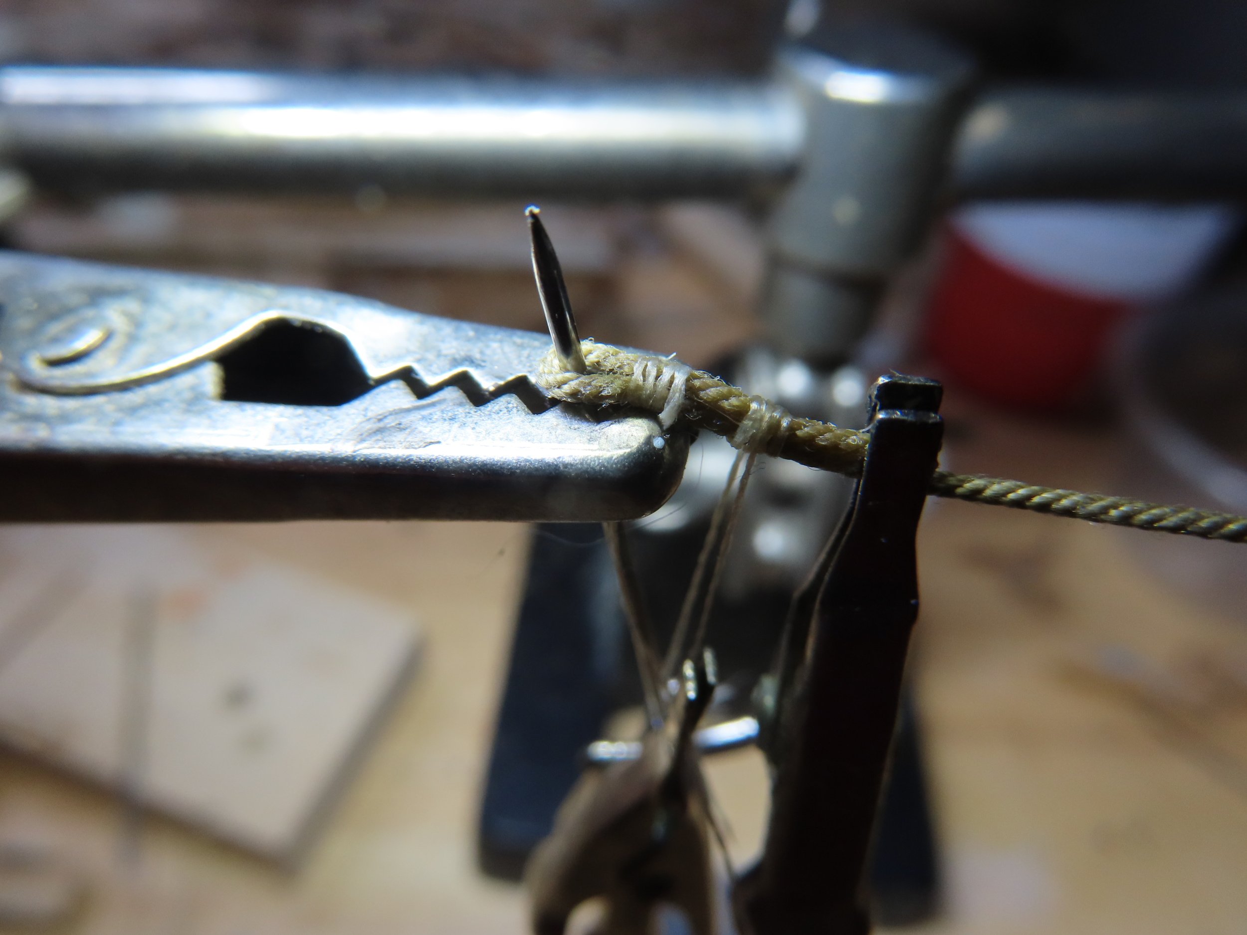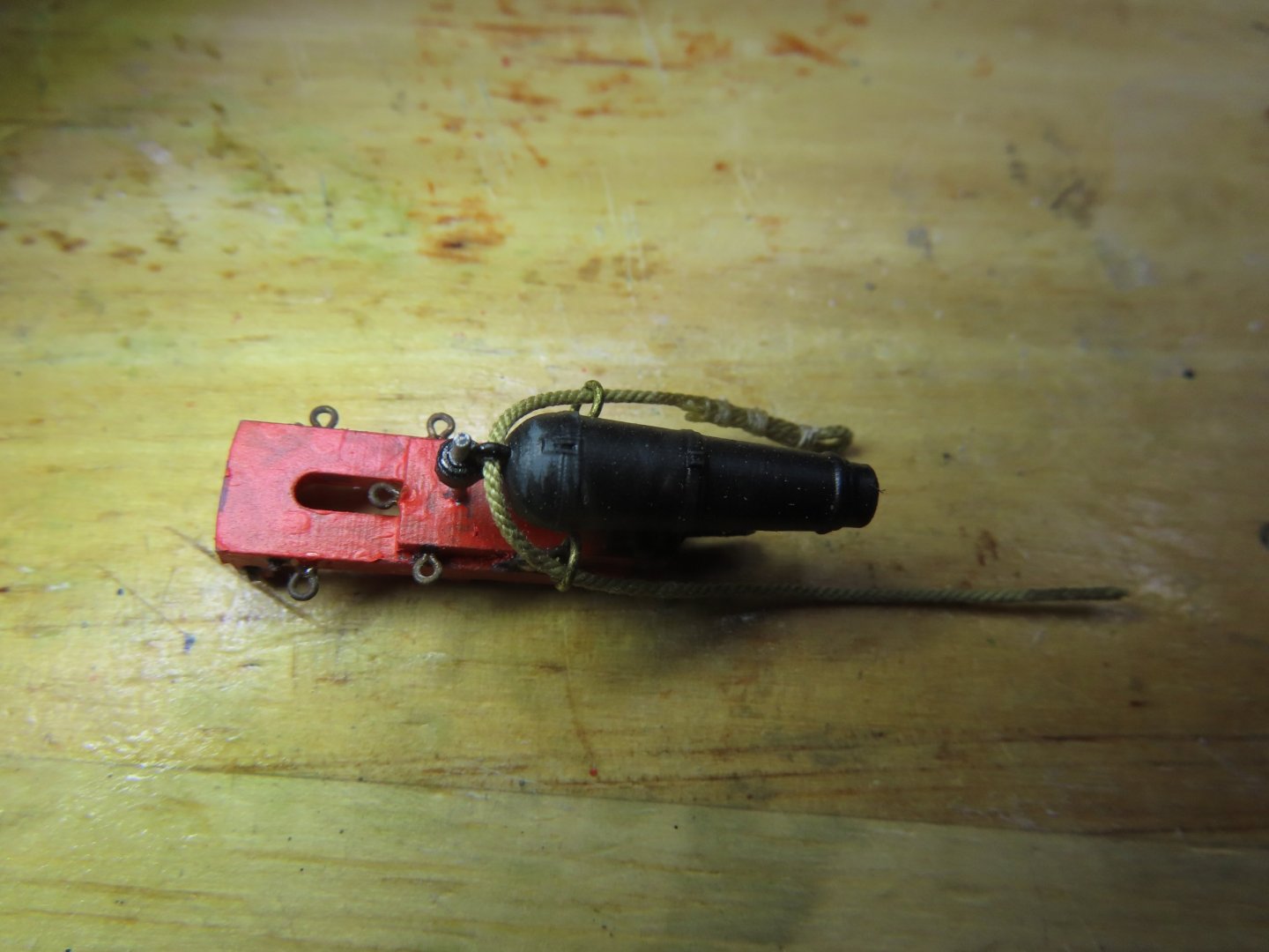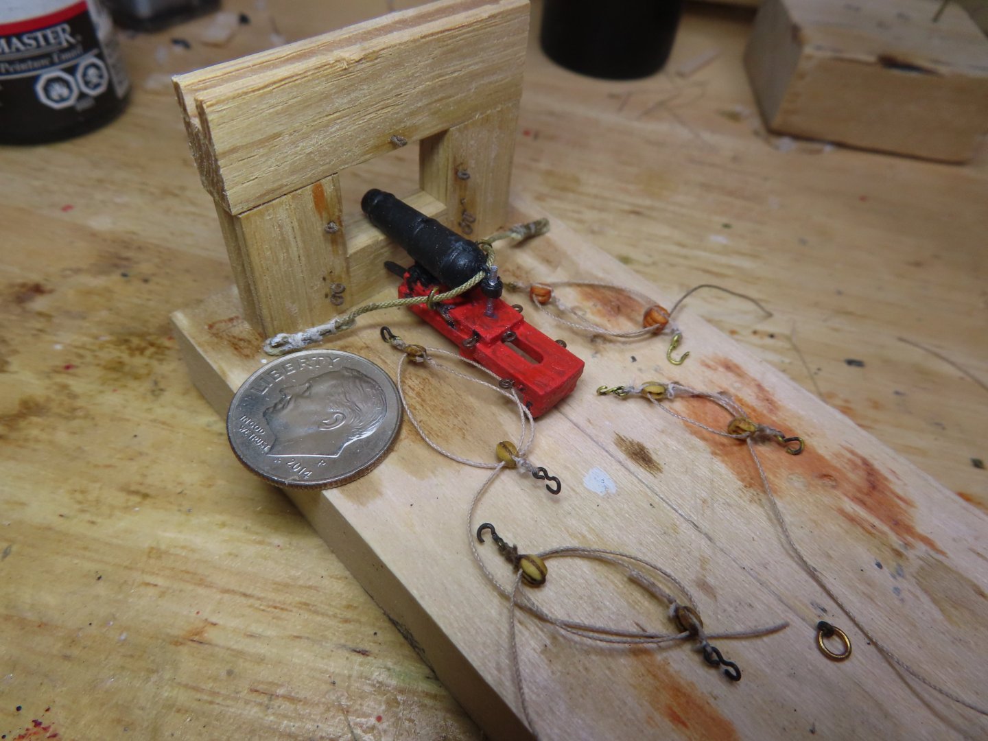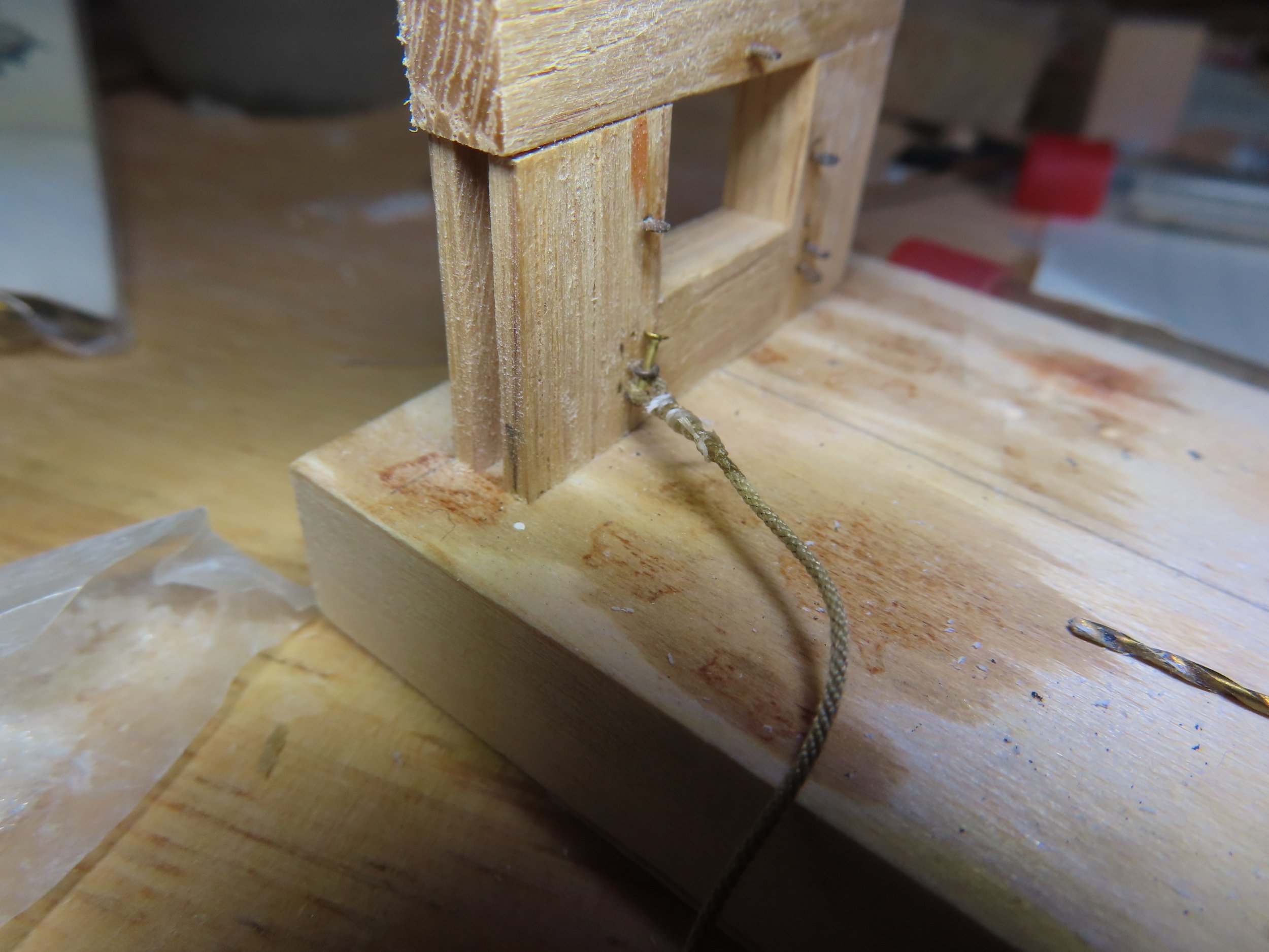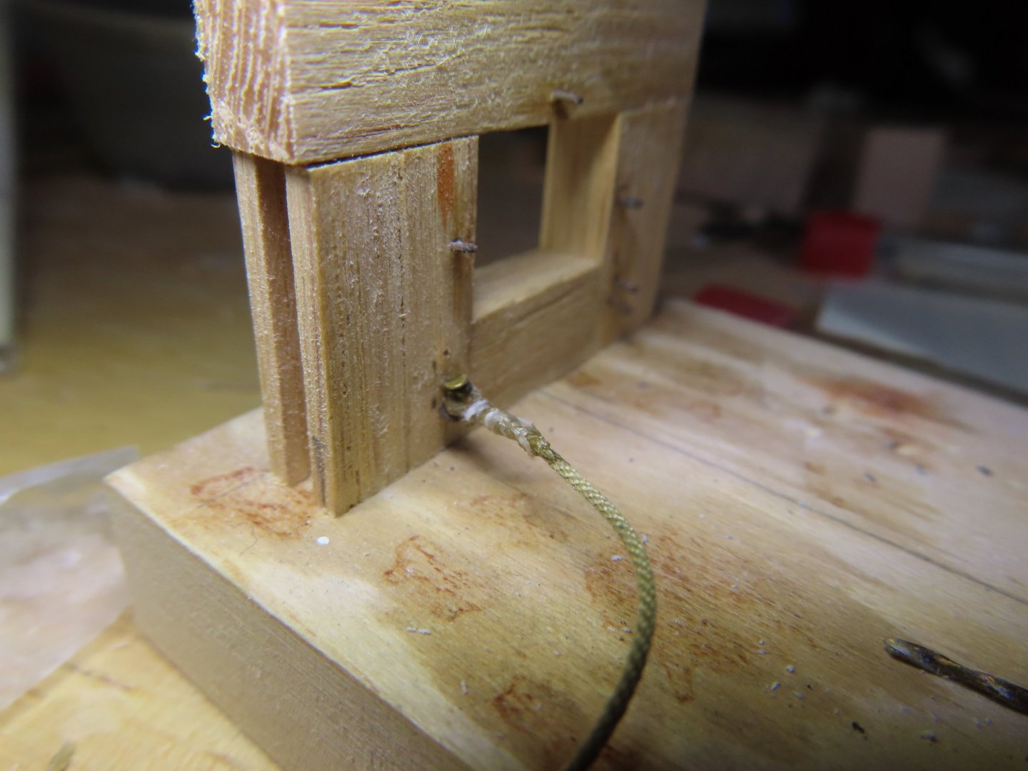 As is my masochistic custom of following the more difficult path, I chose to attach the recoil rope to the bulwark like I did on the gun deck by inserting the rope loop between two eyebolts mounted one above the other when the bulwarks were installed many years ago. Then a short drop bolt is inserted into the top eyebolt, though the rope loop, and out the bottom eyebolt. The drop bolt was made from a 3/8” long 0.025” shaft diameter flathead nail which was cut to 1/8” length. I apologize for the out of focus image. A zero depth of field, in a confined space, with a shaky hand are not a good mix. I didn’t realize I had a poor-quality photo till I was composing this post. So, I demonstrated the process using my gun port mockup.