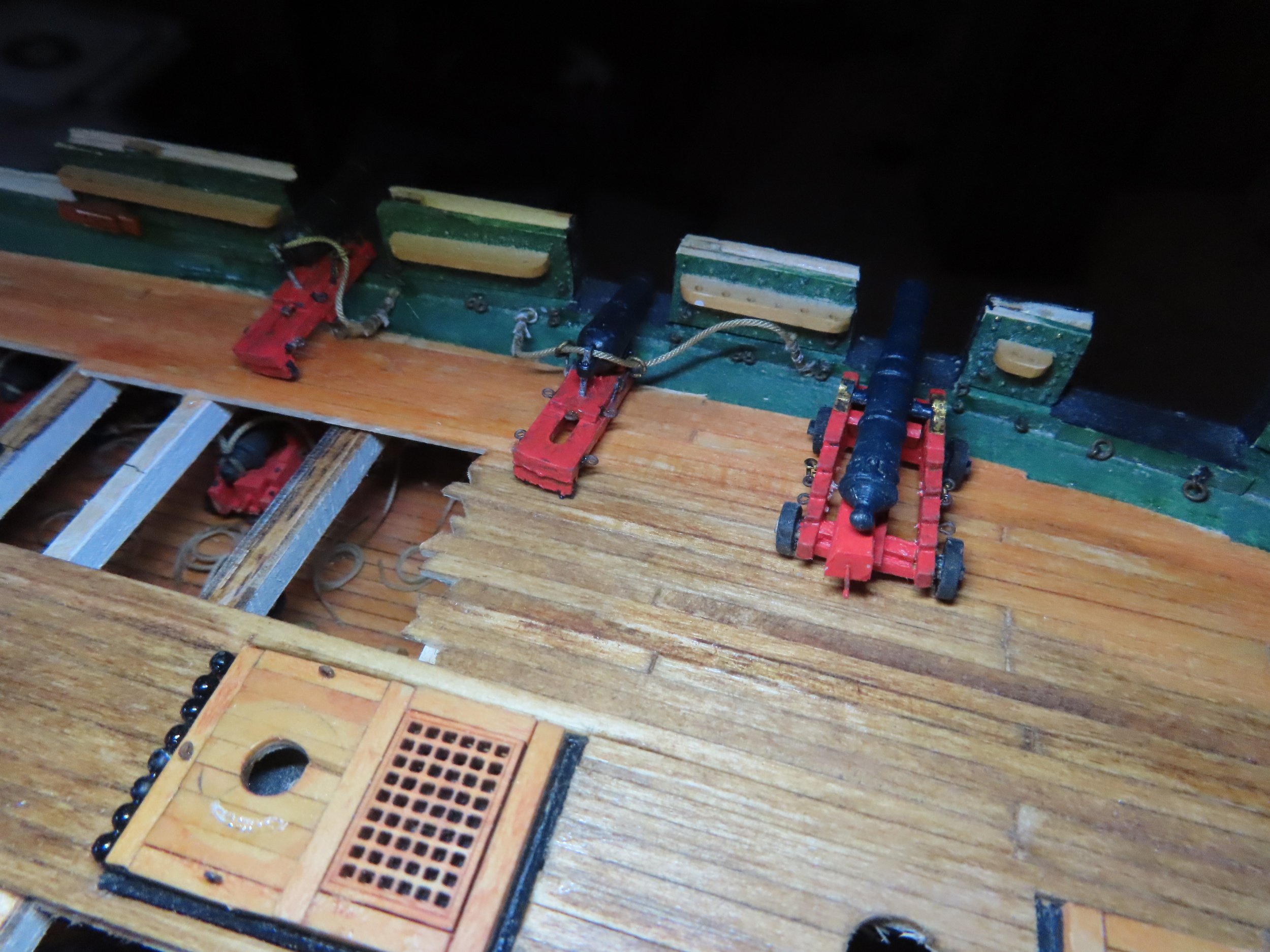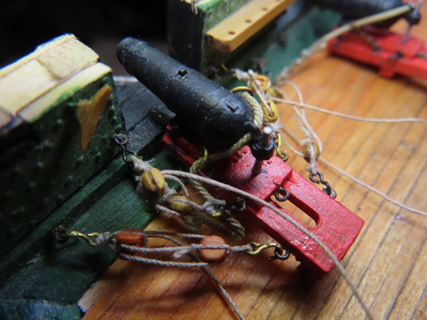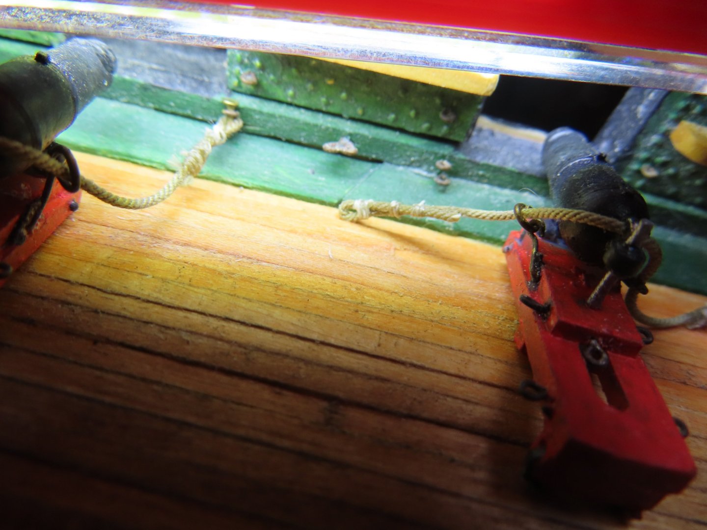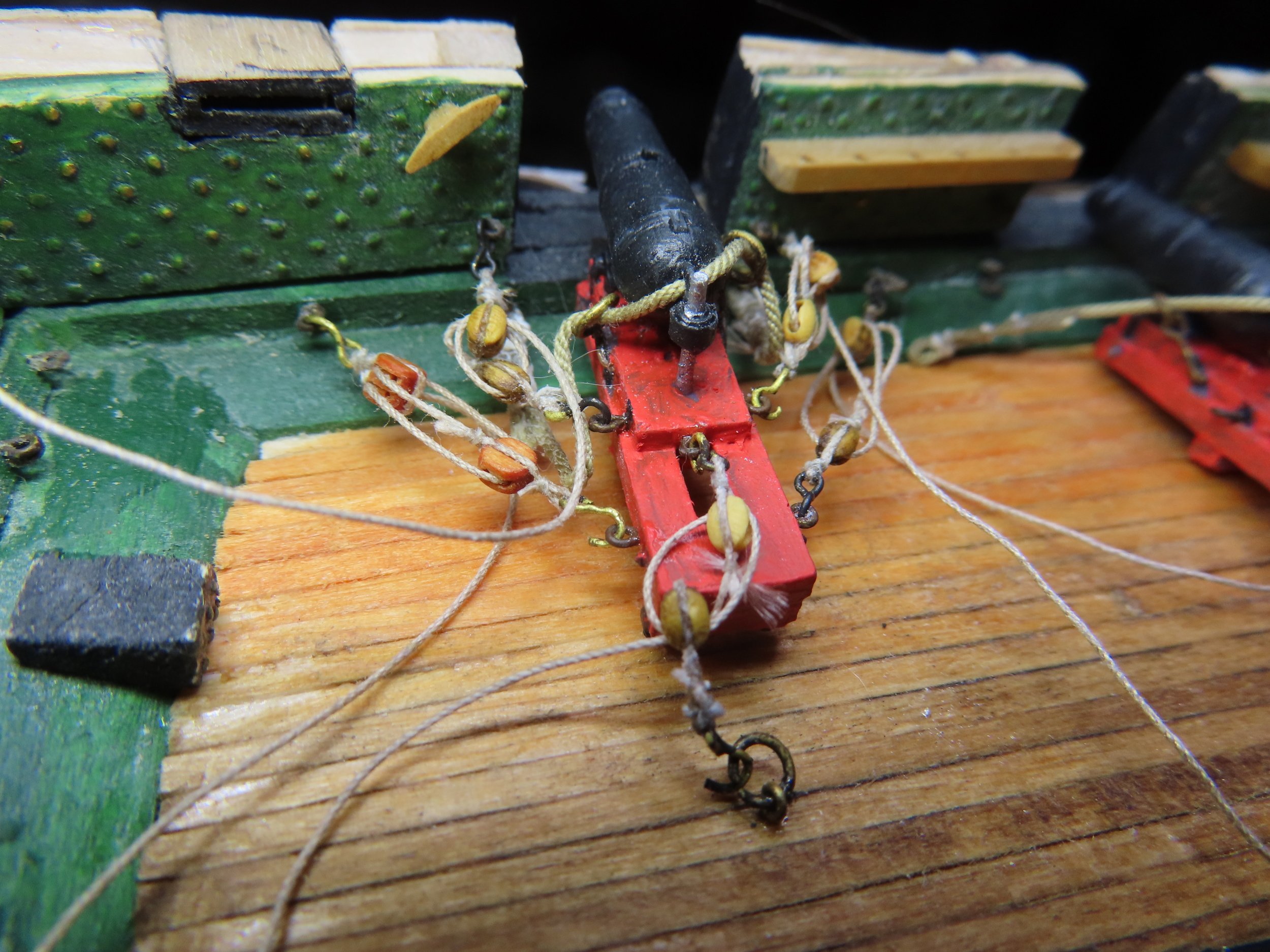 I have completed the gun deck on my model and followed the photos of the real ship for fastening the ropes and tackles to the bulwarks. I am doing the same thing for the spar deck now. It was a little tricky to attach the recoil ropes between two eyebolts and adding a pin to lock them in place, but I made it work. If you are going to seize your block and tackle directly to the bulwark eyebolts, DO NOT attach the eyebolts to the bulwark first. It will be a b*tch seizing the lines to the eyebolts on the model. Seize the lines to the eyebolts off-ship, then insert the eyebolt with the attached tackle into bulwark. Personally, IMHO, I believe the use of hooks would have been more practical on the ship for quick and easy replacement when it was required. Jon