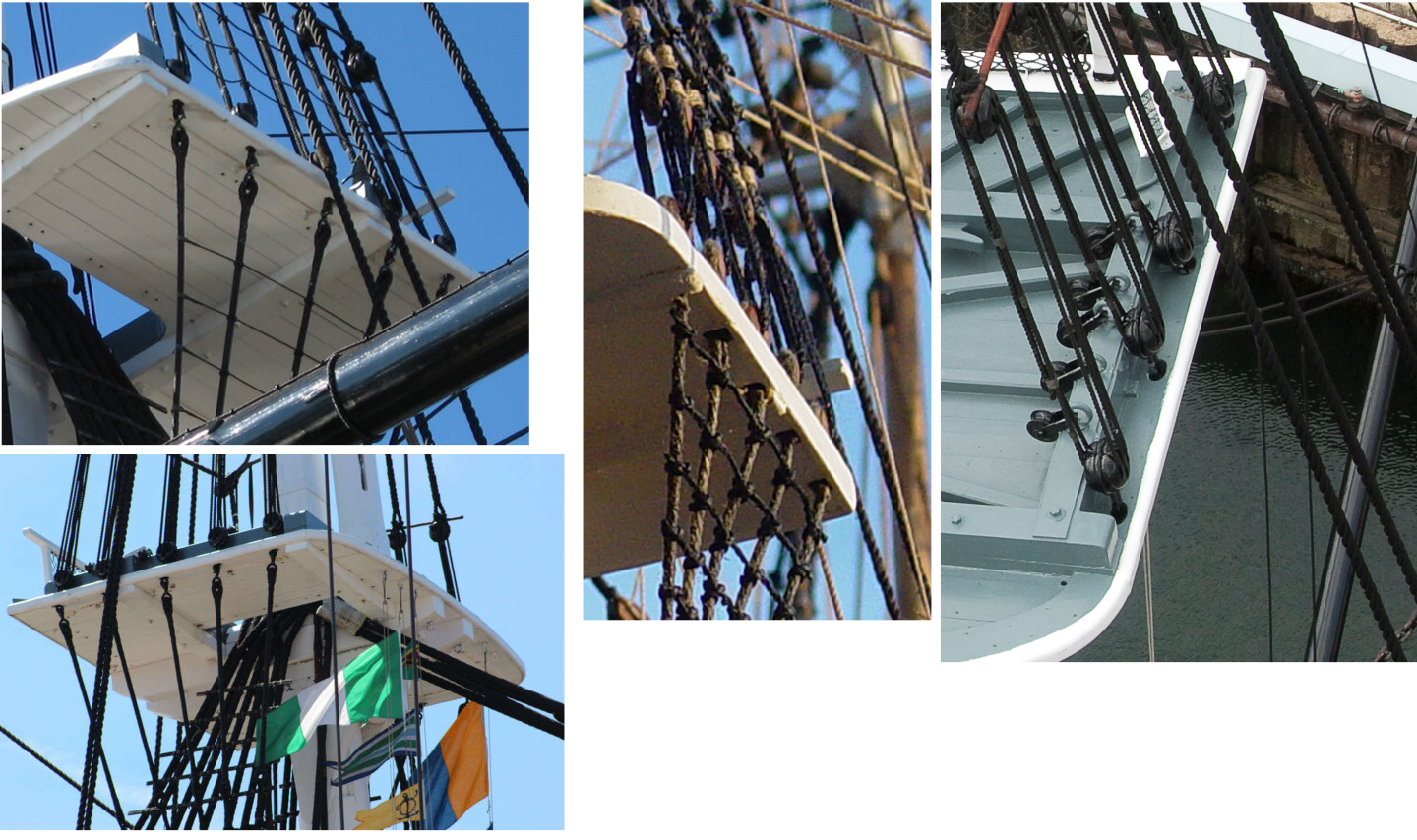 I can't speak for Mustafa's model but technically, the deadeyes on the actual ship are not attached to the tops at all; but pass through openings in the tops and attached to the Bentnik Shrouds below. Jon -