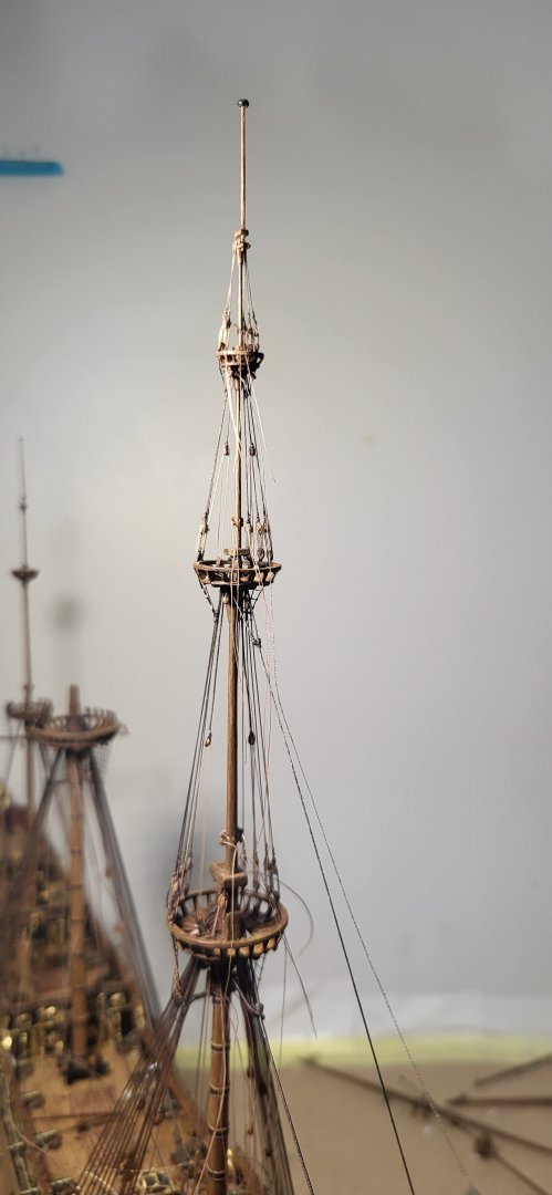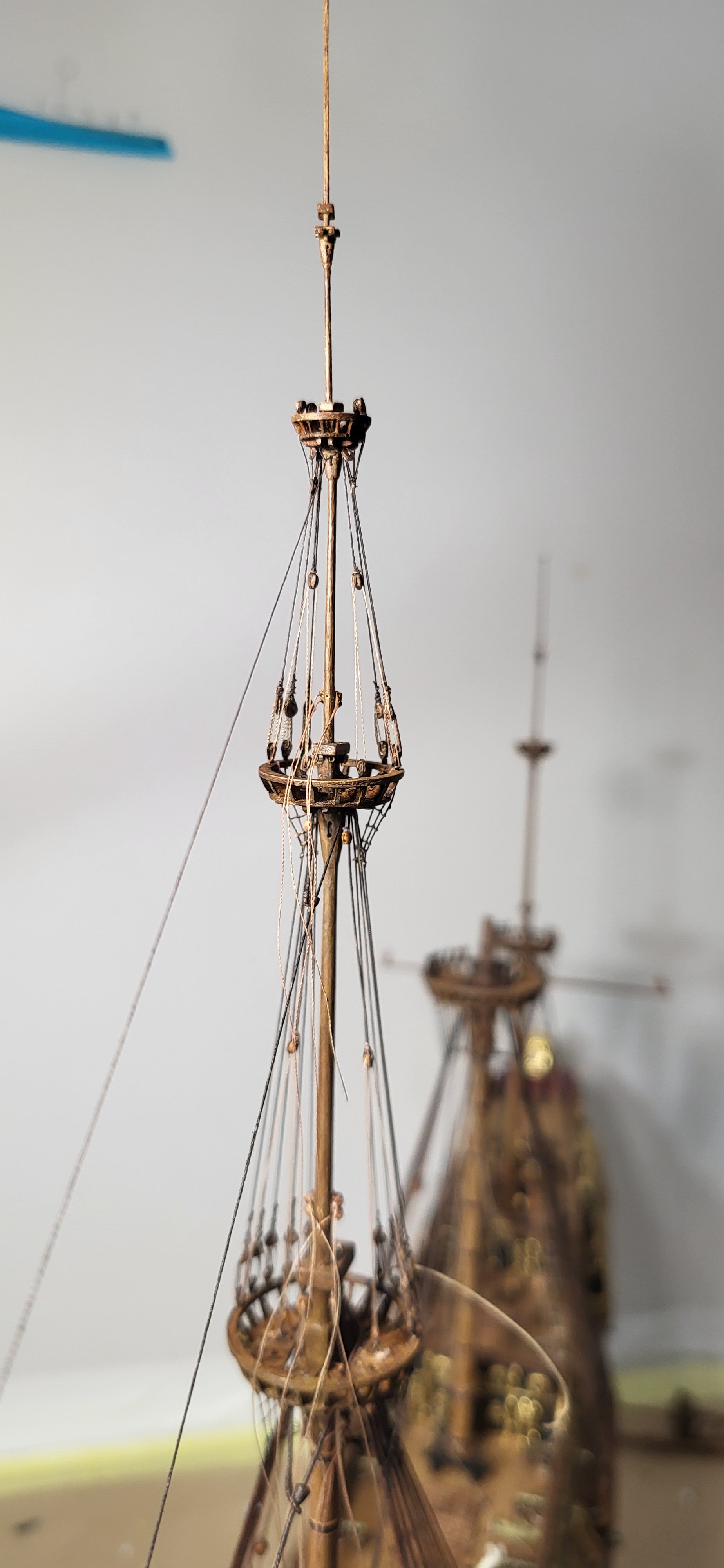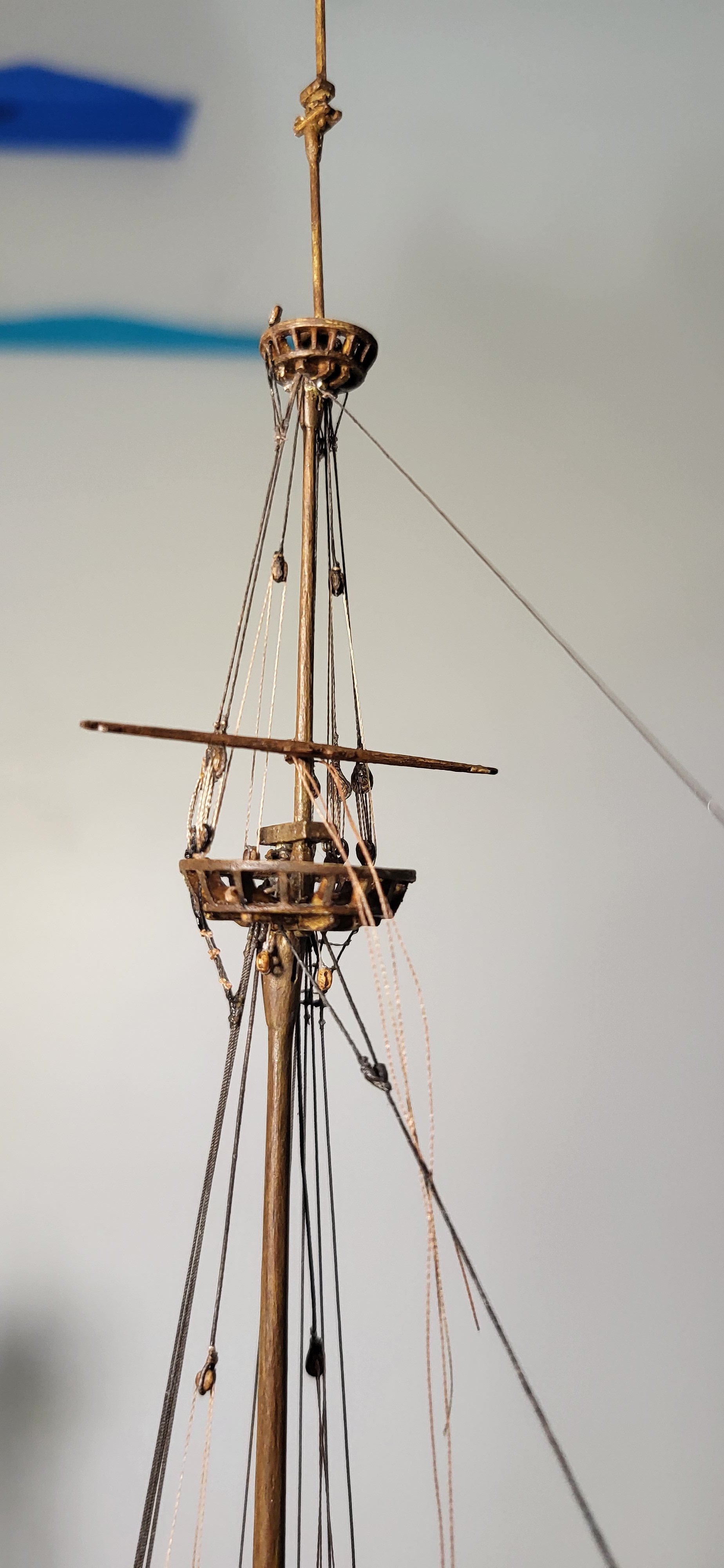 I'm continuing my climb up the fore mast with the completion of the top gallant shrouds, I've rigged the burton pendants as added detail, the royal mast shrouds are next along with finishing up the stays, keep in mind that top gallant top is smaller then a dime so rigging those shrouds and lanyards will be challenging to say the least. Thanks for looking. Michael D.
