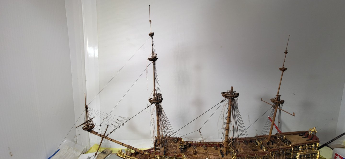 A little better than a third of the way through, and the backstays are looking presentable, I'm purposely introducing a slight upward pull on the stay so when I rig the remaining stays the lower stay should relax a little, but if not I'm totally fine with it as is. Also, I still need to complete the furling on the sprit mast topsail yard, thanks for looking. Michael D.