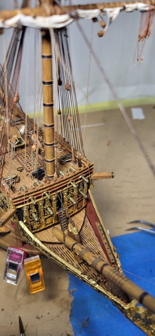 Thank you for the gracious compliment, Mark. A bit more progress on the spritsail rigging, I've attached the clews, rigged the clew lines and the 3 buntlines, all of these are led to the range and belayed. As much as I want to continue in this area, I need to shift my focus on attaching the fore course yard as the remaining rigging will be in the way. Michael D.