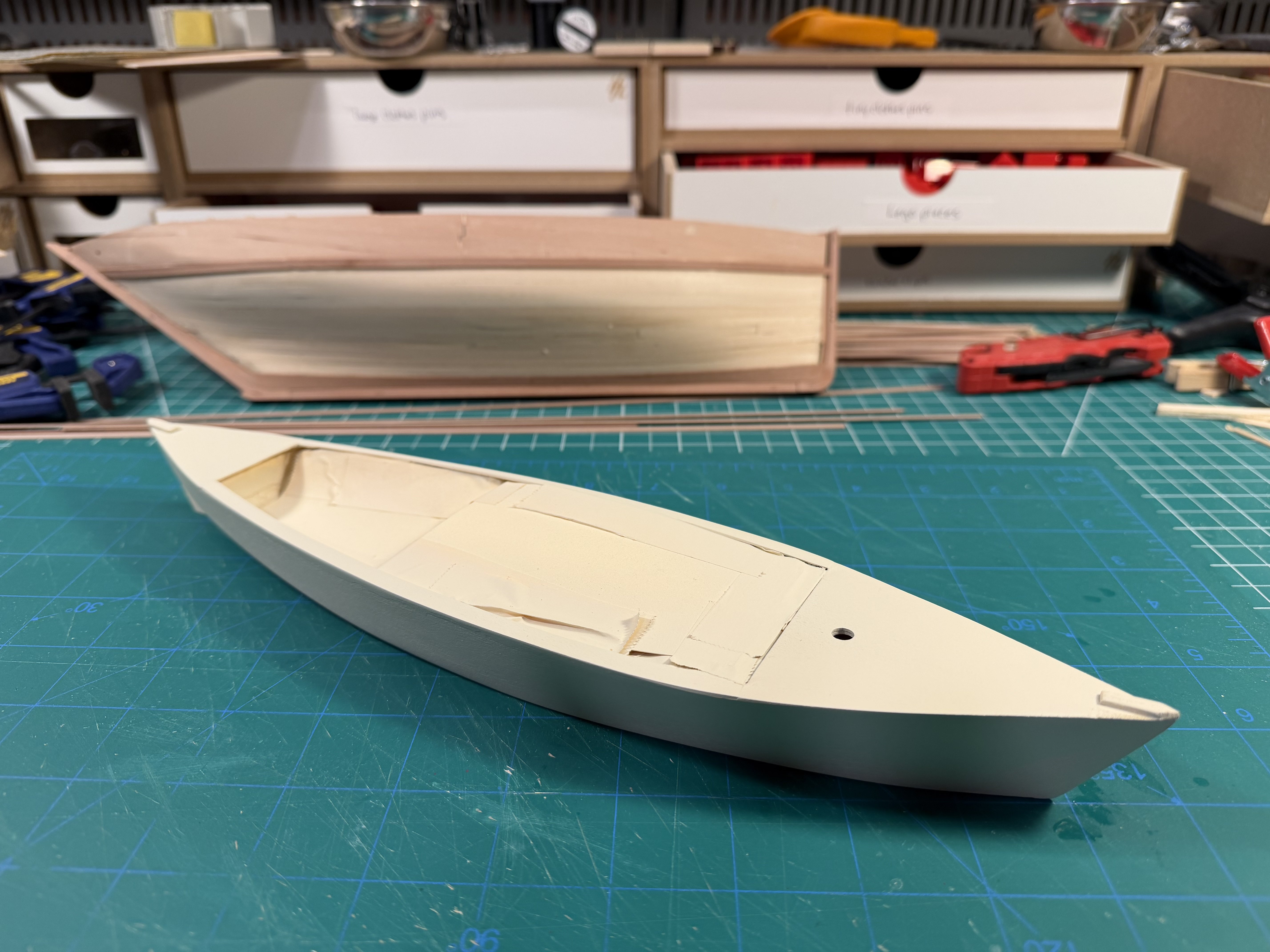 Been painting this one (while also painting my Scow Schooner). I’m doing the deck and upper sides a simple Off-White (Vallejo Air 71.270). Probably doing the bottom and bottom half of the sides a red shade, which I have not yet chosen. I might do a custom blend for that. The inside is largely done - with a few coats of Zinsser Amber Shellac - but it’s masked off.