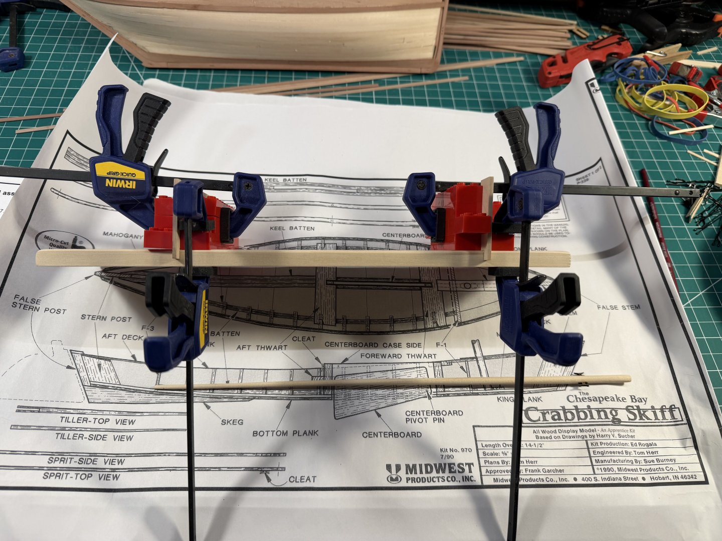 I end up doing a lot of slight repositioning of planks while adding various clamps - and can only glue to the plank edges - so I think superglue would be a real mess in my hands (literally and figuratively). I’m struggling a bit to make that turn. I shaped the bottom of the planks a bit at an angle, which helps. I clamp to keep the hull following the shape of the build structure and clamp to try to avoid too much clinker effect. I’m hoping it won’t be too much that a sanding can’t smooth out. We’ll see. I have no idea how I’ll clamp when I get closer to the bottom board. The kind of just says “add planks” with no pointers. I’m astounded people could build these before the age of the internet. Maybe that’s why there were probably more model clubs back then. Our “clubs” now are virtual.