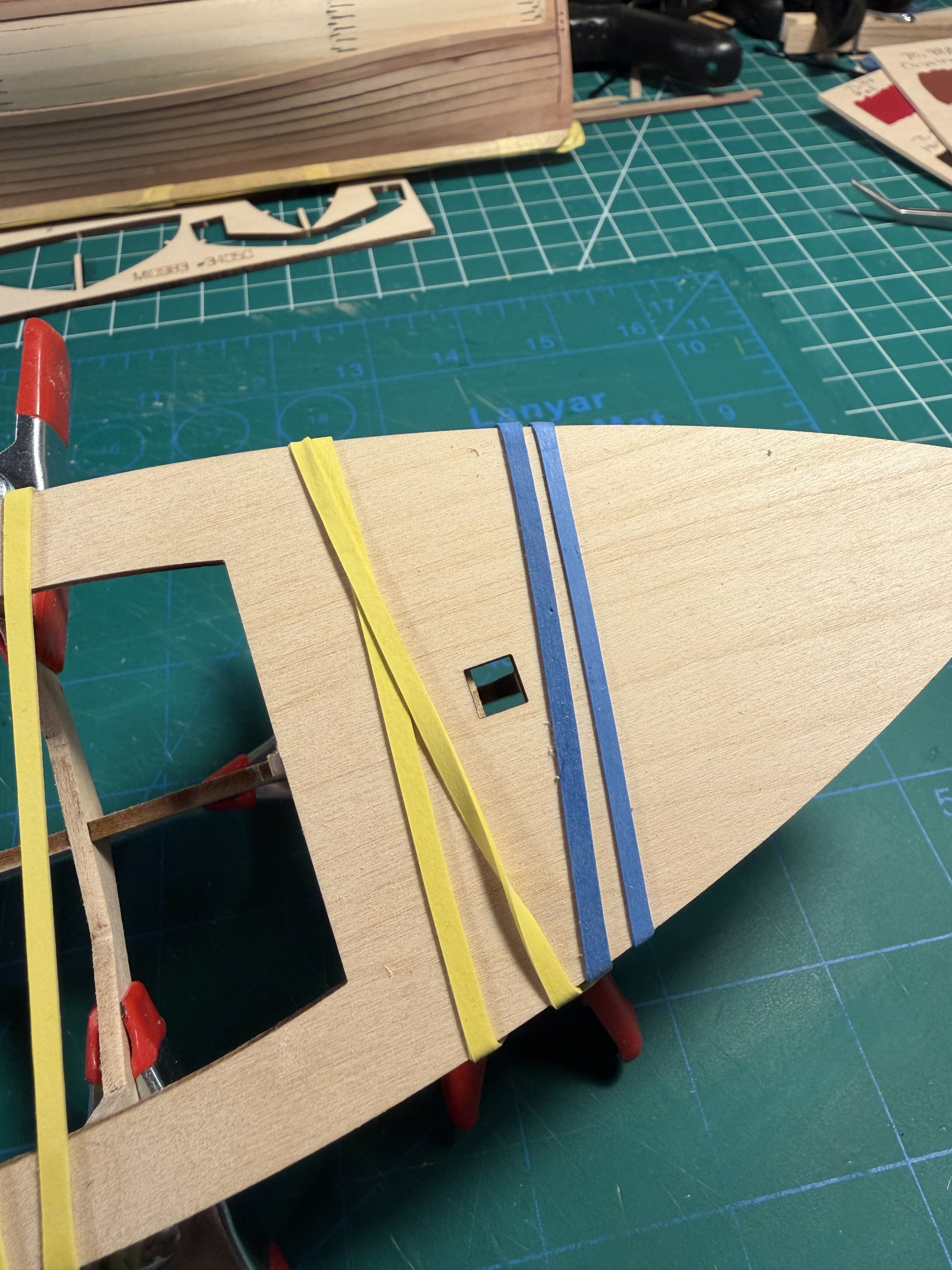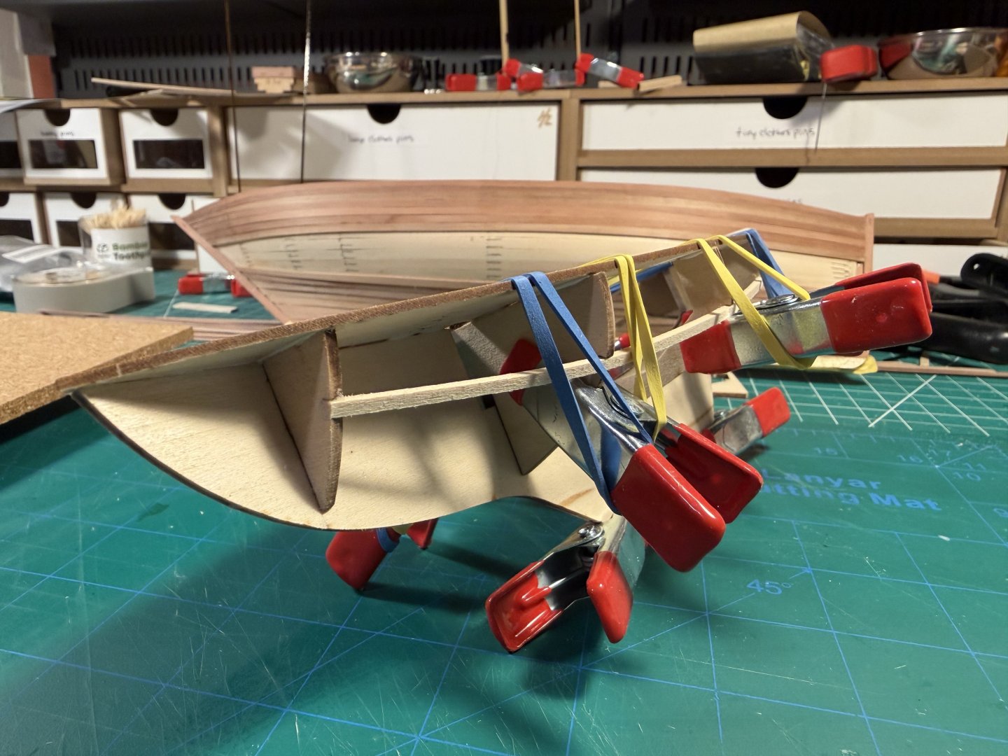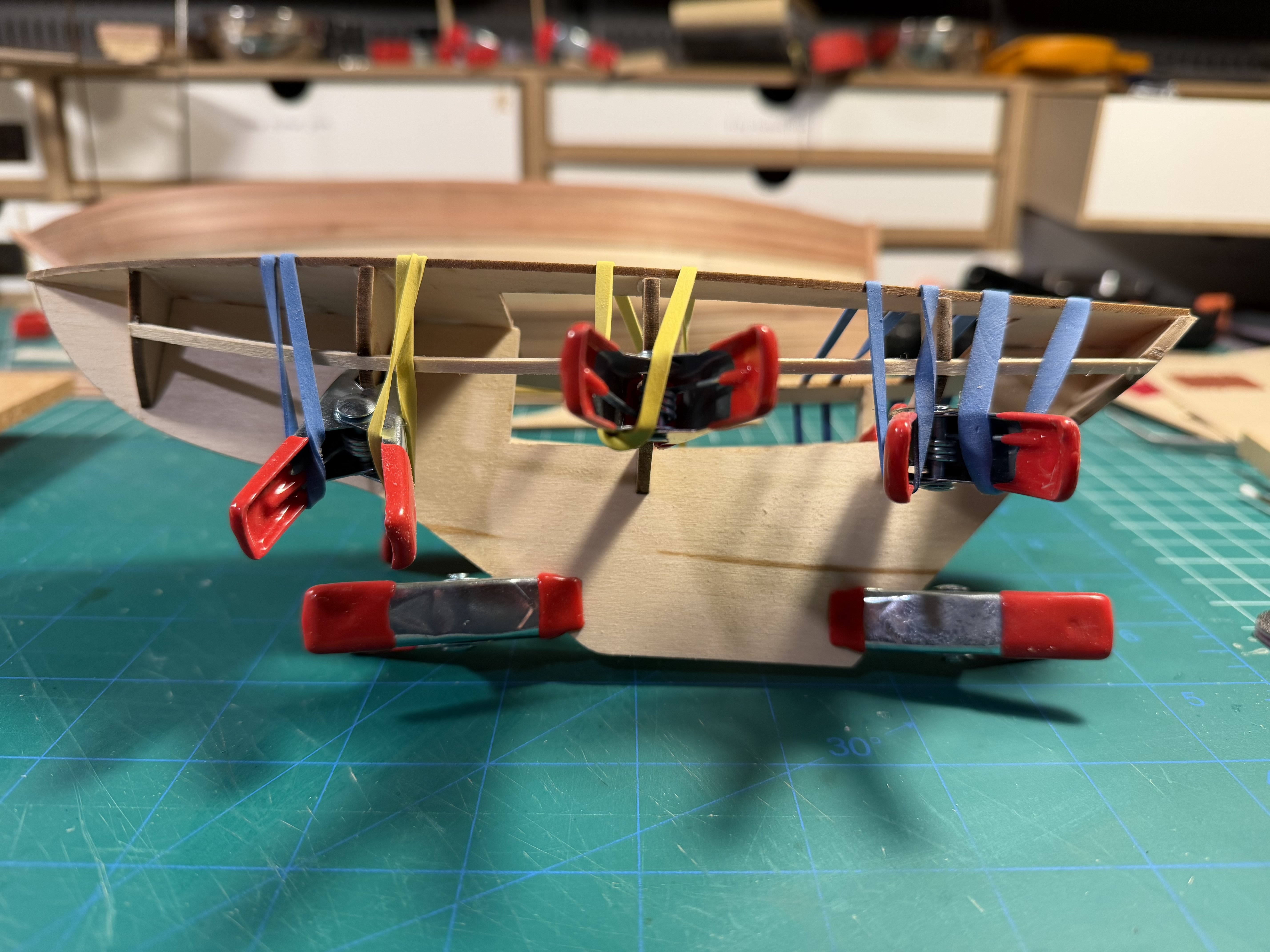 Adding the deck. I had to sand down the tops of the bulkheads a bit so that the deck laid flush along its length - the instructions obviously point out that you need to sand down the transom, but you also need to sand down over the length of the boat. It will have a bit of a camber. You need to make sure the hole in the deck is lined up with the mast step, even though that means that things don’t line up quite right in the interior seating section. It would have driven me nuts except that I saw that Olha had the same issue in her build. This will take some repairing later. You need to do some creative clamping to hold the deck in place flush with the bulkheads to glue. A combination of clamps holding rubber bands that wrapped around the deck worked for me. After securing, I added some more glue underneath for extra strength - a trick I learned from Vanguard model instructions.