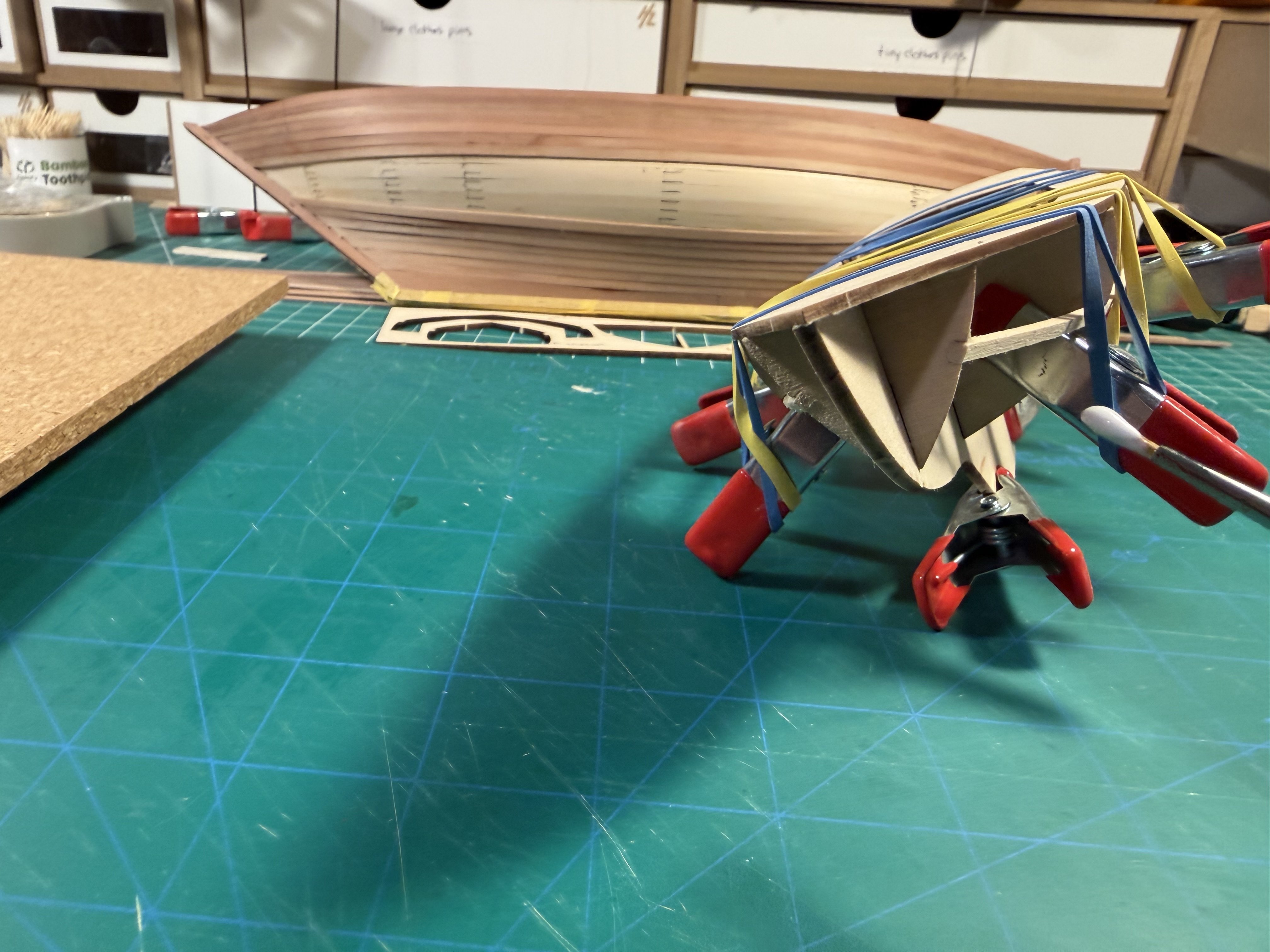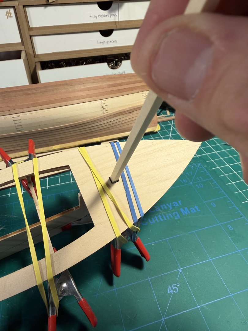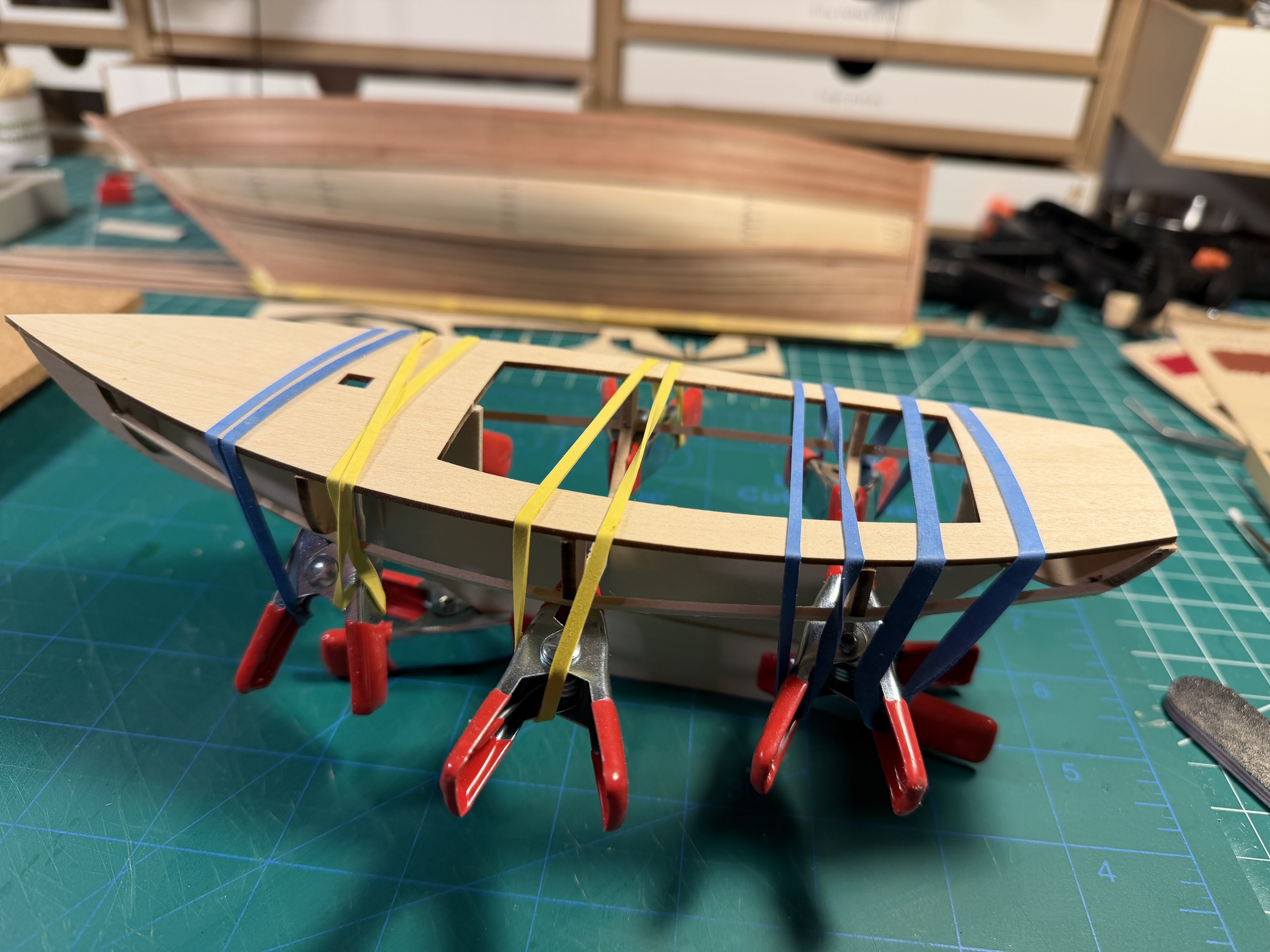 Adding the deck. I had to sand down the tops of the bulkheads a bit so that the deck laid flush along its length - the instructions obviously point out that you need to sand down the transom, but you also need to sand down over the length of the boat. It will have a bit of a camber. You need to make sure the hole in the deck is lined up with the mast step, even though that means that things don’t line up quite right in the interior seating section. It would have driven me nuts except that I saw that Olha had the same issue in her build. This will take some repairing later. You need to do some creative clamping to hold the deck in place flush with the bulkheads to glue. A combination of clamps holding rubber bands that wrapped around the deck worked for me. After securing, I added some more glue underneath for extra strength - a trick I learned from Vanguard model instructions.