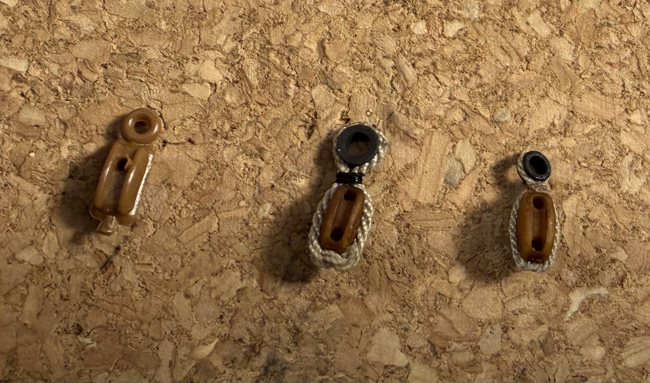 Take 2: left: original plastic piece from the kit middle: first attempt with thicker rope and a larger thimble (and a black seizing) right: second attempt with thinner rope and a smaller thimble (and a tan seizing)