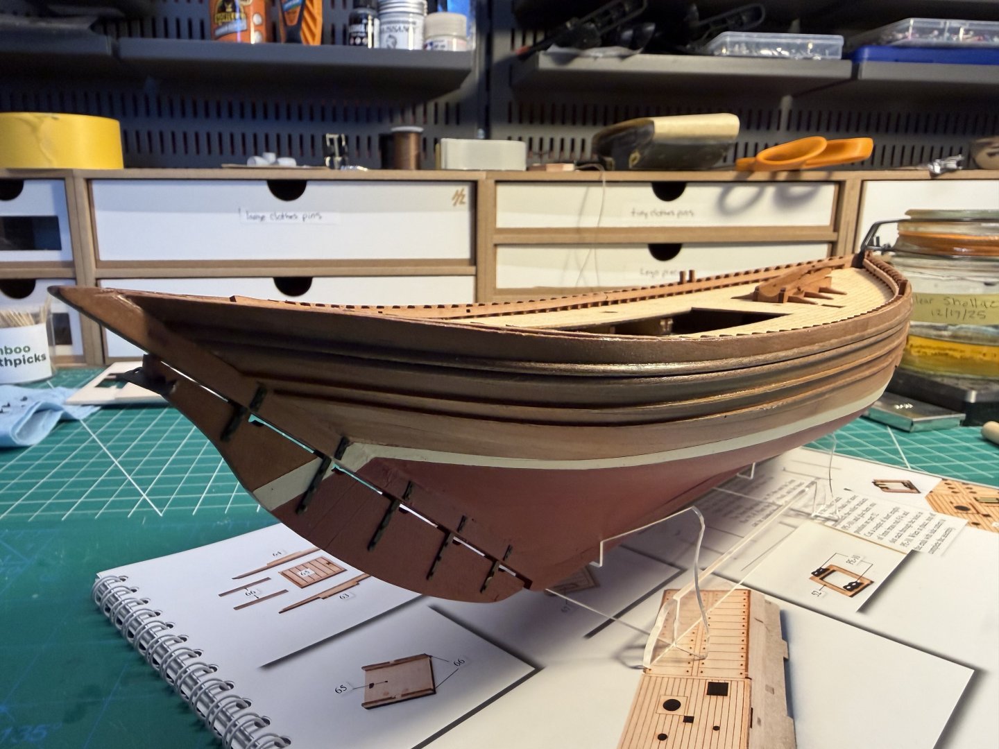 After sanding the hull, I decided to paint the bottom and leave the top unpainted and shellaced. Here I have also added the rub rails and I’ve worked on some pieces that will be added to the deck. (I used a clear shellac, which nicely darkens the pear just bit.)