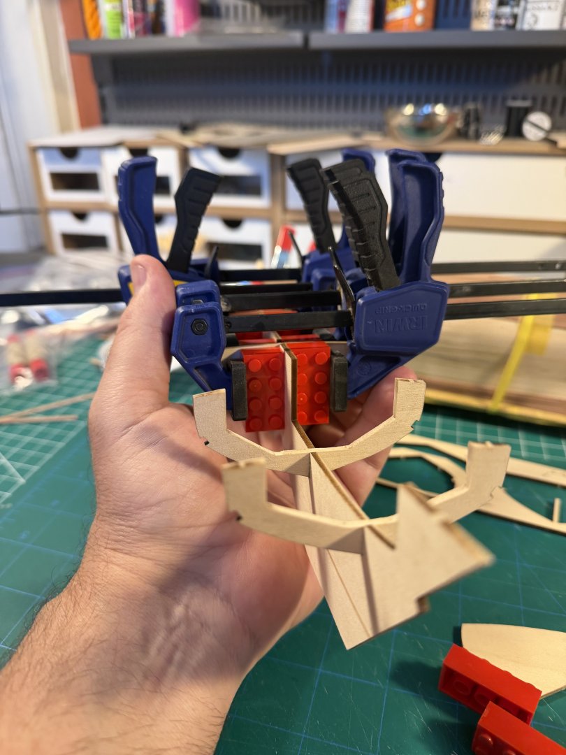 Plank (singular) glued in and secured. It’ll dry overnight. I use rubber bands and hair clips to maintain the curve to the center board and use pieces of scrap plank and clips to try to minimize the clinkering a bit.