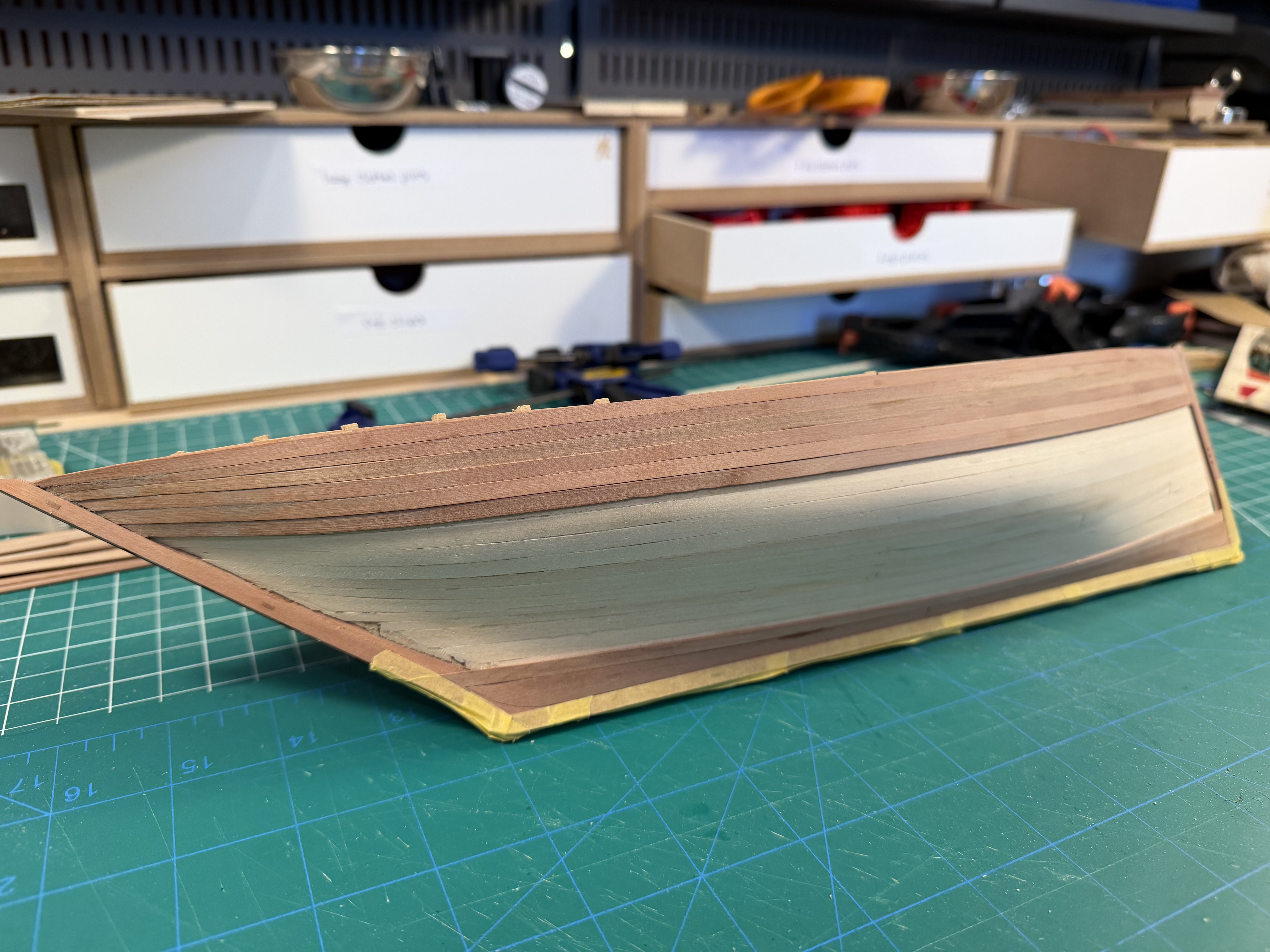 This is definitely continuing to be a slow and challenging planking of this small boat. It has been especially challenging making the curve around the bottom but it’s getting there. Thankfully the planks are thick enough that they’ll allow for a good bit of sanding.