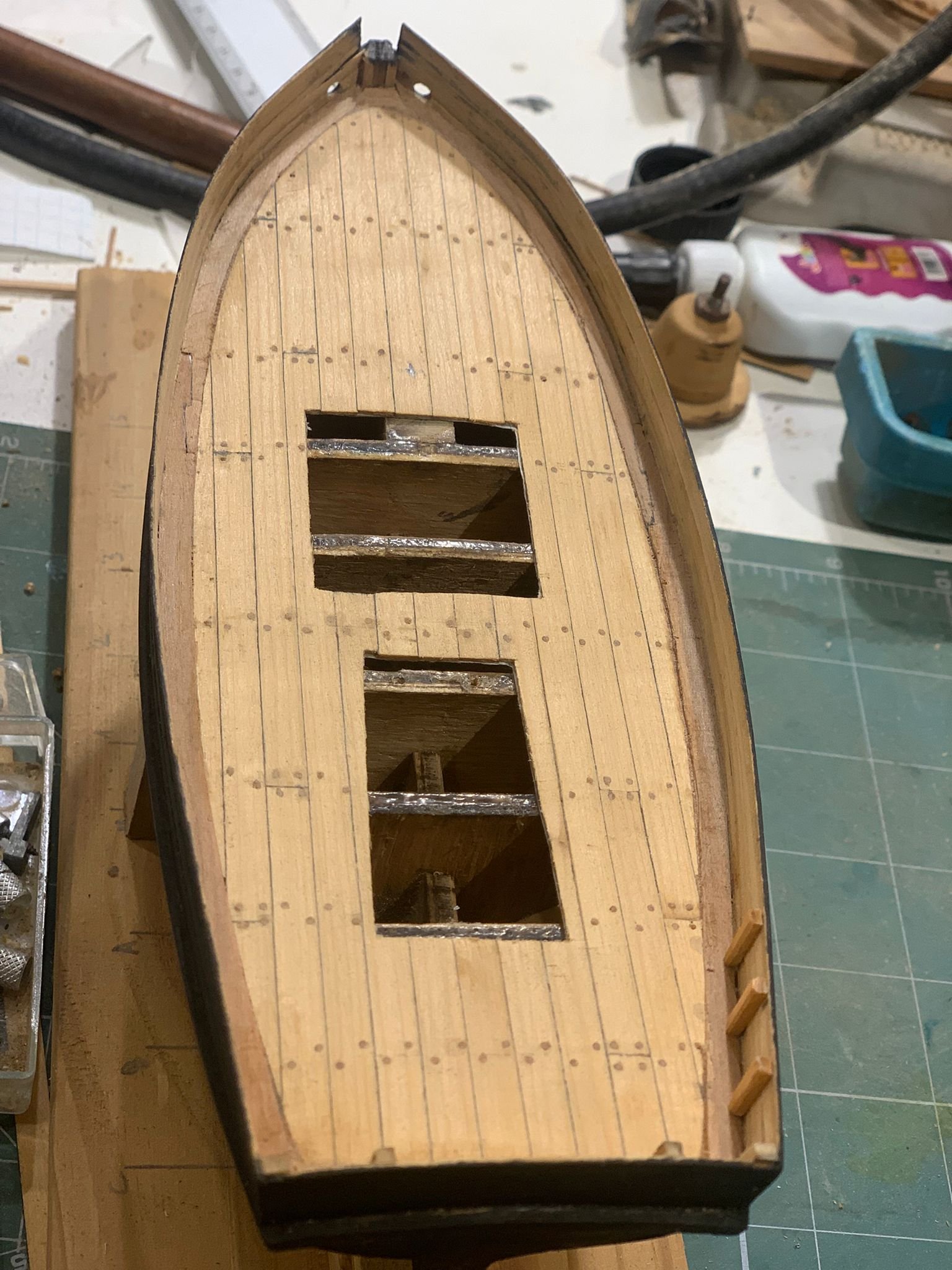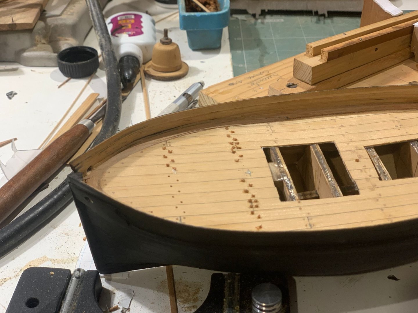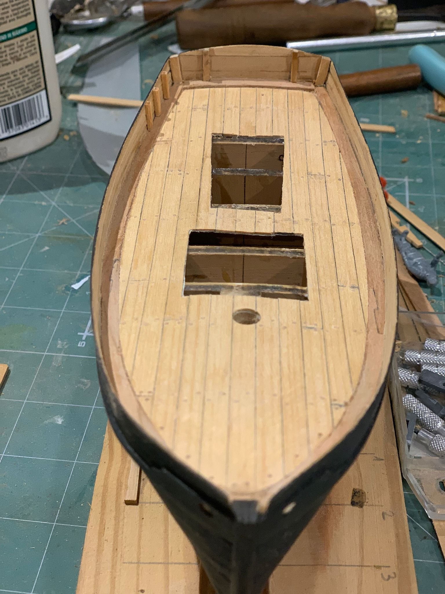 Hi shipmates! So, i painted the hull completely black, i saw that in various models and i thought it would be a nice effect to give to the model. I used shoe ink to give the color, and then i applied some coats of matte varnish, i liked the effect. I started the deck, but i will show that in the next time, i still don´t have good pictures. So, i hope you like it. Ah, almost forgot, a carpenter showed up, one of the Commander´s helpers. Chapter 4. Colouring the hull and fittings Next, i will show the deck plancking, still under construction. I hope you like it. See you soon. Giorgio