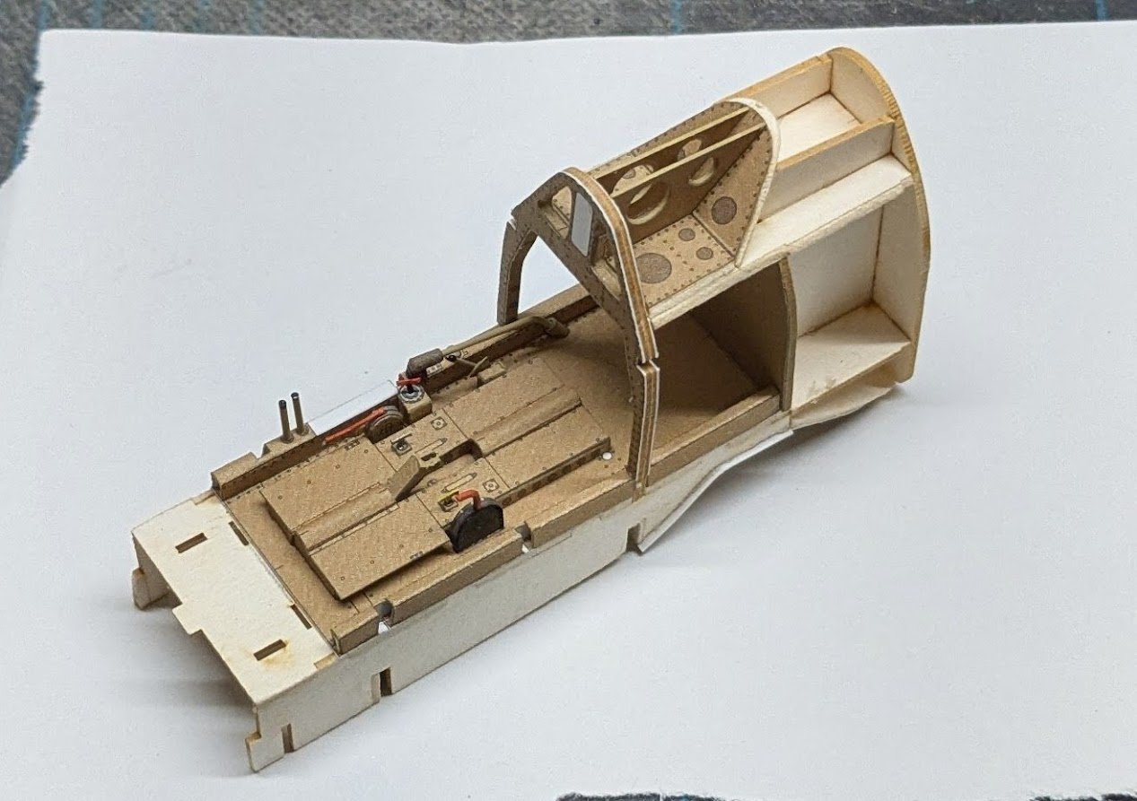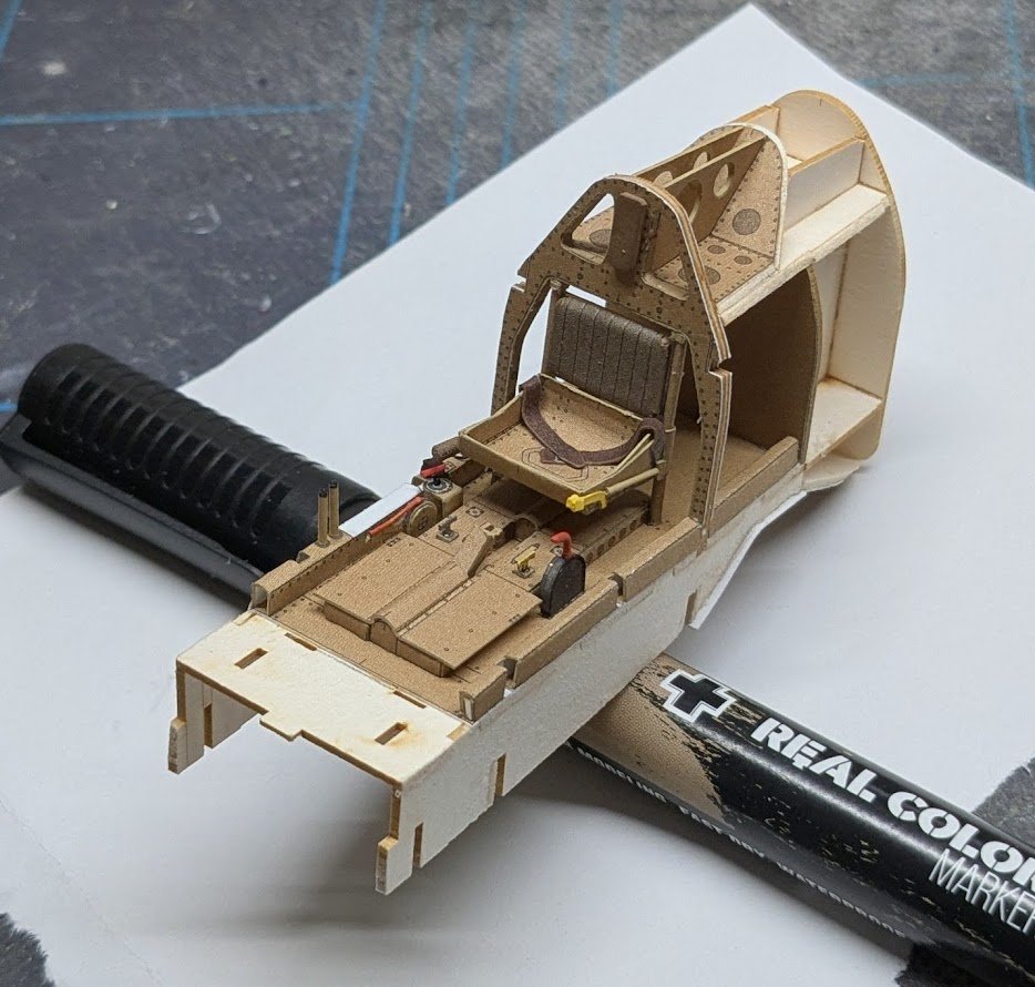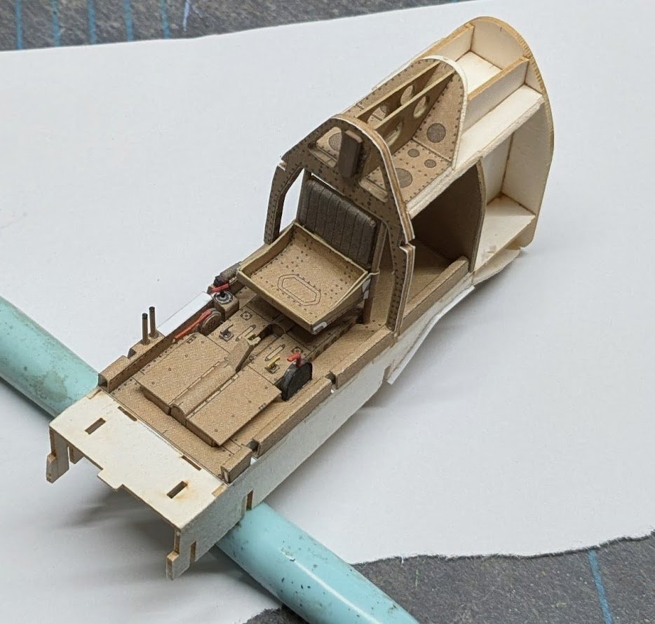 Working on the seat. This is just a test fit. It's one of the more complex seats I have worked on. The seat itself has brackets that attach it to the support poles instead of attaching directly to the poles or to a bulkhead. The bottom portion of the seat, where the pilot's chute would sit, is a bucket within a bucket; I could not get the inner bucket seated completely inside the outer bucket, a fault that you can see in the photo. I touched up the portion of the inner bucket that protrudes. This will of course be virtually invisible in the cramped, finished cockpit. I still have some fiddly bits left to do.