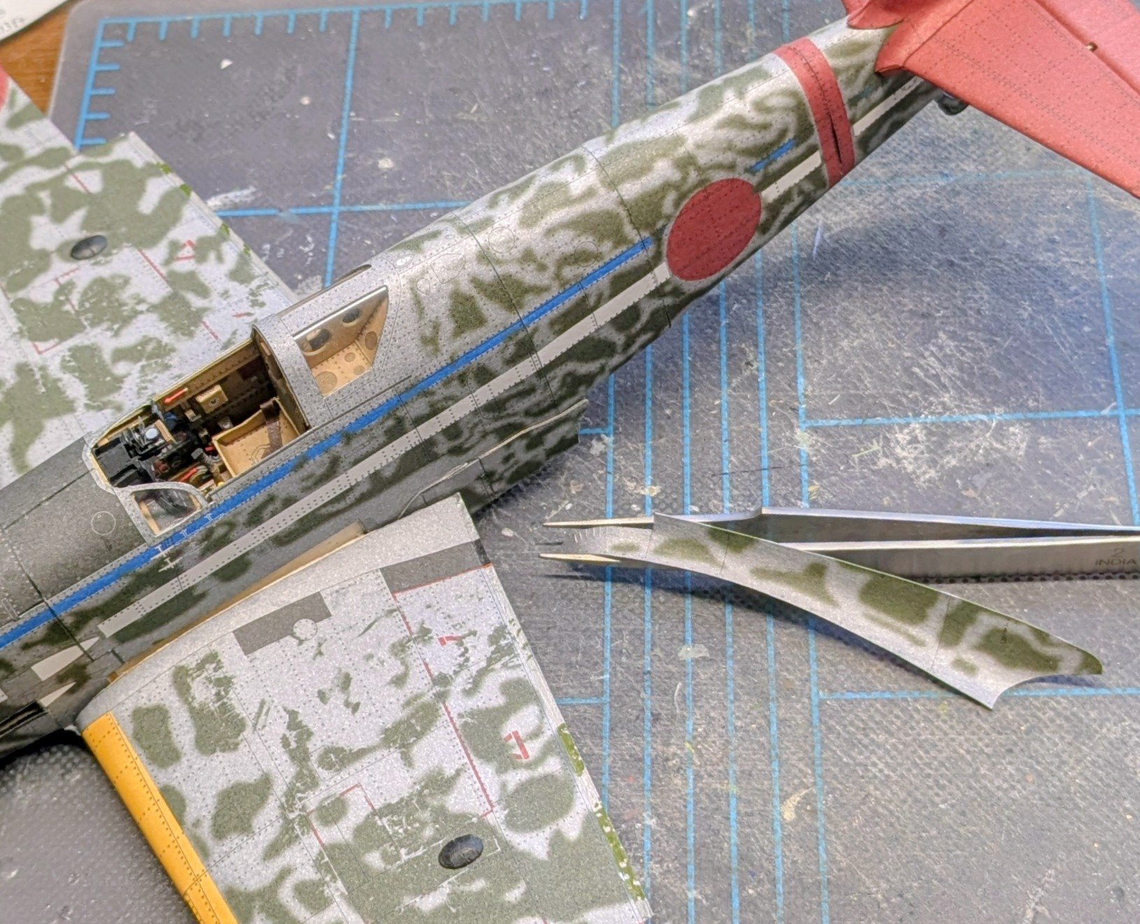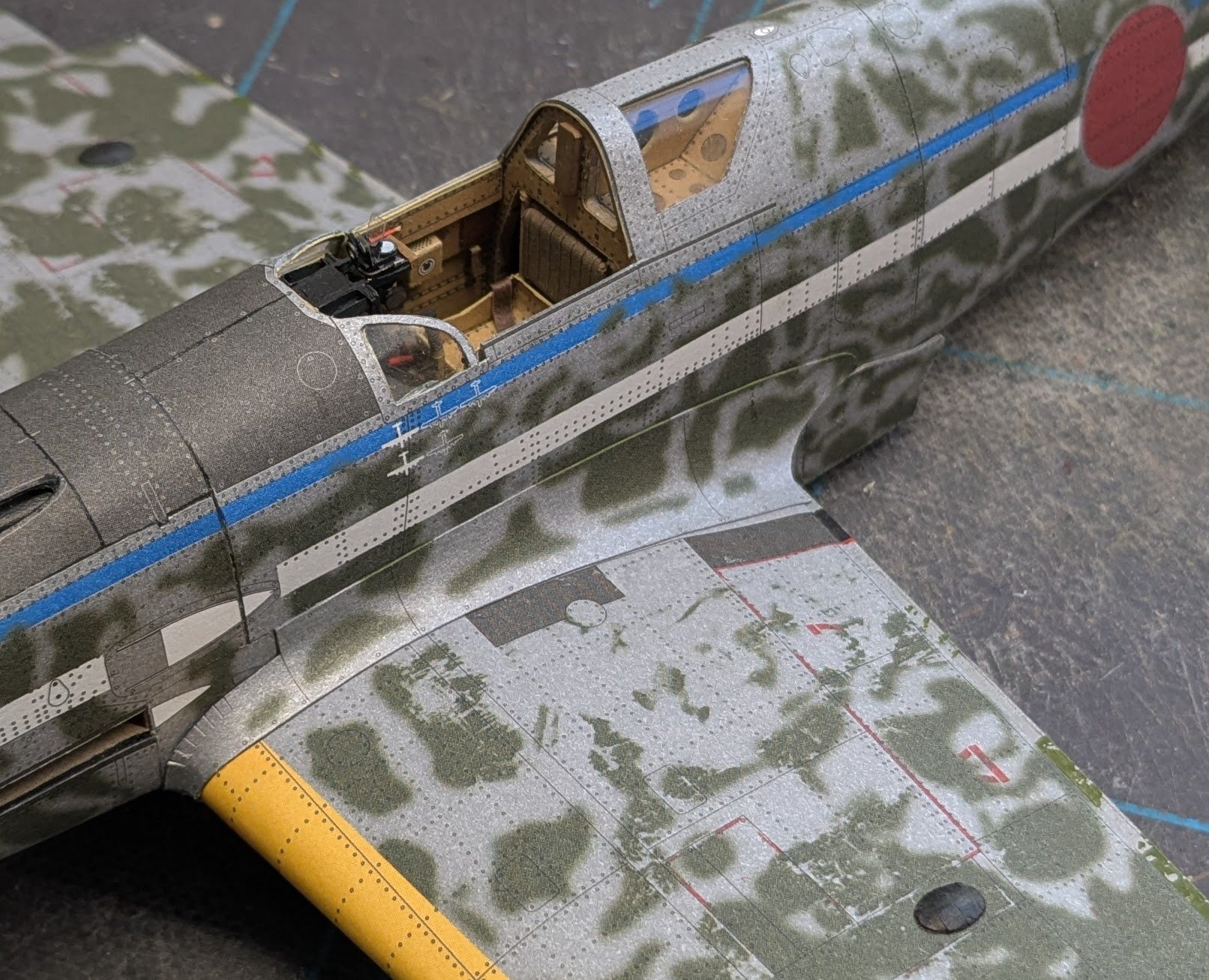 I started skinning the left wing yesterday. First I glued the framing to the lower wing skin, paying close attention to the instructions that the frames should sit 0.3mm forward of the aileron cutout and 0.7mm forward of the flap edge. Seriously? A tolerance like that is virtually impossible to measure and mark with the tools I have on hand. So I guestimated. When I was ready to glue the top side down, I discovered I could not get the flap edges to meet. Then I remembered that I had forgotten to sand the wing framing before skinning -- doh!! I was still able to do some sanding at this point, but despite all of my efforts, I could not get the edges to meet, so I decided to go with whatever result I could manage. Ultimately, the top edge came up about 1.5mm short of meeting the bottom edge. So I did some cosmetic surgery with my paint markers. The greens don't match exactly, but the idea here is to camouflage the surgery as best as possible. I have to keep in mind that this is an artistic rendering of a Ki-61 and not an actual Ki-61! Anyways, here are the before-and-after pictures: Cheers!