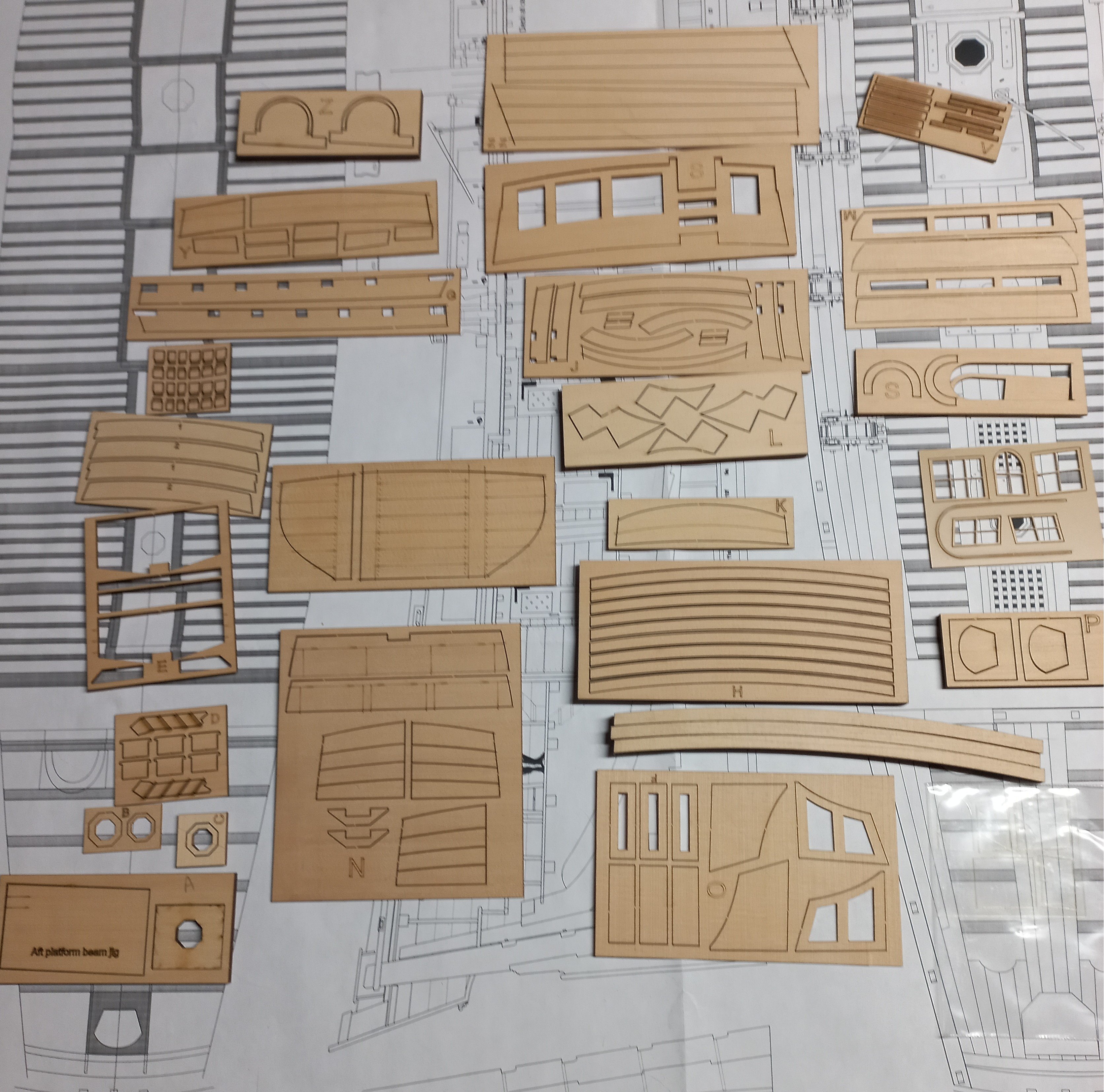 Chapter 5 I received Chapter 5 yesterday and started on it. I show below the parts received: I recognize most of the laser cut sheets as discussed in Chuck's log. Sheet Y seems to replace the second layer of the upper bulkhead S (the part with the column etched on it in Chuck's log). The monograph of Chapter 5 should clarify that. Anyway, a lot of precise work ahead of me.