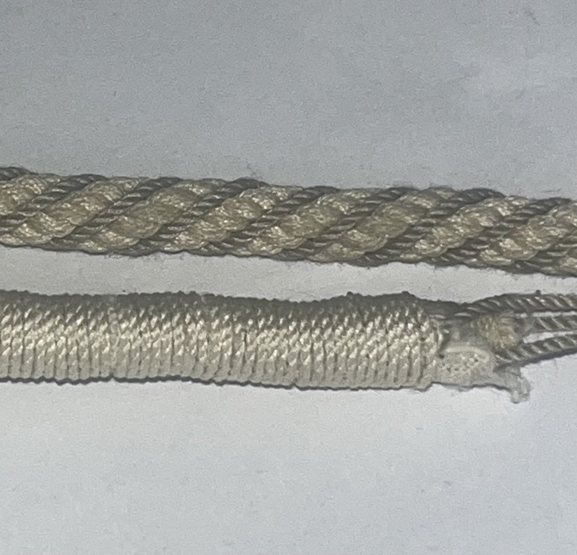 New copy of Levers book arriving today as I was previously working from an old online version which doesn’t have the same text quoted above. I’ll make a final decision today after reading. I’m thinking if Keckling was effectively worming cable with large rope this could adversely effect the carefully calculated physics of the cable by significantly increasing the weight. If it was laid in open fashion instead of every cantline this would reduce the added weight. Ring wrapping done but I’m still mot sure on thickness. Seems a bit too stout. -