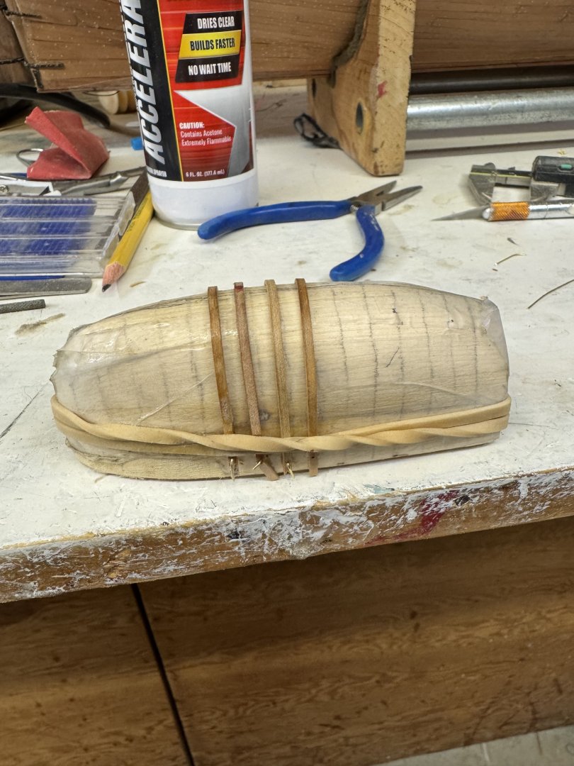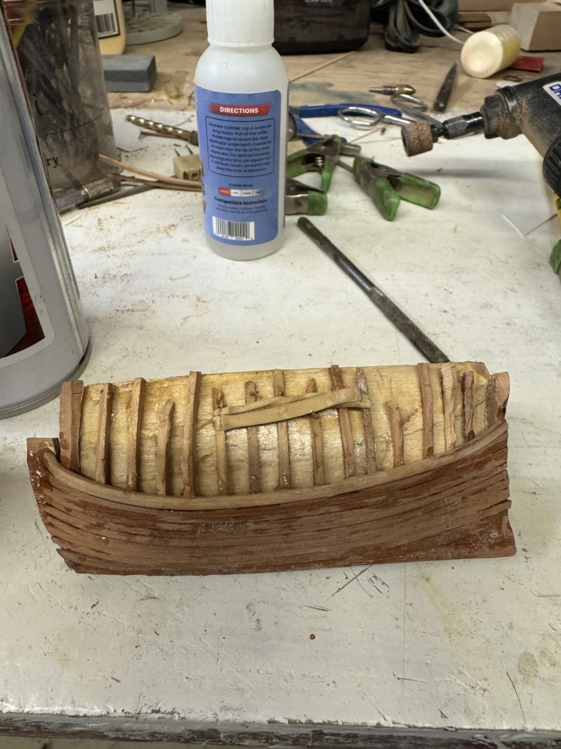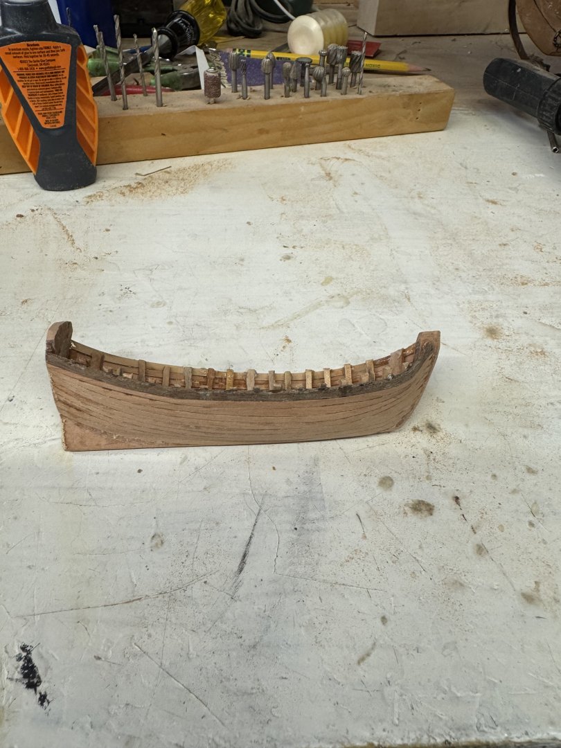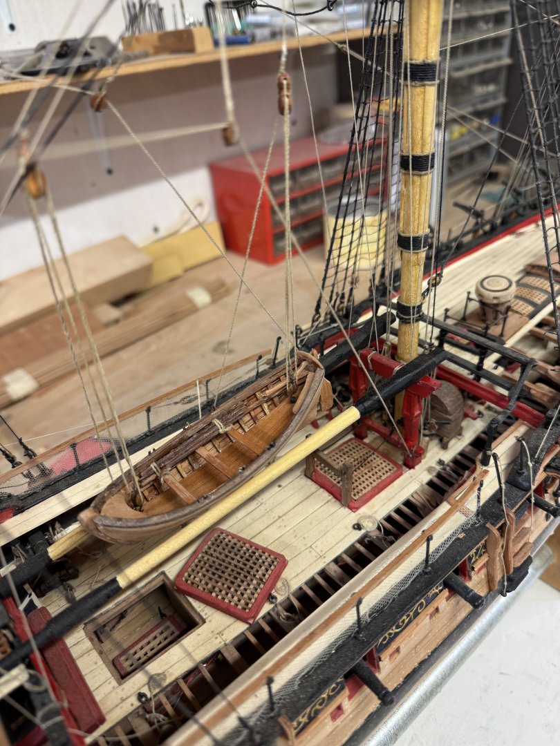 With the topgallant rigging complete, attention was directed to the ship’s boat. I had a plug left over from the same task on the Gros Vendre build, so that was shortened and the stern modified. Midship frames were dry steam bent and the rest sawn with the lot glued to the keel with.CA. I used Swiss Pear for the bulk of it, with the shear and cap in Walnut. It was then glued amidships to the spare top masts and rigged to the mainstay pendant tackles. That pretty much concludes the build except for repairs, dusting and paint touch up here and there. Final photos to follow.