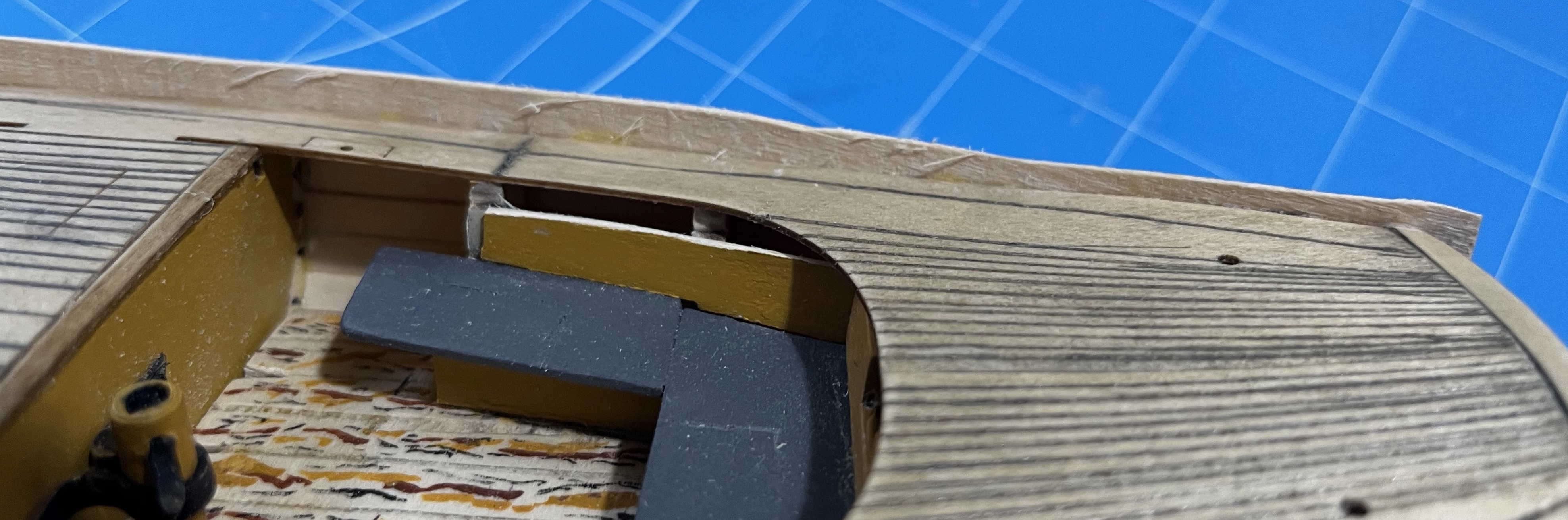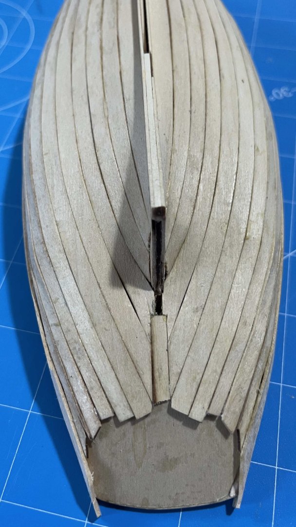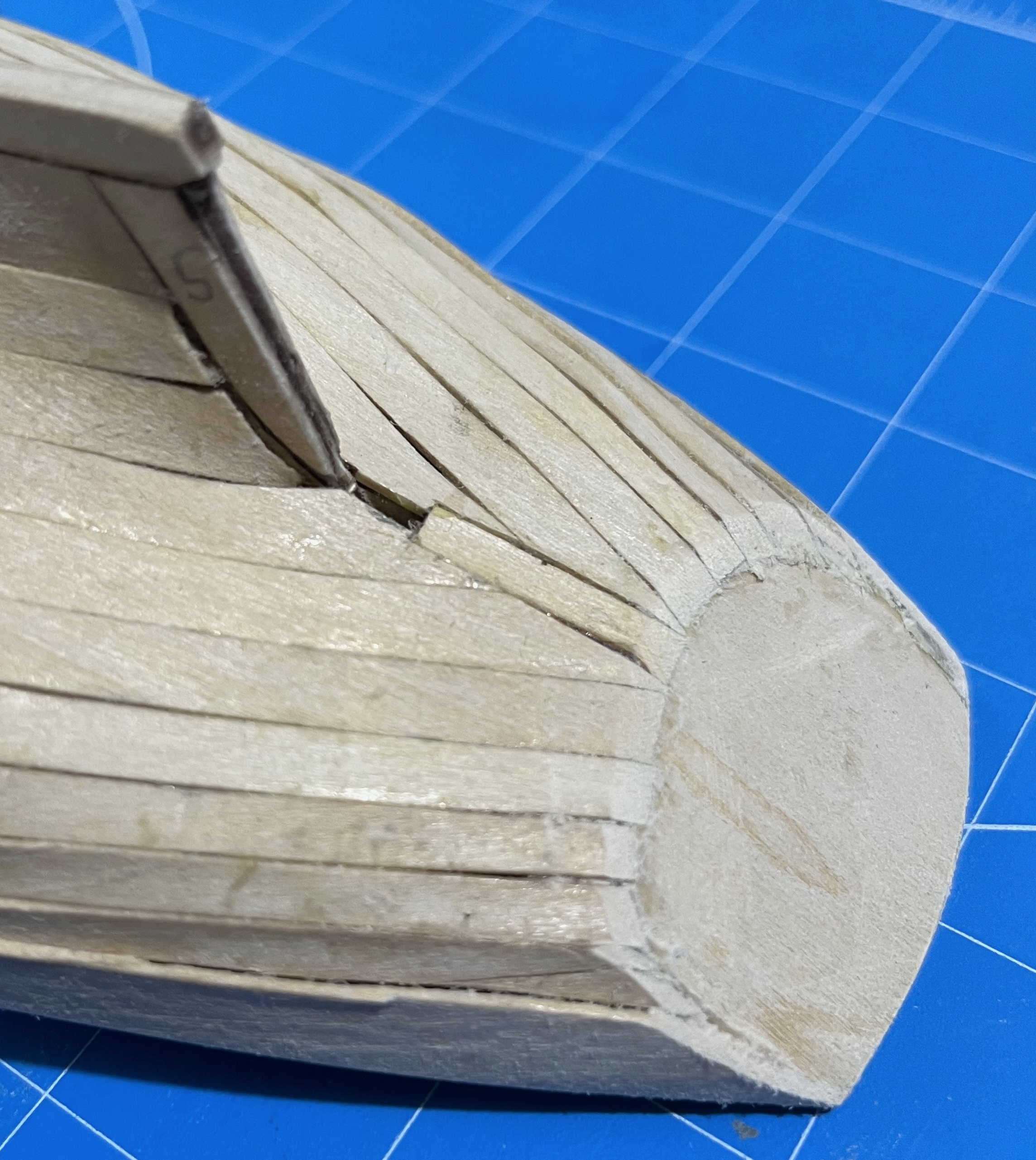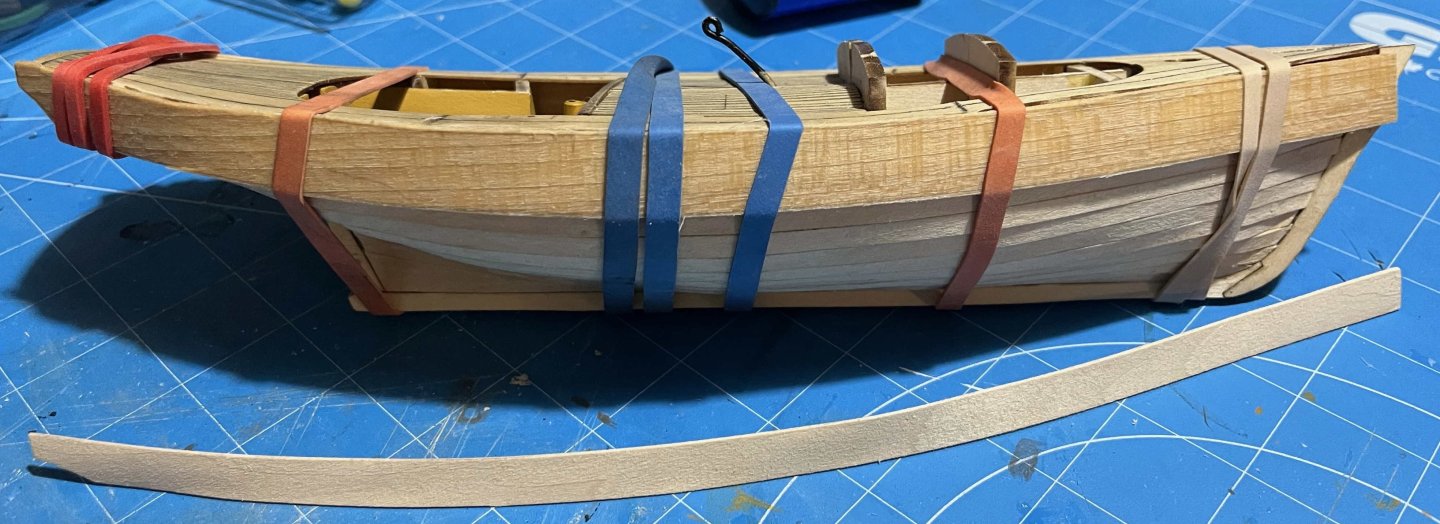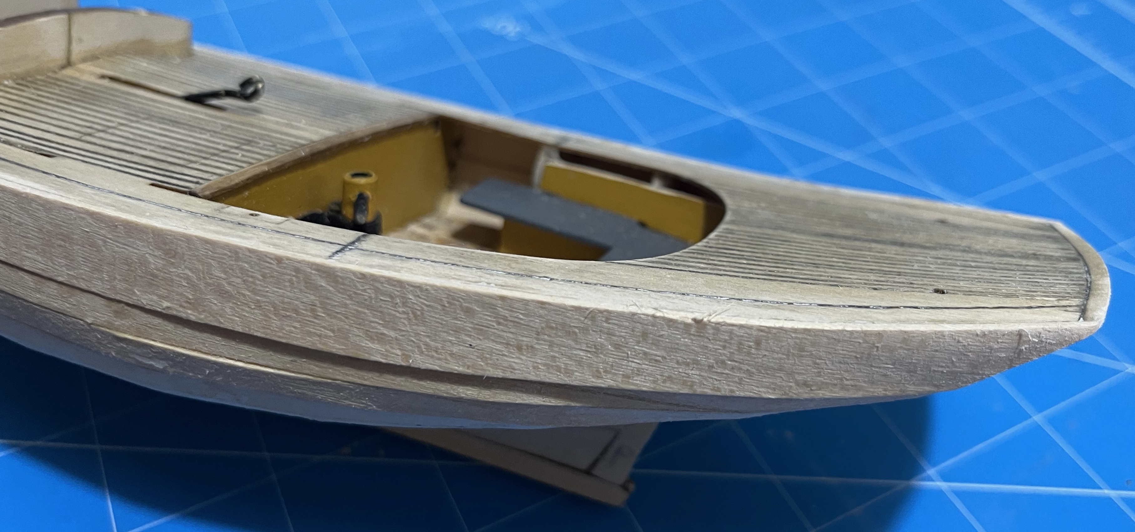 Planking completed -- though it did not go easily. My progress was slowed more by a sudden deadline (as in: a deadline for the work I get paid to do 😖), more than by the challenges of the model. Still, I did move ahead and Strake 9 went on well enough, though a slight slip at the transom induced me to release the glue and try again. That only made things worse. The big problem came when I checked the gap between Strake 9 and the deck. As I had begin to fear, it was wider than the kit's sheerstrakes, especially on the port side, where the sheerstrake was a bit more than 2mm too narrow amidships. That should not have been possible, especially as the kit is designed to allow some excess material. I can only guess that I pressed the wet strakes together so tightly (while they were clamped for drying) that I squashed them a little. I bent the kit-supplied sheerstrakes anyway and toyed with the idea of adding a thin band between them and Strake 9. That looked like it would lead to an ugly mess, so I decided to make new, wider strakes, with the cut-out of the kit part as a template. While I was at it, I made them much wider (rather than find them not wide enough) and added some length too, as my muddled stern projects a bit further than intended. Even the standard parts are too wide and too long to get replacements out of any scrap left from the kit nut, back while working on the dory and pram, I had bought a length of ModelExpo 1/32 basswood sheet just in case a need arose, so I could use that. All went OK though to the shaping and drying phase: That's the kit-supplied sheerstrake in the foreground and my replacement on the hull (though set low, to prevent the rubber bands from warping the top of the strake). It was only with the new wood wet that I saw how different it is from the kit material: Much coarser grain and prominent rays. With the sheerstrakes bent and dried, I confronted issues that the instructions skip over. The stem rabbet does not follow the profile of the stem but has a sharp turn to vertical where the hood end of the sheerstrake fits. The deck, however, carries on past to meet the stem where the rabbet would be if there was no angle. I trimmed the deck, then shaped the end of each sheerstrake, mostly by trial and error. I was also unhappy with the fit of the sheerstrakes far aft, so I glued them in place from bow to midships, left the model for the glue to fully set, then got to work with a rasp -- mostly waiting Bulkhead 9 but also the lower edge of the starboard sheerstrake. Perhaps I should have re-wetted the strakes but I managed to get everything glued in place, even though it needed a second go with glue in a couple of places. All of that left me with a fully-planked model but certainly not a nicely planked one. The sheerstrakes projected above the deck, as I had intended: but worse was the general mess that I had made of the job: I am still hopeful that I can make an acceptable end result, with plenty of filling and sanding, but it is not what I was hoping for! (Just have to keep reminding myself that this is supposed to be a learning experience 🙂) I decided to trim the projecting plank, before I caught it on something and caused damage. With plane and sanding stick, I brought the sheerstrakes down flush with the deck edge, then turned to saw and again sanding sticks to get the after ends of the planking flush to the transom. With that, the current state of development looks like: Much, much more to be done but it will have to wait until tomorrow! Trevor